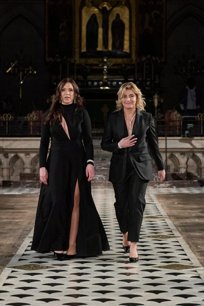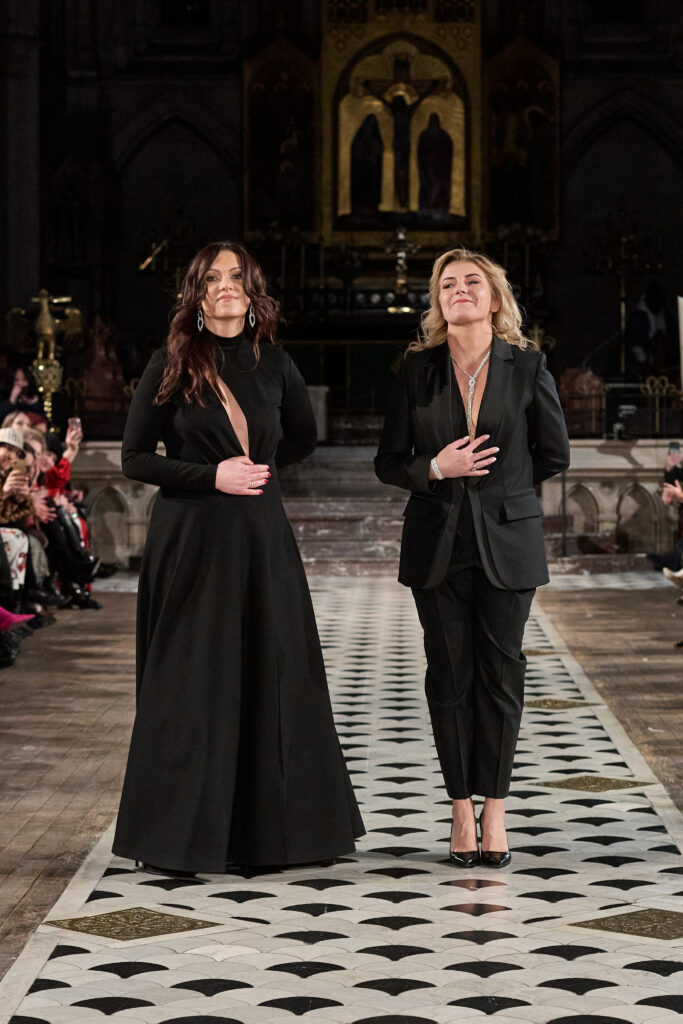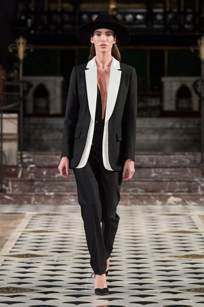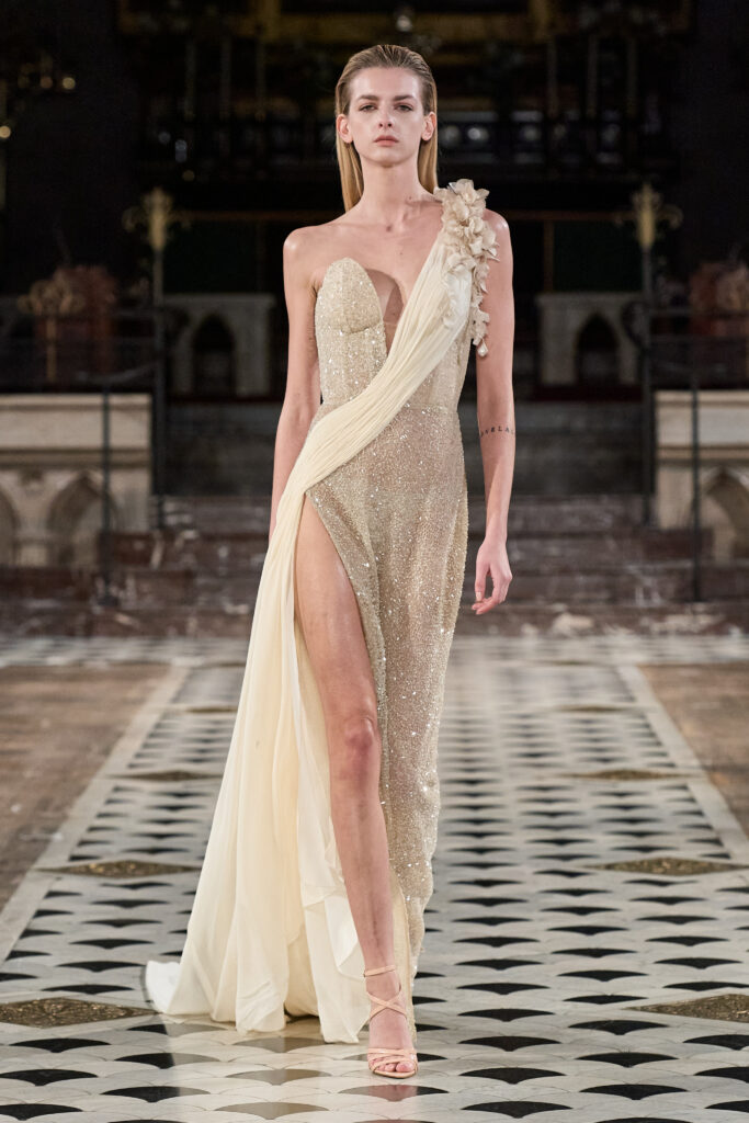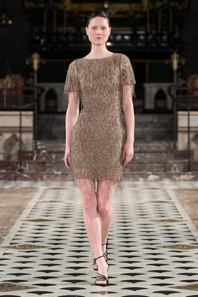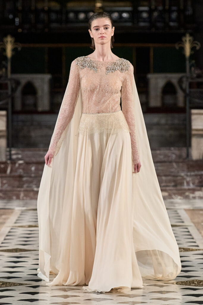 La collection se poursuit avec des nuances de bleu marine étincelant dans un tailleur pantalon en mousseline de soie complété par des applications florales. Des nuances de vert menthe sont également présentes dans la collection, avec des manches d’autruche et des applications 3D faites à la main dans des formes florales et de l’or champagne.