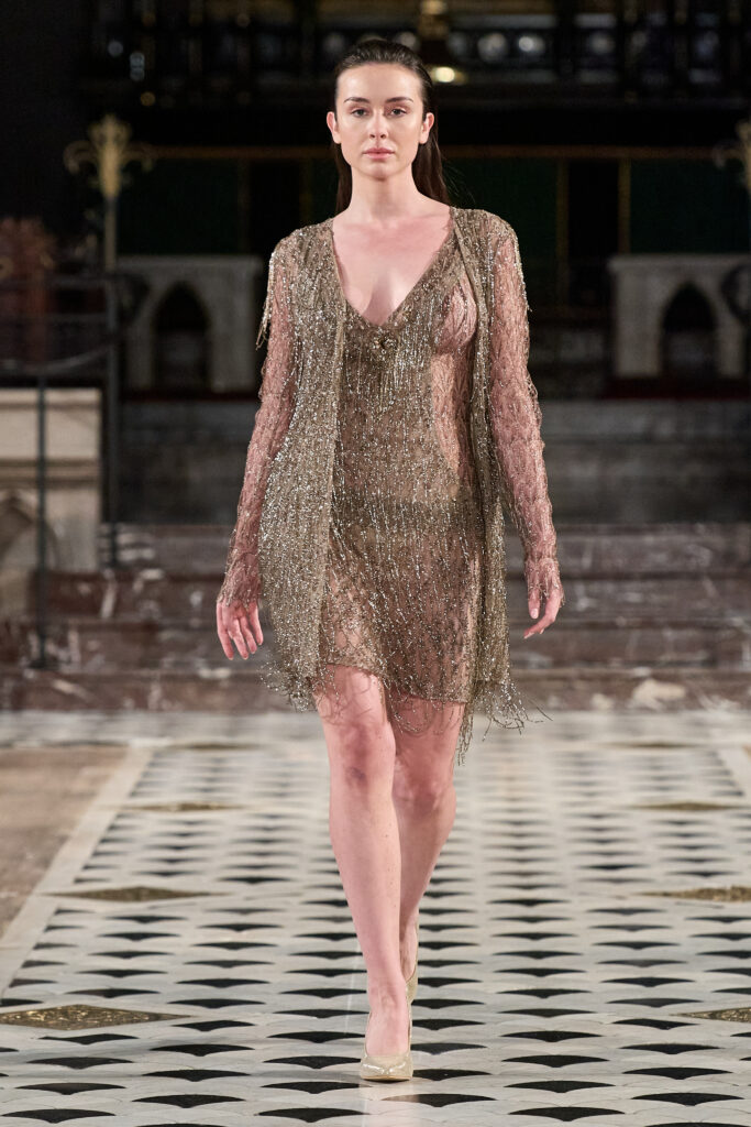 Le point culminant de la collection est la robe finale en dentelle argentée avec des broderies conçues par La Métamorphose et réalisées dans l’Atelier Lesage. La robe comprend des papillons en 3D dans un organza délicat et des applications de perles et de cristaux dans un motif floral. Cette robe symbolise la renaissance après une nuit pleine de magie et de mystère.