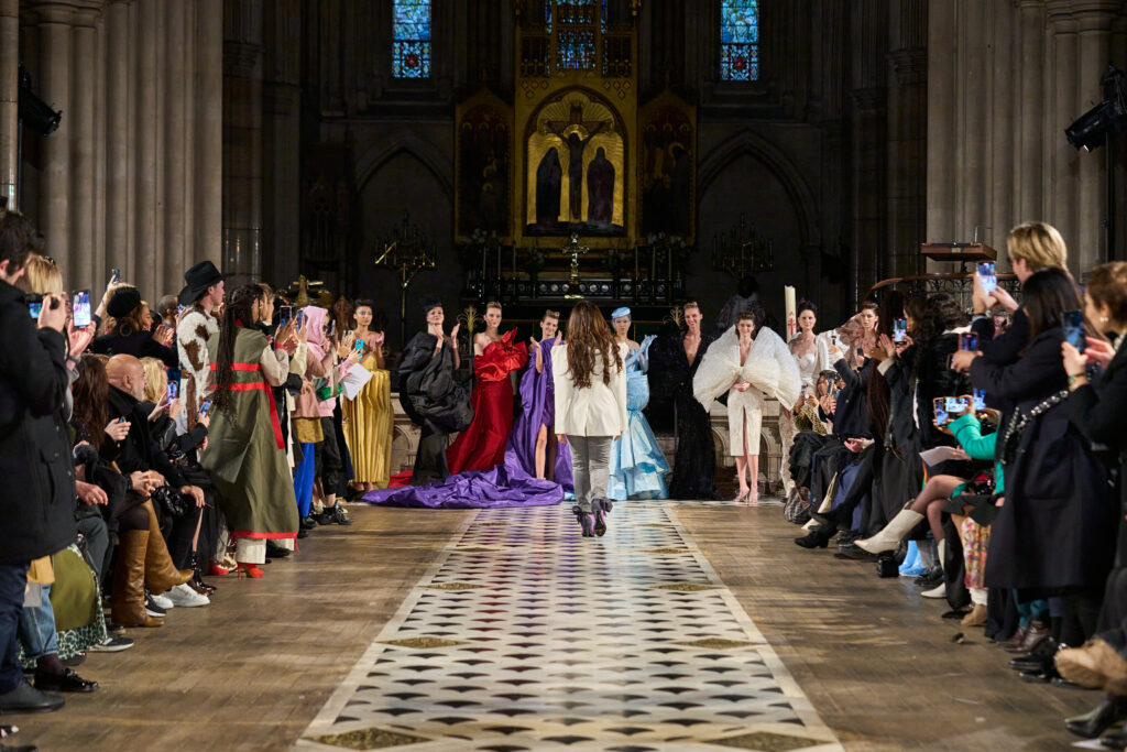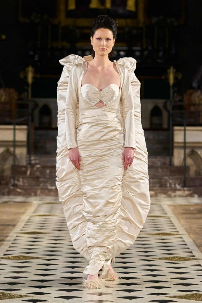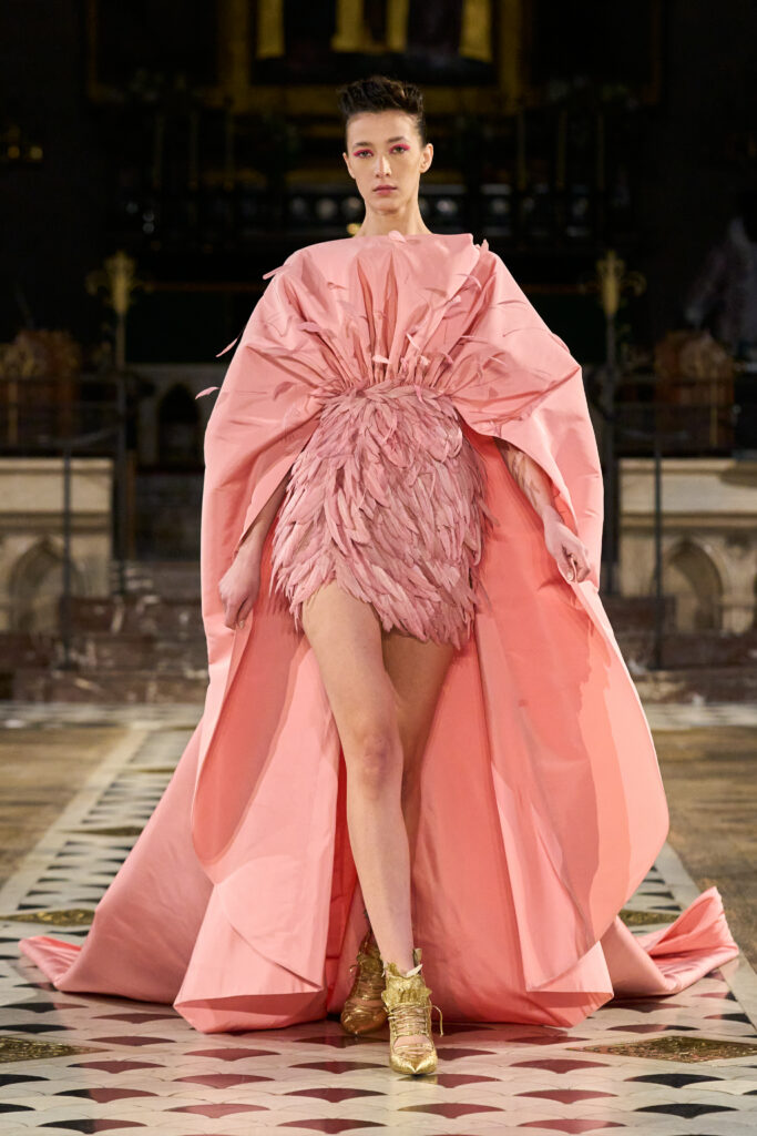 Les matières sensuelles sont mises en avant, avec un accent sur le taffetas de soie. Les accessoires osés et envoûtants sont présentés dans des couleurs franches telles que le rouge, le noir, le bleu clair et le rose. La collection est faite de satin de soie trempé dans du lait de soja, de plumes de coq grand format et de plissés faits à la main dans l’atelier parisien de la marque. Lena Erziak a conçu cette collection comme un plan-séquence puissant et intrépide, afin de crever l’écran. Elle veut nous emmener dans un monde de beauté et de rêve, à travers un long métrage intelligent et élégant.