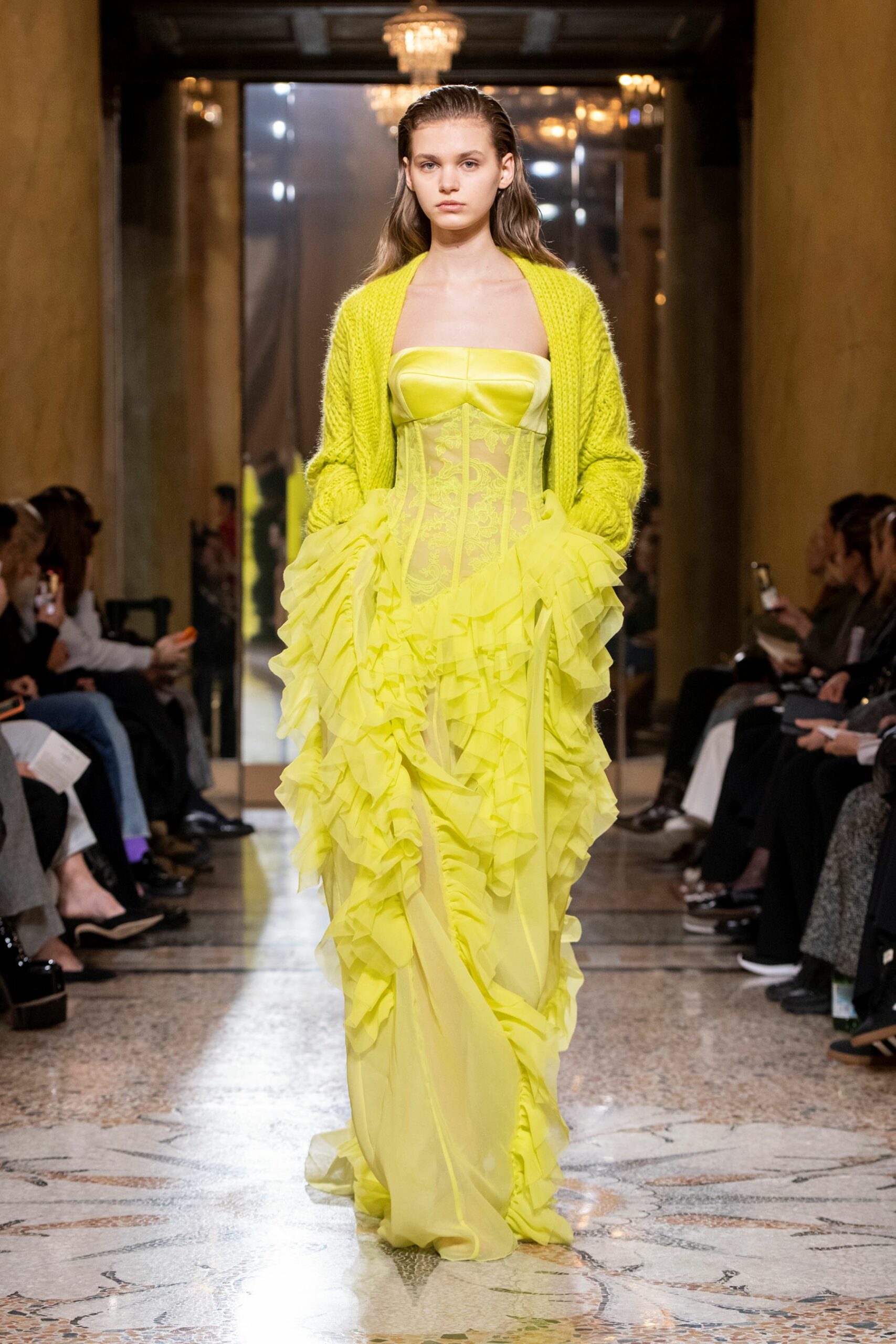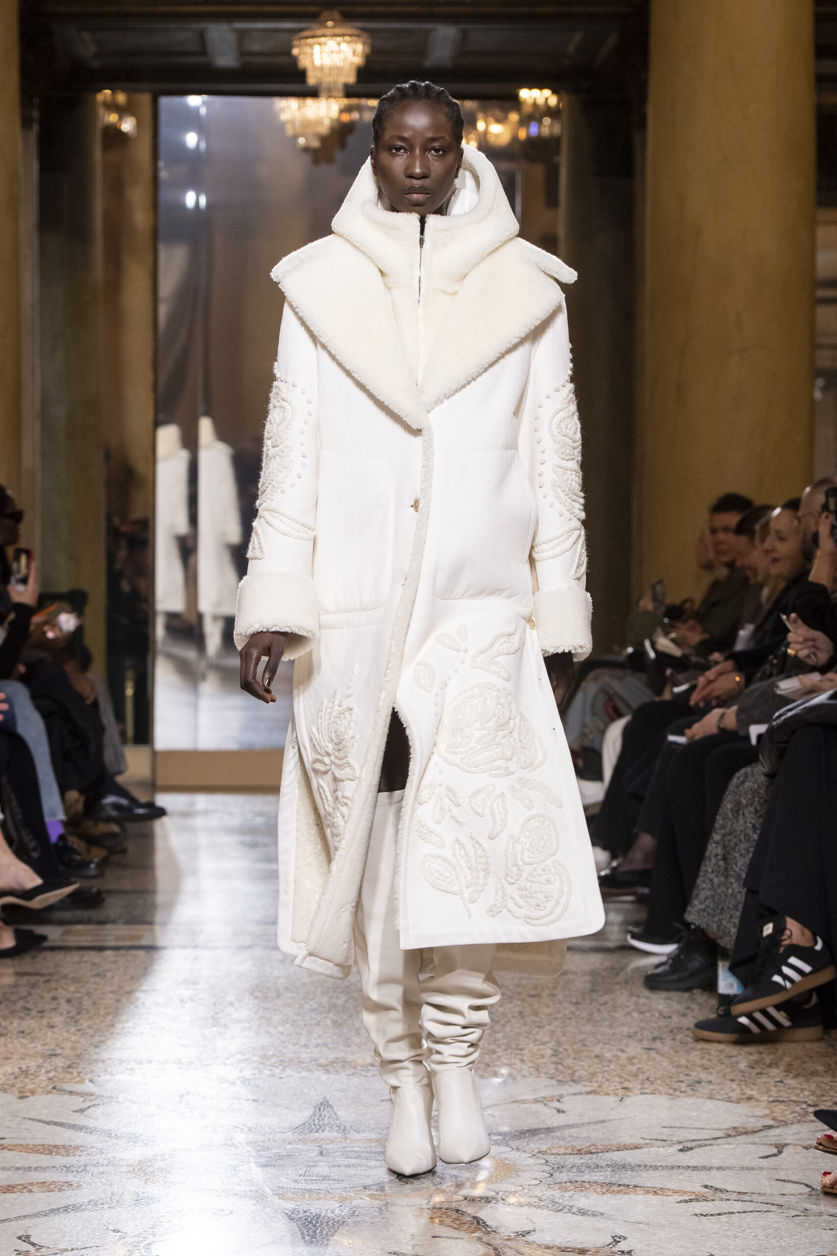 Les vestes et manteaux de la saison en peau lainée sont brodés avec des arrangements de fils de laine épais, tandis que la charmante dentelle signature cascades sur des concoctions transparentes à la fois révélatrices et immaculées.