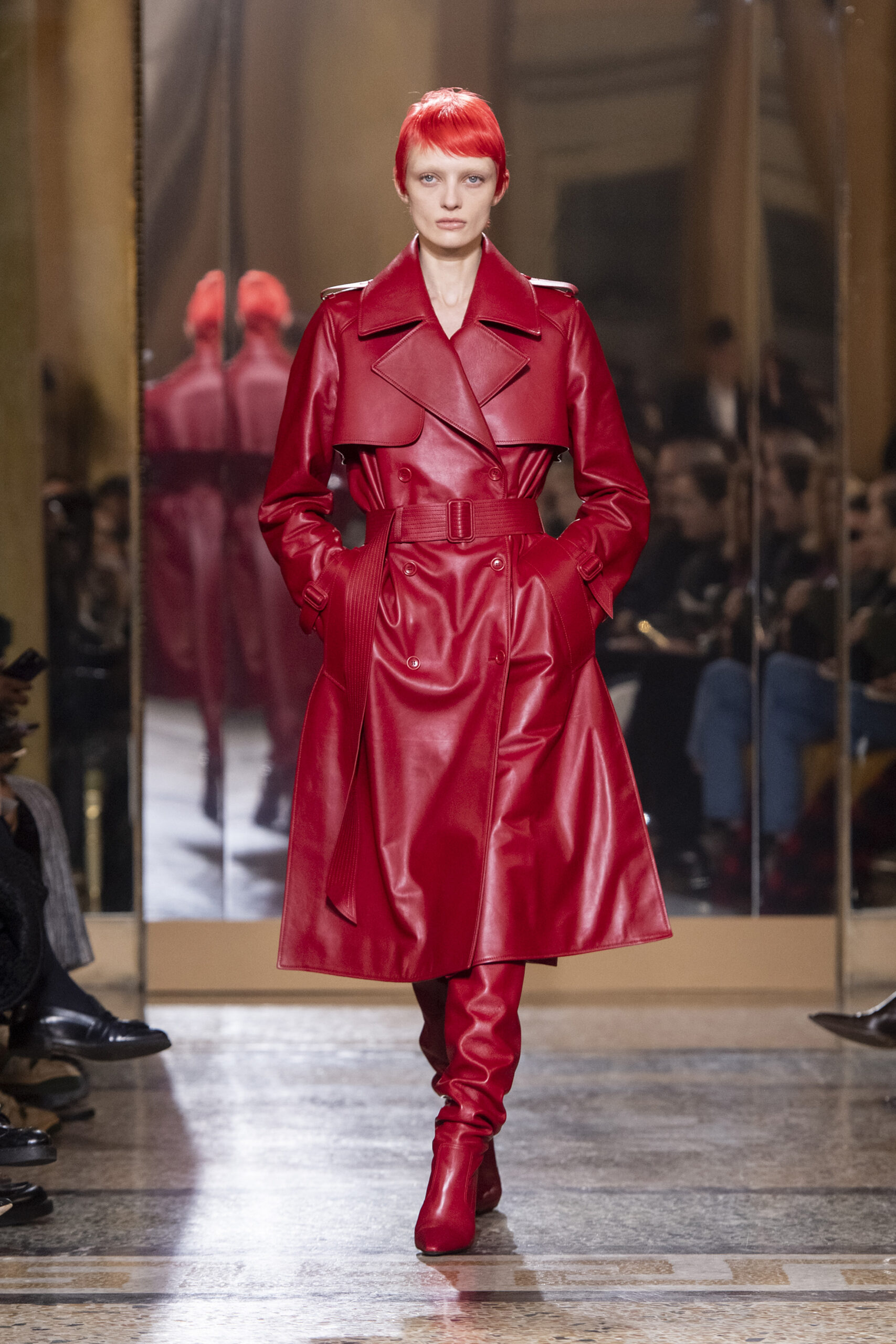 Les manteaux à épaules carrées sont superposés sur de courtes robes en dentelle ; les trenchs en cuir beurré, coupés courts et ceinturés, sont associés à des shorts courts et girly dans le même matériau, et les parkas oversize à capuche, doublées d’une laine tissée duveteuse et enveloppante, sont jetées sur des robes glissantes d’un nuance cinématographique de gris colombe.