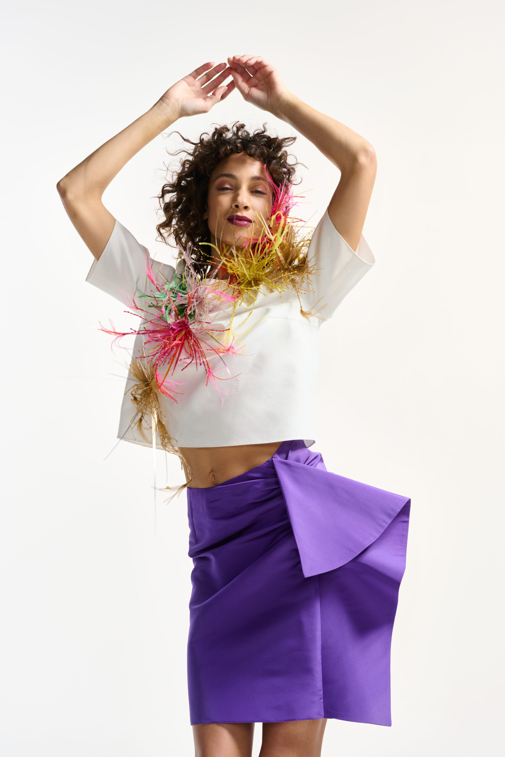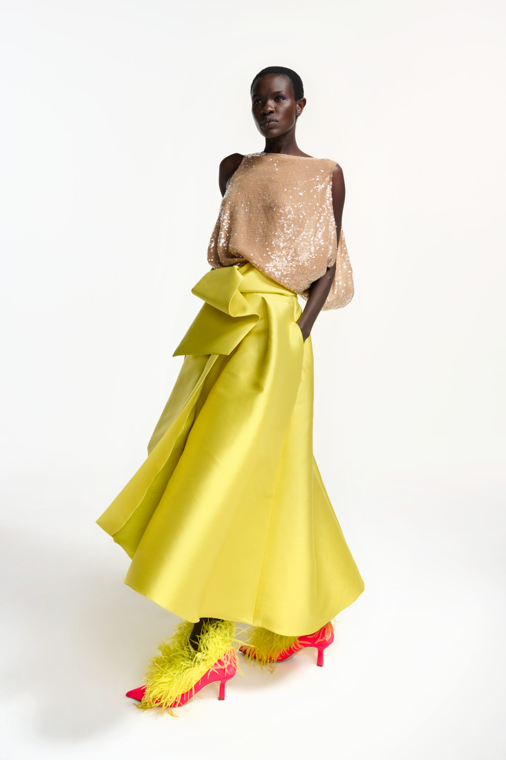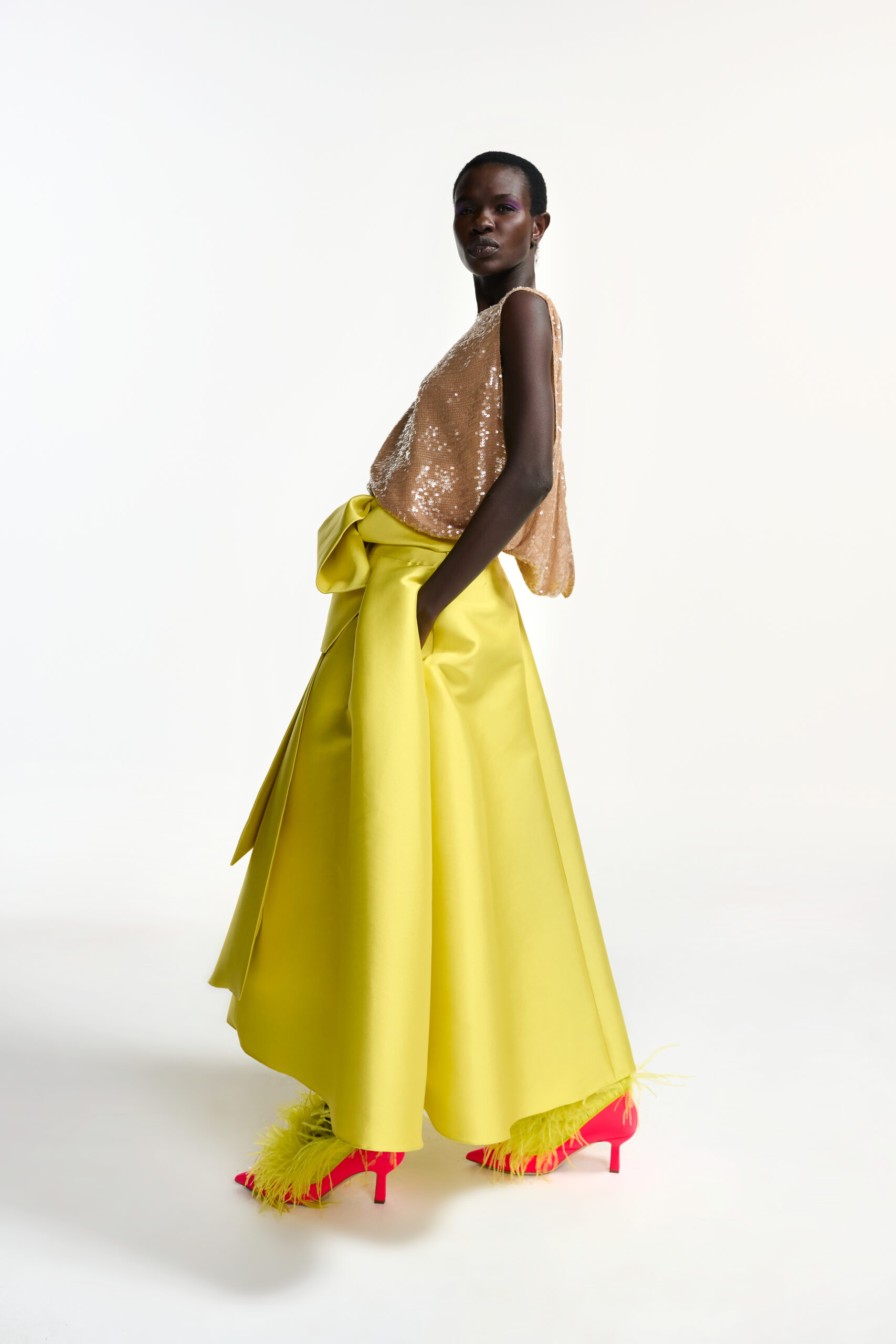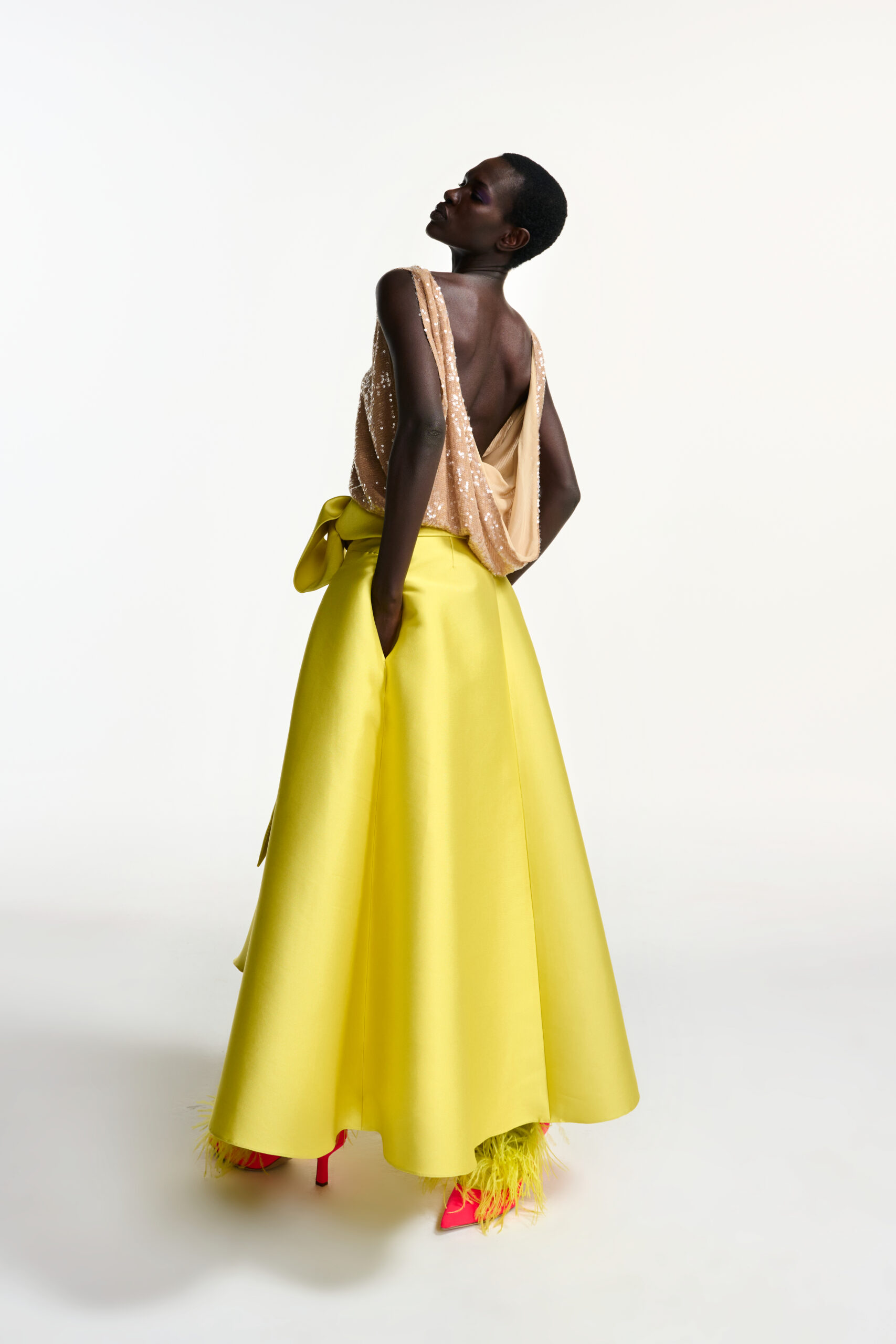 La Maison Natan propose des jupes drapées coordonnées avec des tops ouverts dans le dos, des décolletés plongeants et des feux d’artifice d’optimisme sur la peau. La collection reste fidèle à l’héritage de la Maison, tout en insufflant des accords plus rebelles pour cette nouvelle année de célébration en fanfare.