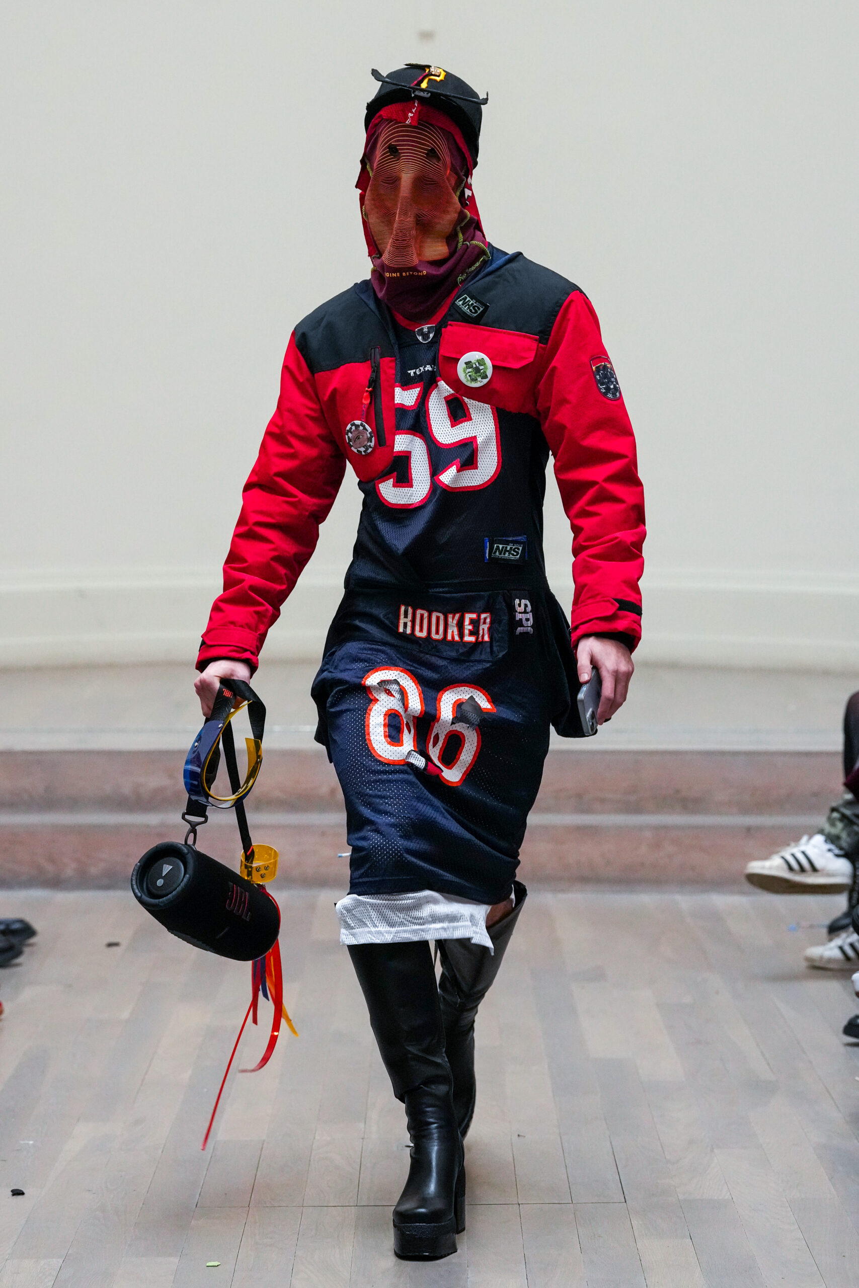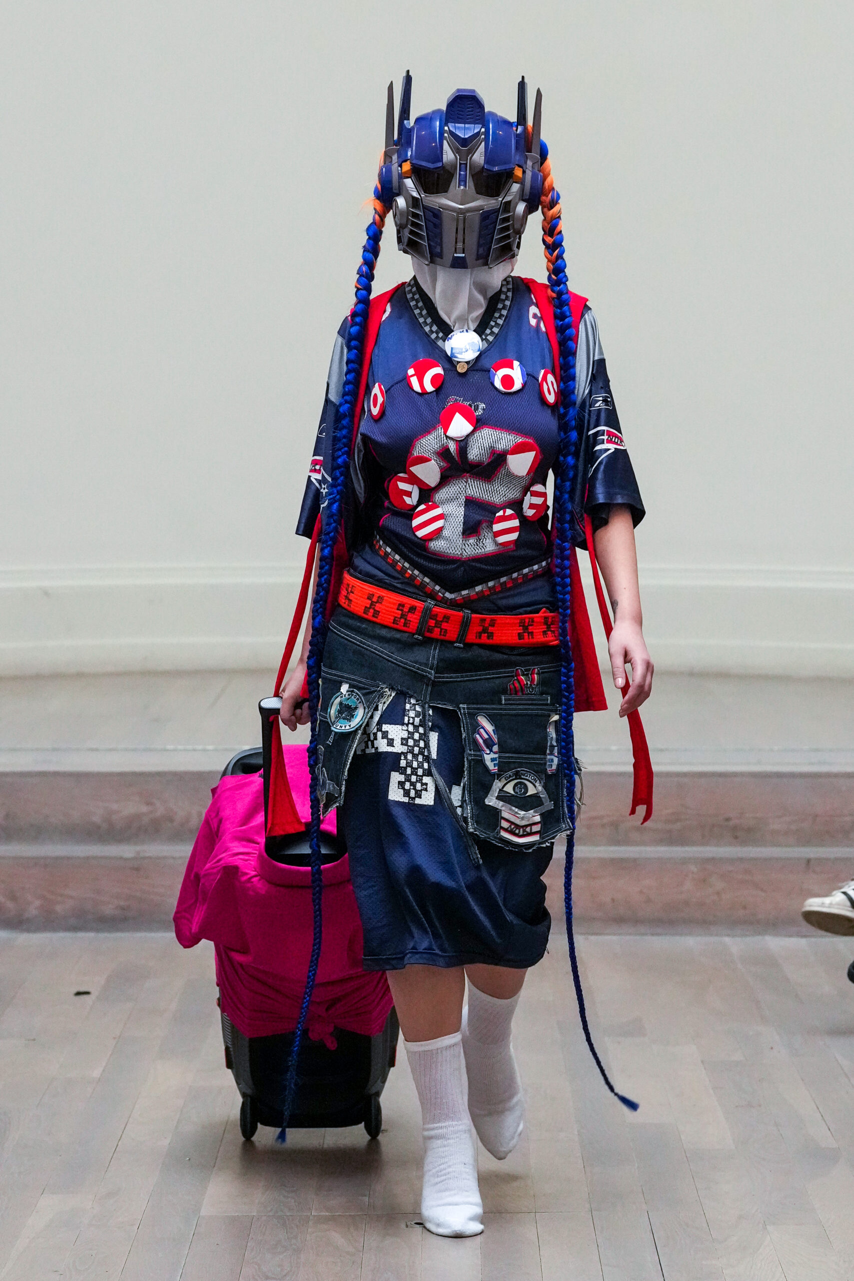 Artiste célèbre, dadaïste moderne et activiste de la mode britannique, Dr Noki est devenu largement reconnu au milieu des années 90 pour son combat contre la montée de la fast fashion. En avance sur la courbe que nous appelons maintenant « la mode circulaire », Noki upcycle des vêtements produits en masse, créant des mélanges de logos pour créer des styles de couture streetwear uniques.