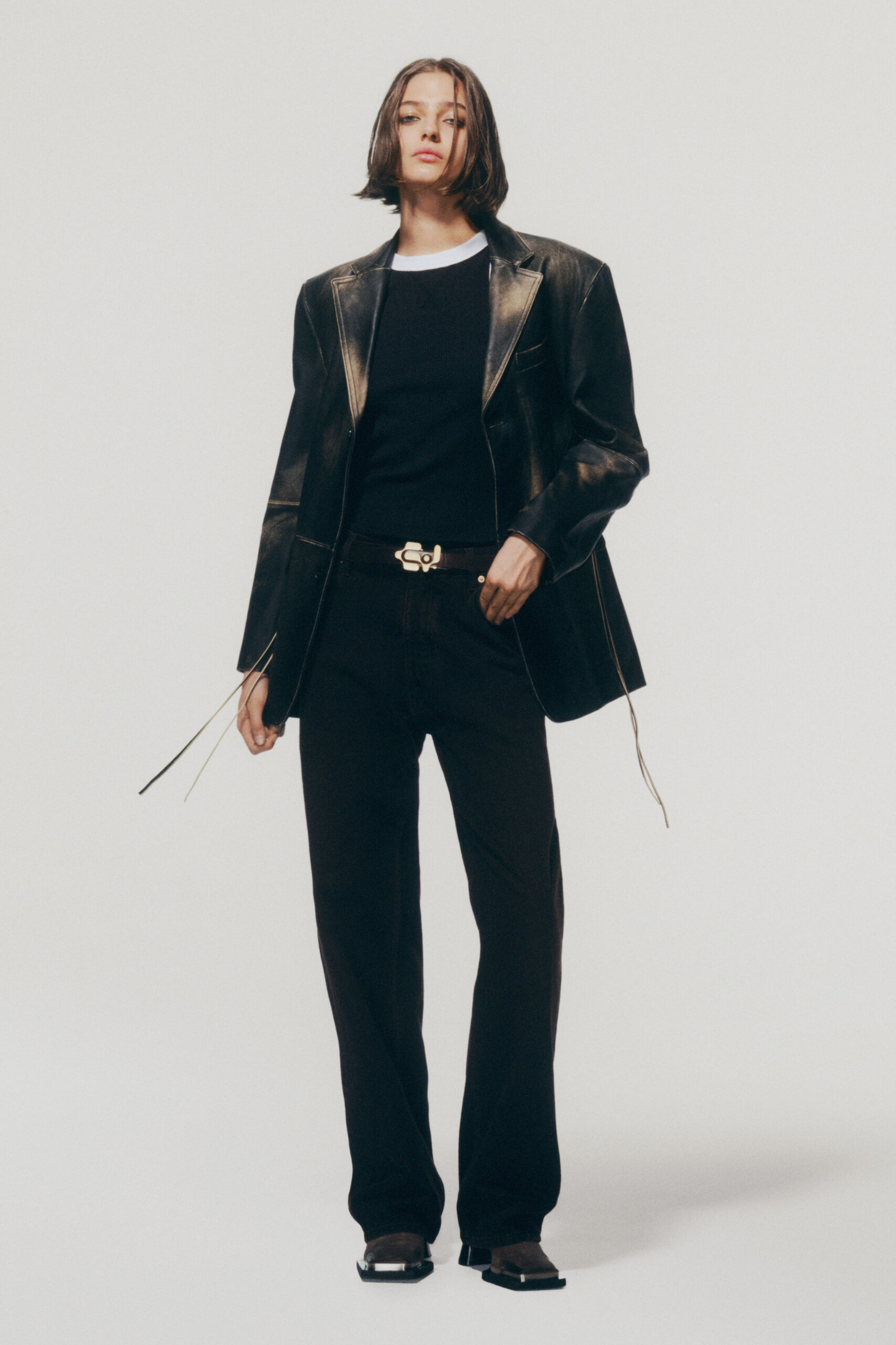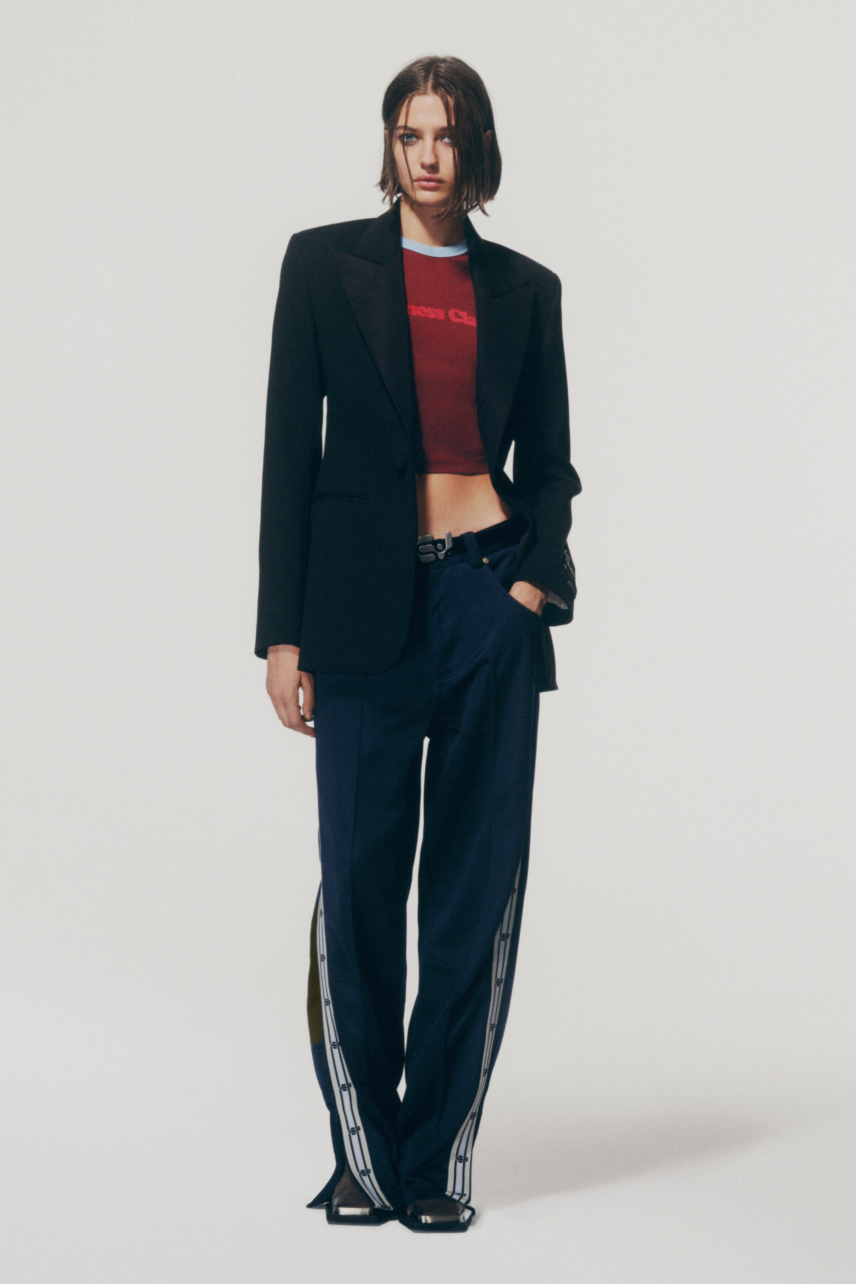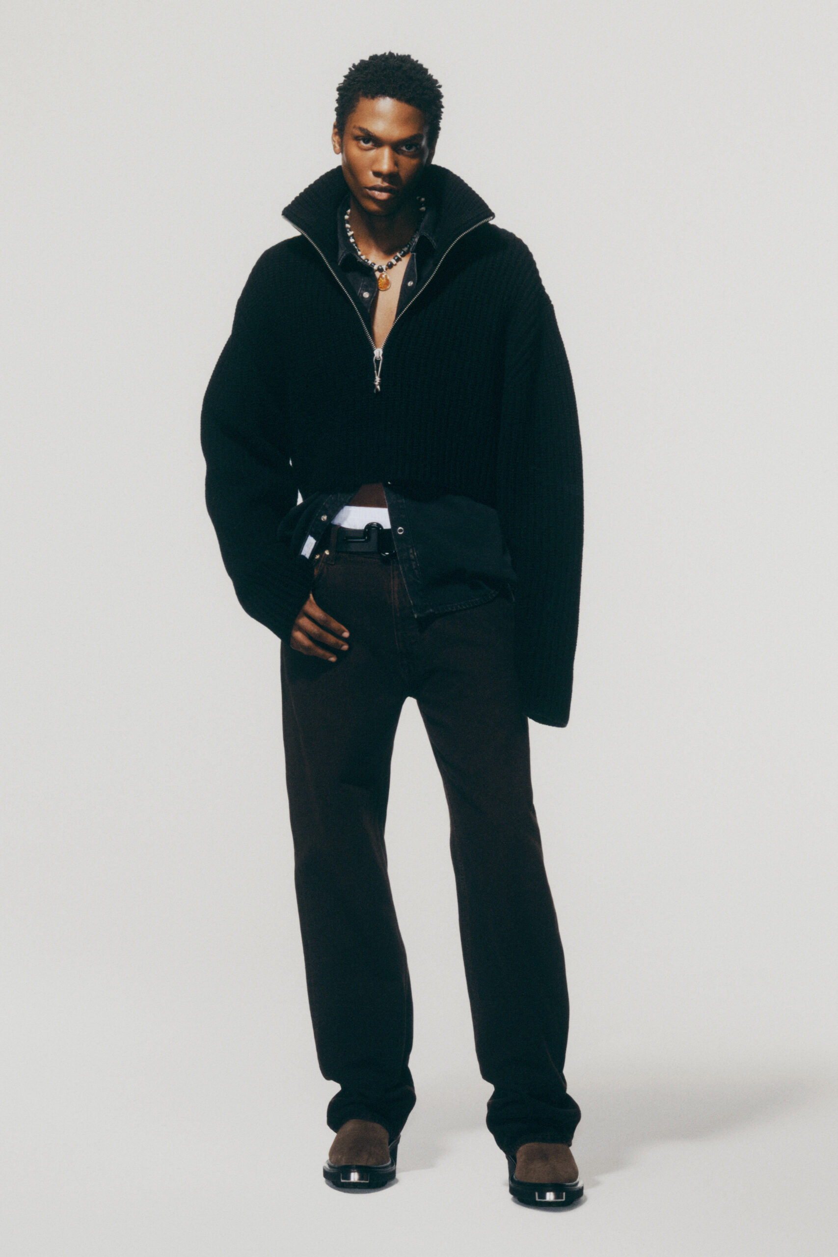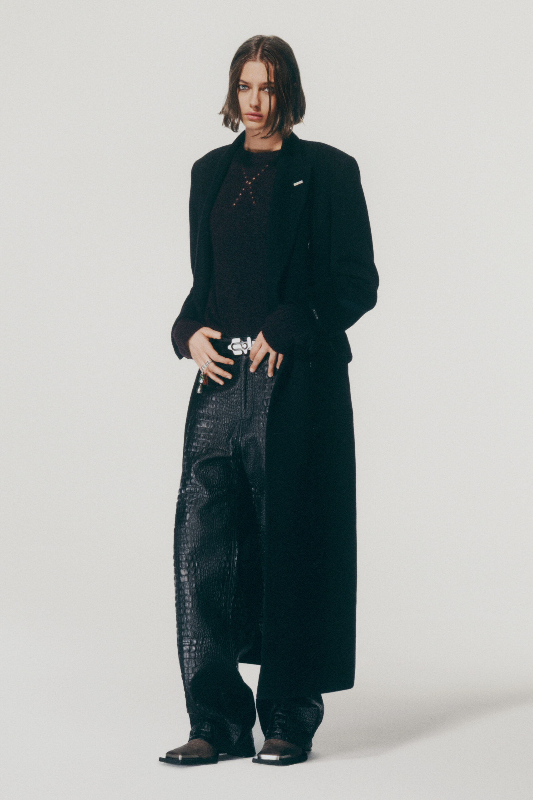 La collection se concentre également sur les proportions et les icônes, avec des pièces telles que des pantalons de survêtement amples, des blazers à taille cintrée, des bottes de cowboy à talons hauts et des baskets de sport des années 70 revisitées. Les pièces de tricot jouent avec la transparence, avec des cols en V flottants et des trous dans le tricot. Les tirettes métalliques nouées et les anneaux en D, une signature de la marque, se trouvent également dans toute la collection.