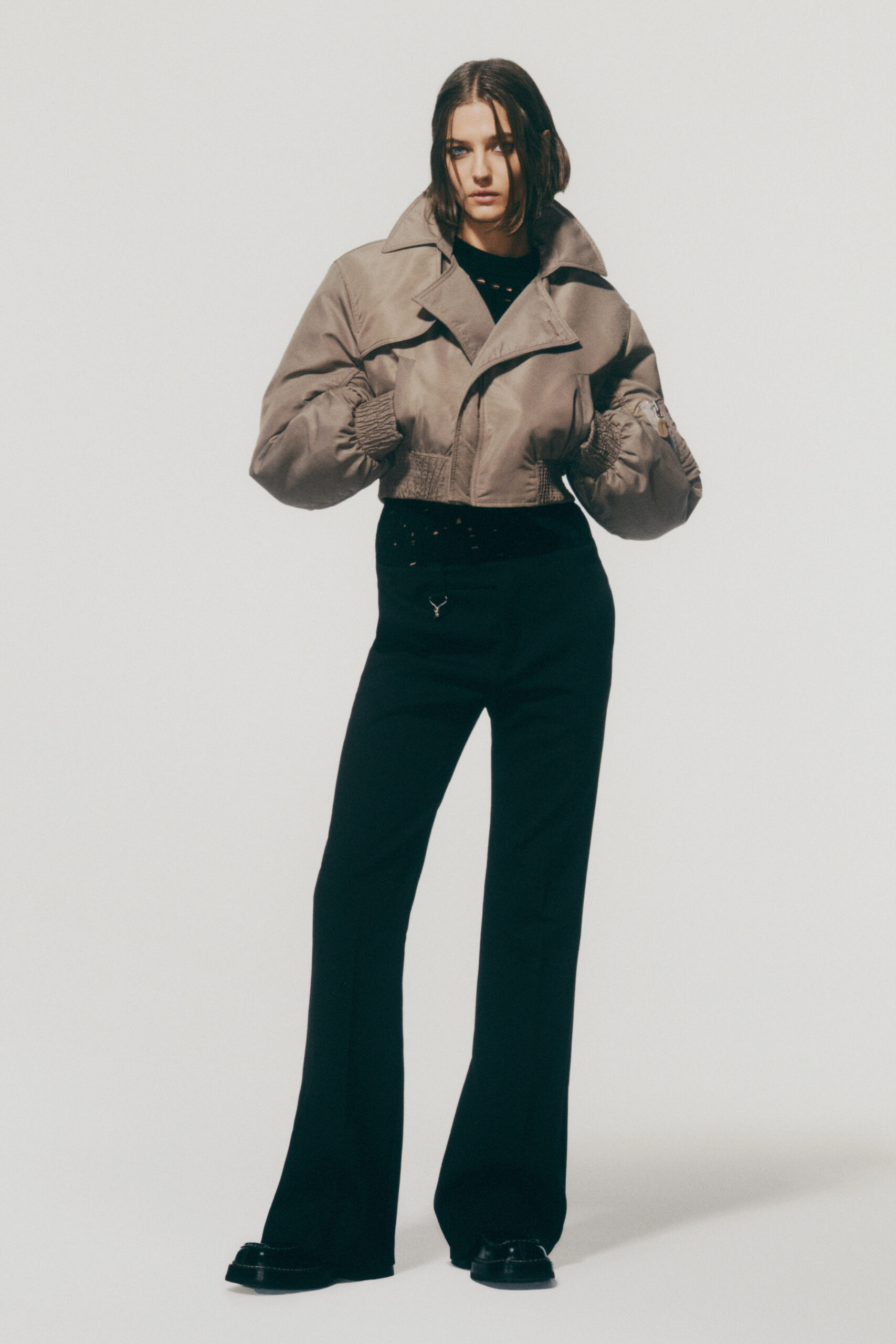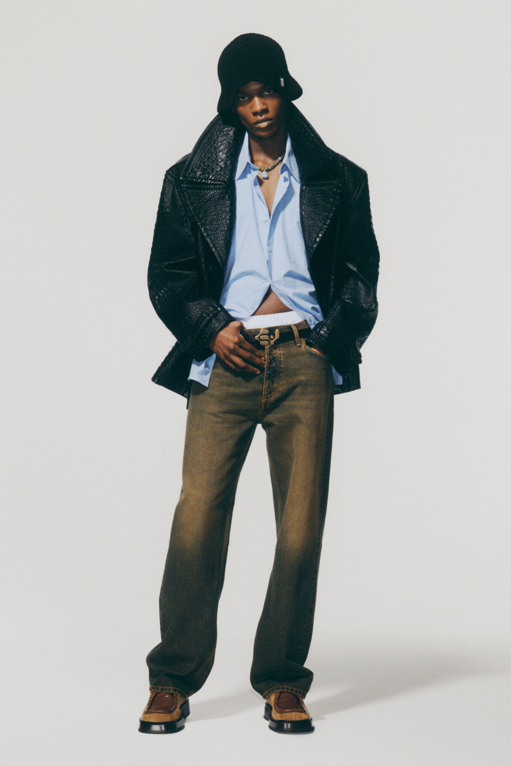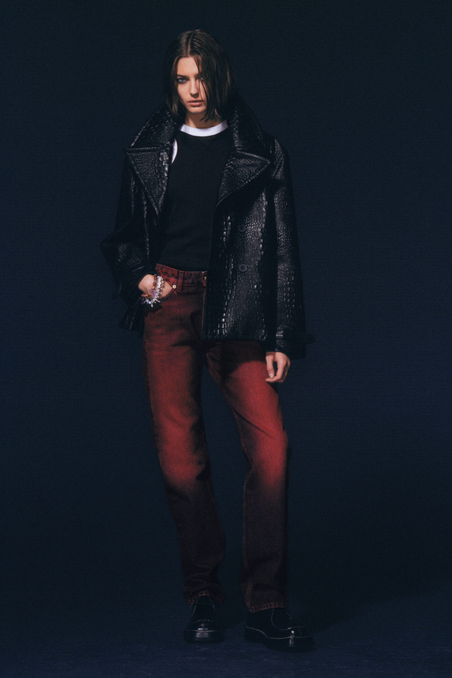 La collection se concentre également sur les proportions et les icônes, avec des pièces telles que des pantalons de survêtement amples, des blazers à taille cintrée, des bottes de cowboy à talons hauts et des baskets de sport des années 70 revisitées. Les pièces de tricot jouent avec la transparence, avec des cols en V flottants et des trous dans le tricot. Les tirettes métalliques nouées et les anneaux en D, une signature de la marque, se trouvent également dans toute la collection.