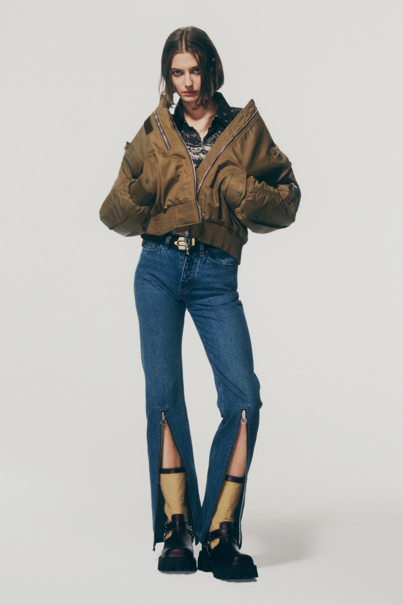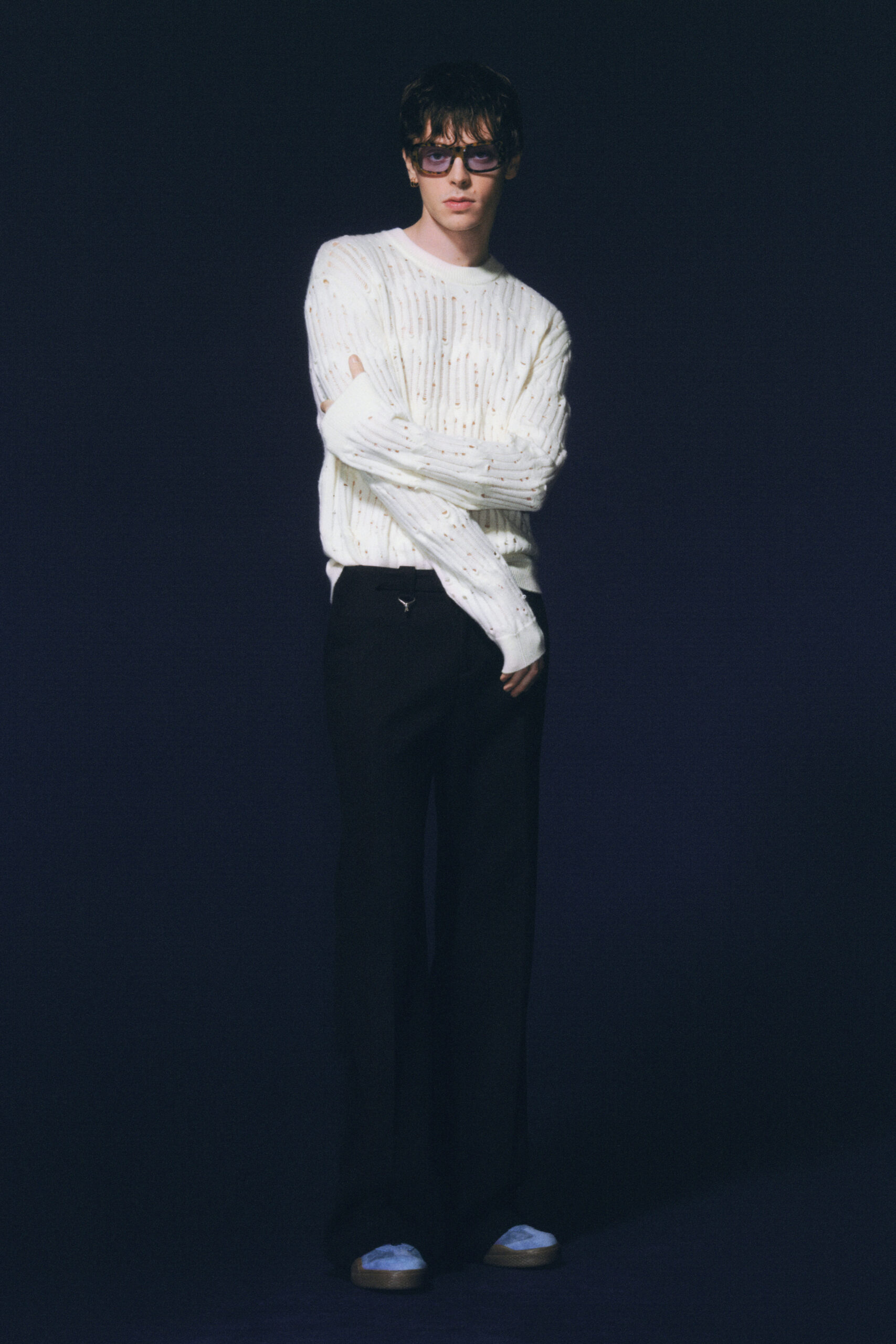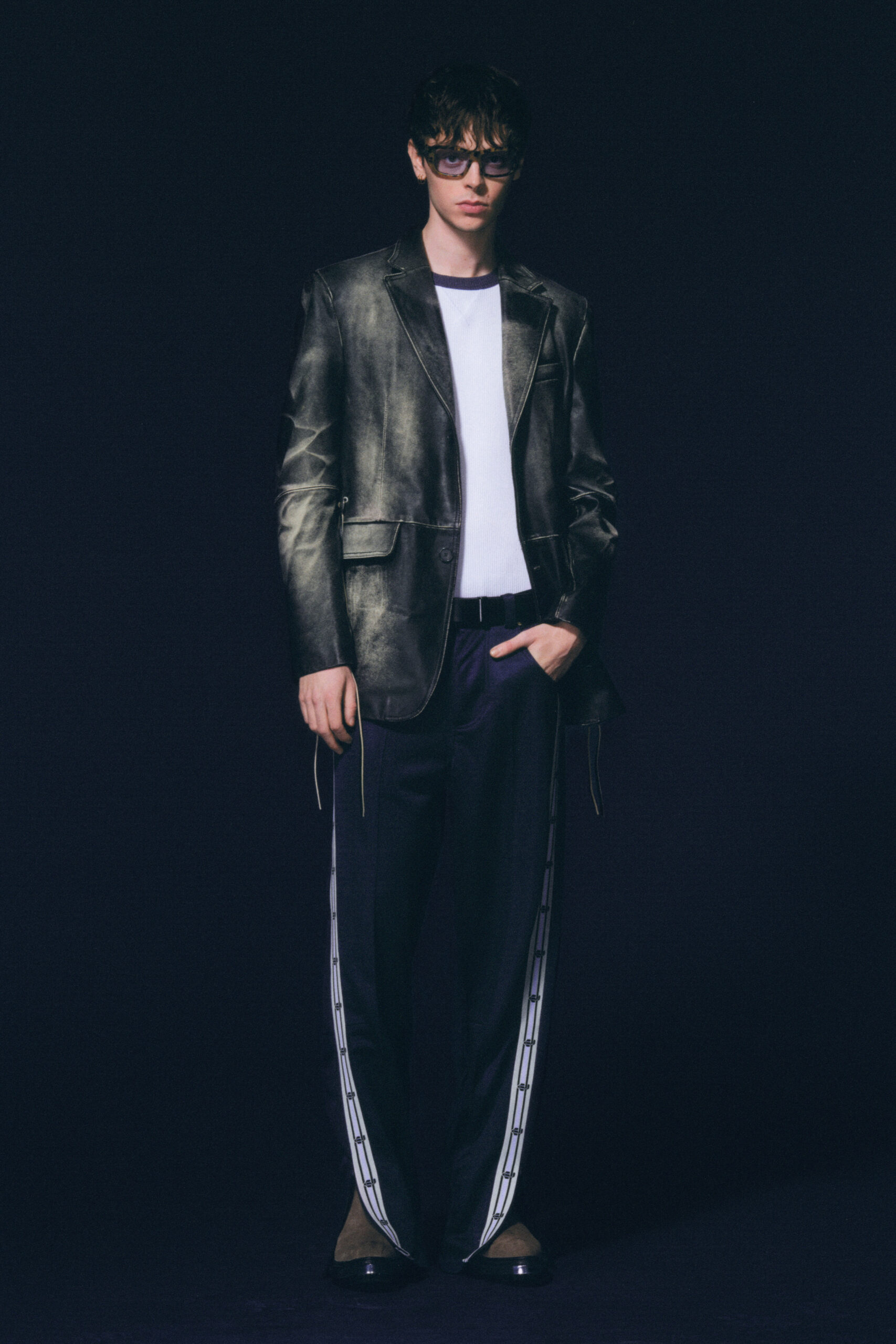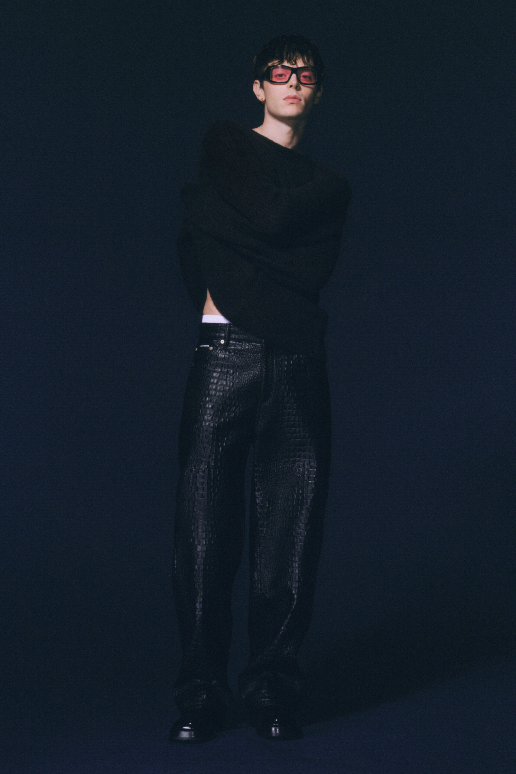 La collection se concentre également sur les proportions et les icônes, avec des pièces telles que des pantalons de survêtement amples, des blazers à taille cintrée, des bottes de cowboy à talons hauts et des baskets de sport des années 70 revisitées. Les pièces de tricot jouent avec la transparence, avec des cols en V flottants et des trous dans le tricot. Les tirettes métalliques nouées et les anneaux en D, une signature de la marque, se trouvent également dans toute la collection.