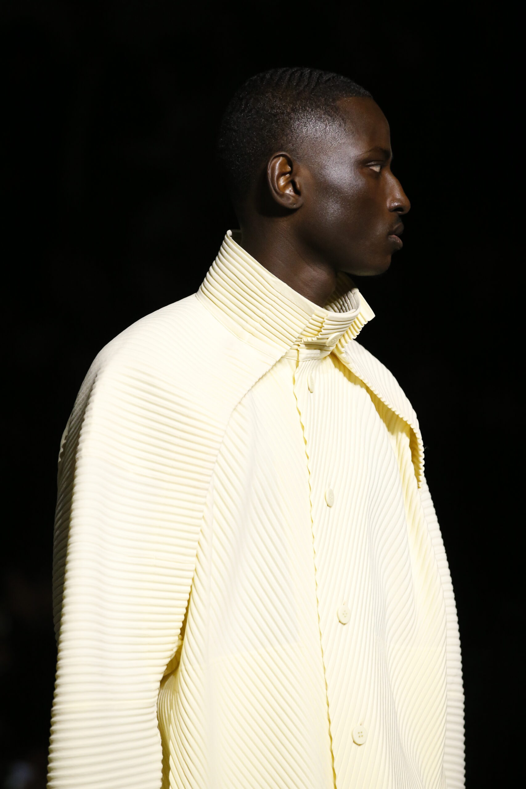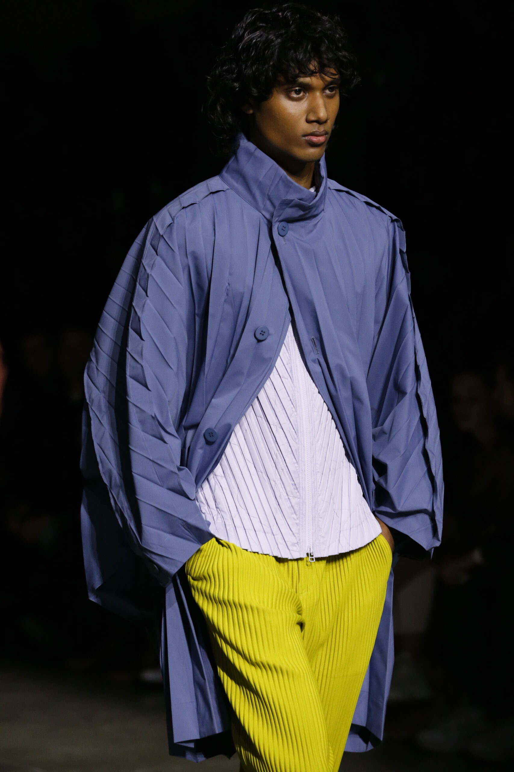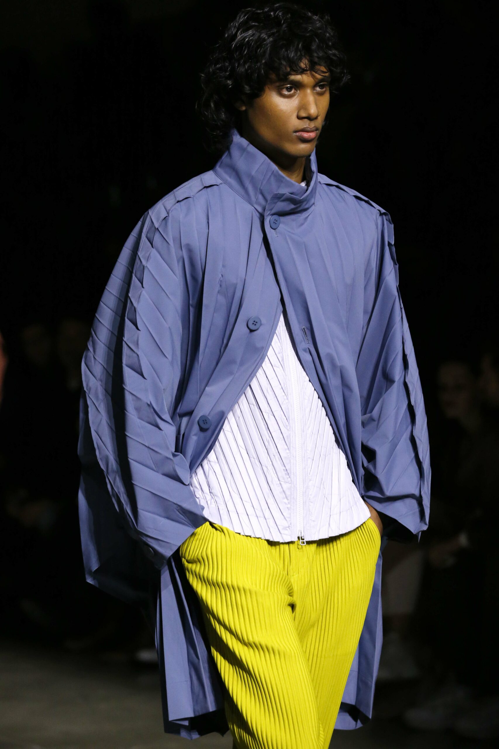 La palette de couleurs du mois de juillet est vive et la nouvelle silhouette de veste est ample et arrondie, avec des plis en forme de crêtes qui partent du cou jusqu’aux épaules, rappelant des manches raglan et se prêtant à une construction tubulaire. Le manteau EDGE COAT est conçu avec des plis rayonnants en polyester haute densité. Ce nouveau style de manteau tridimensionnel est inspiré d’une composition de triangles et présente un pli sur le dos qui s’étend d’un poignet à l’autre.