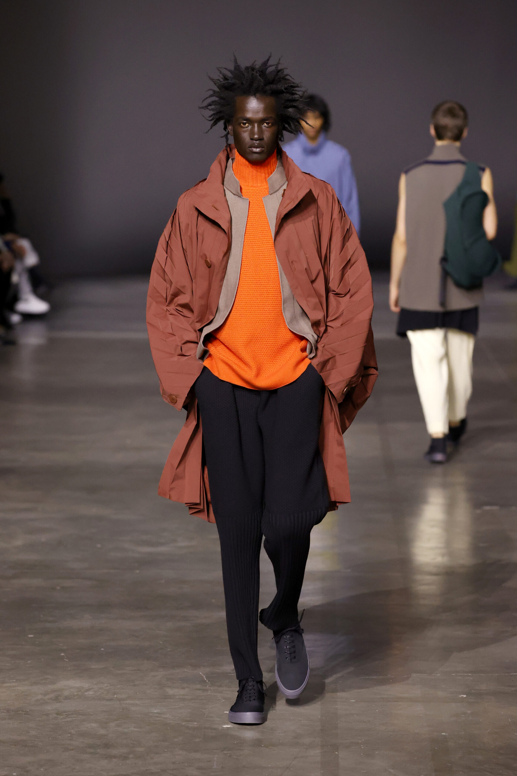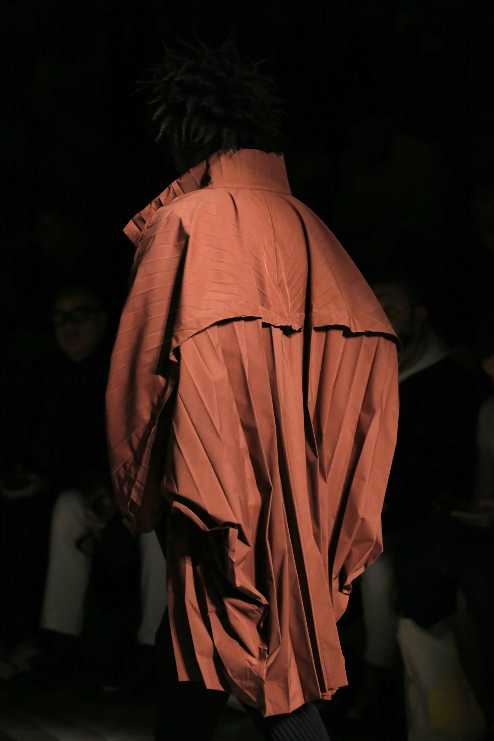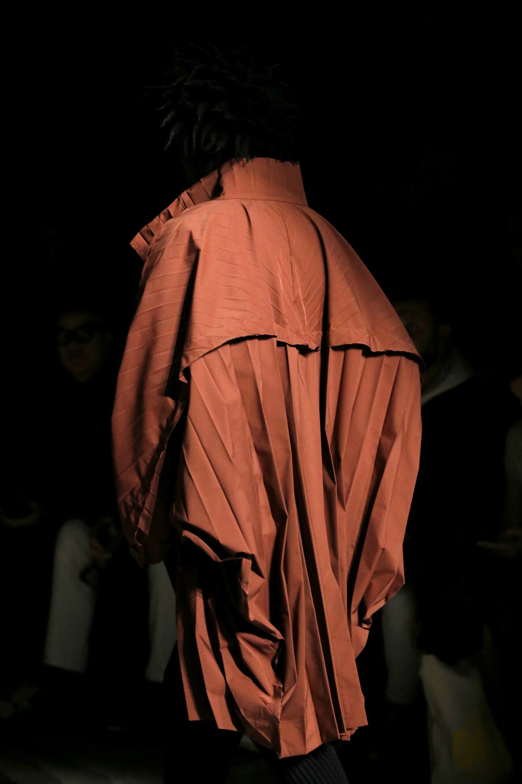 La palette de couleurs du mois de juillet est vive et la nouvelle silhouette de veste est ample et arrondie, avec des plis en forme de crêtes qui partent du cou jusqu’aux épaules, rappelant des manches raglan et se prêtant à une construction tubulaire. Le manteau EDGE COAT est conçu avec des plis rayonnants en polyester haute densité. Ce nouveau style de manteau tridimensionnel est inspiré d’une composition de triangles et présente un pli sur le dos qui s’étend d’un poignet à l’autre.