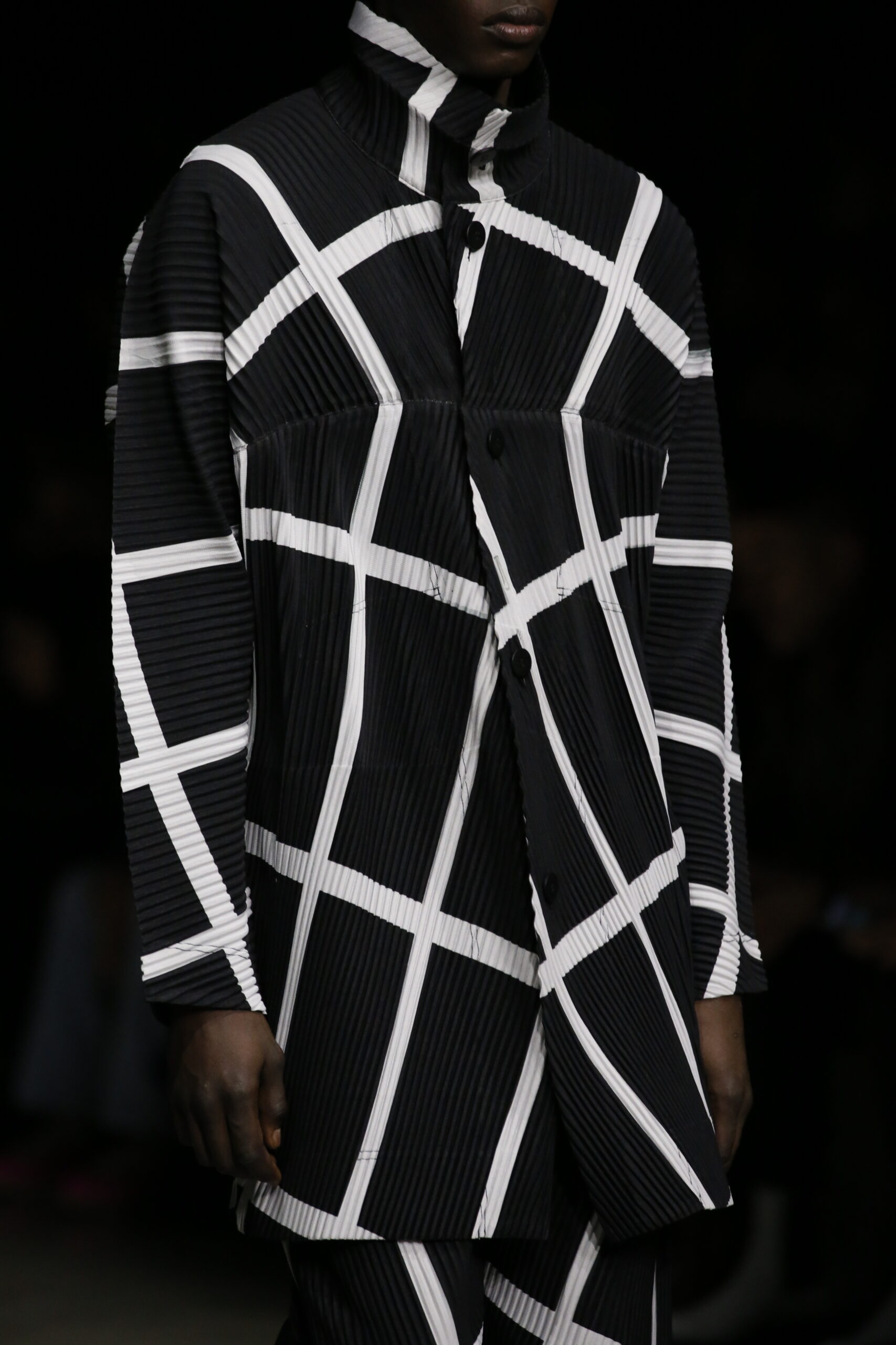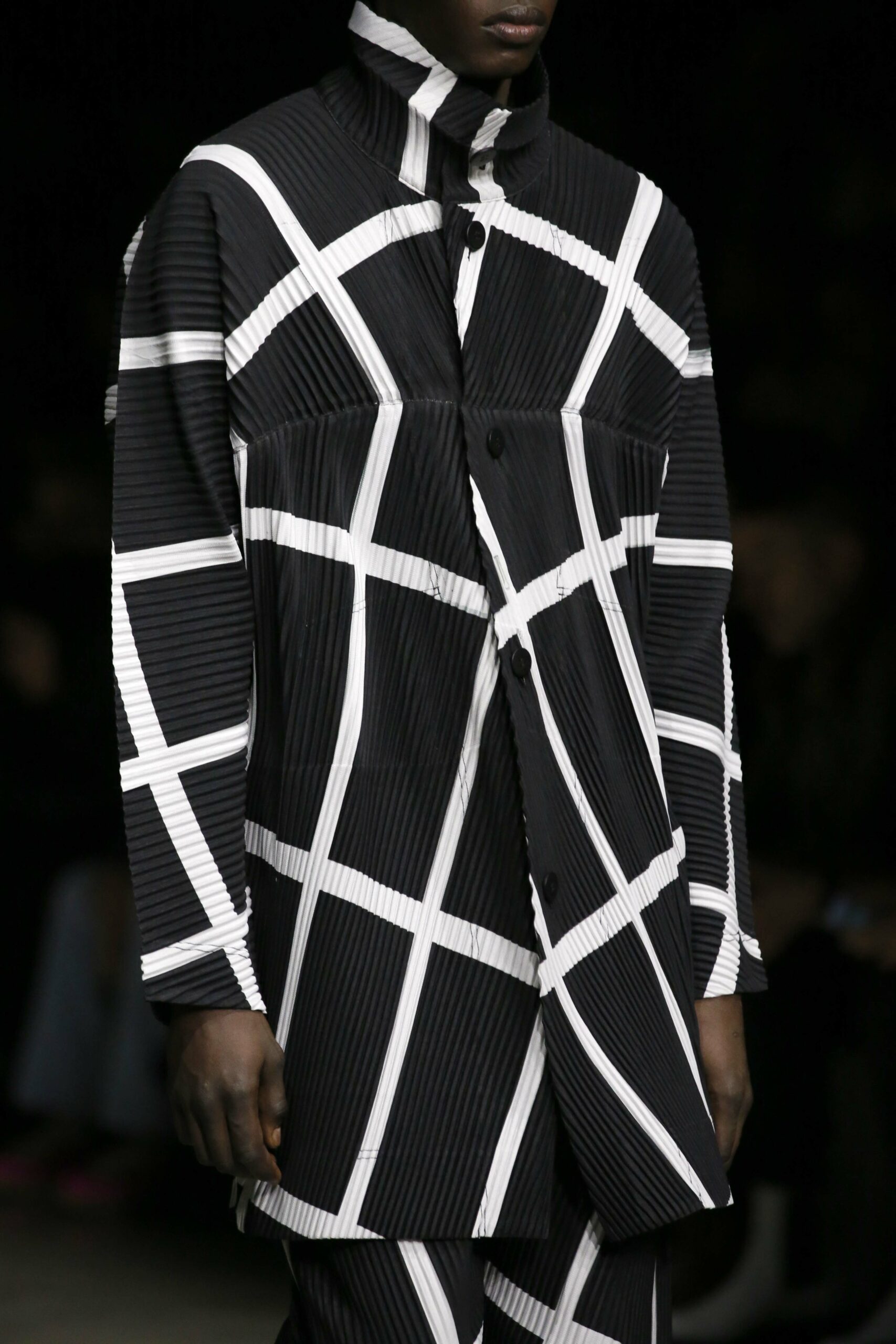 La série imprimée SKEW GRID est une série de plis diagonaux et de lignes obliques qui créent une illusion d’optique et apportent une sensation de mouvement à l’imprimé graphique. Elle est disponible en trois styles : manteau, gilet et pantalon.