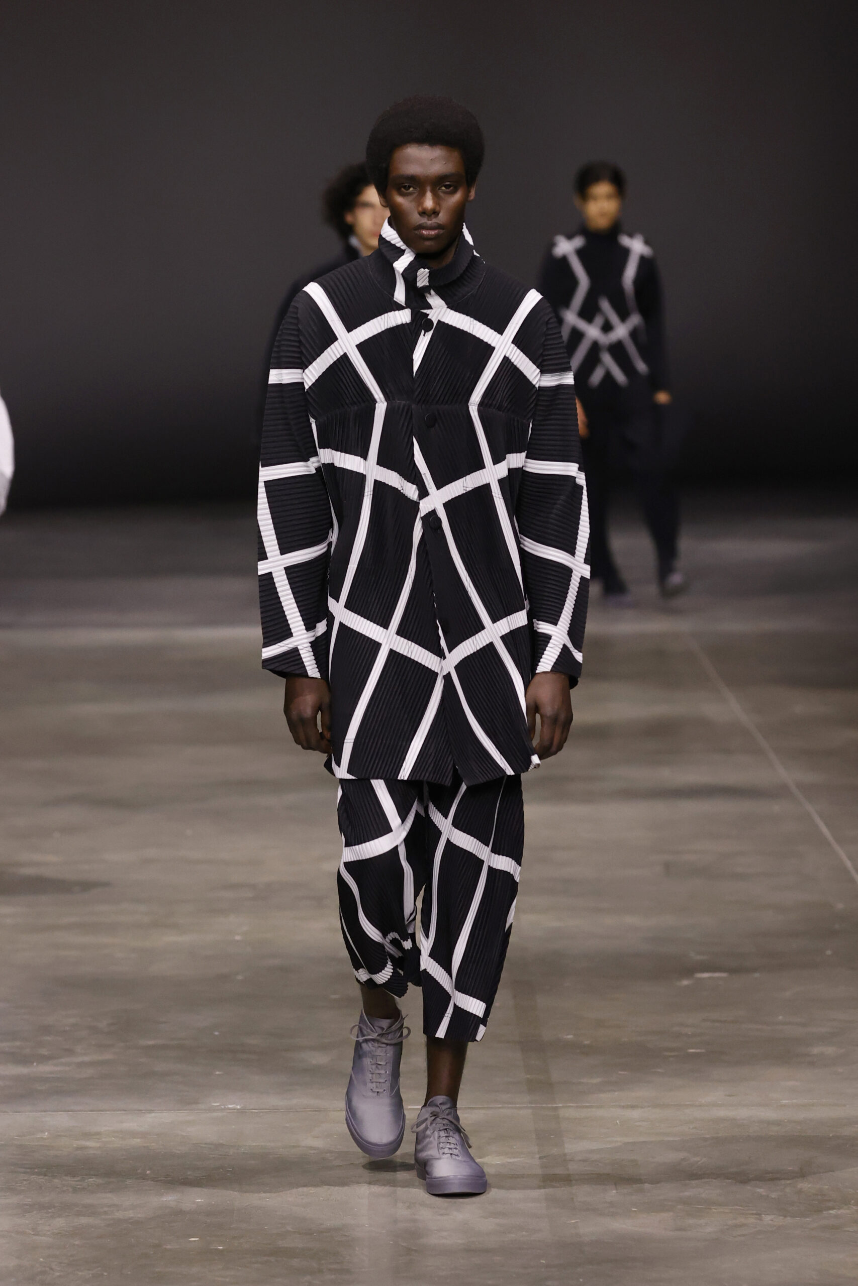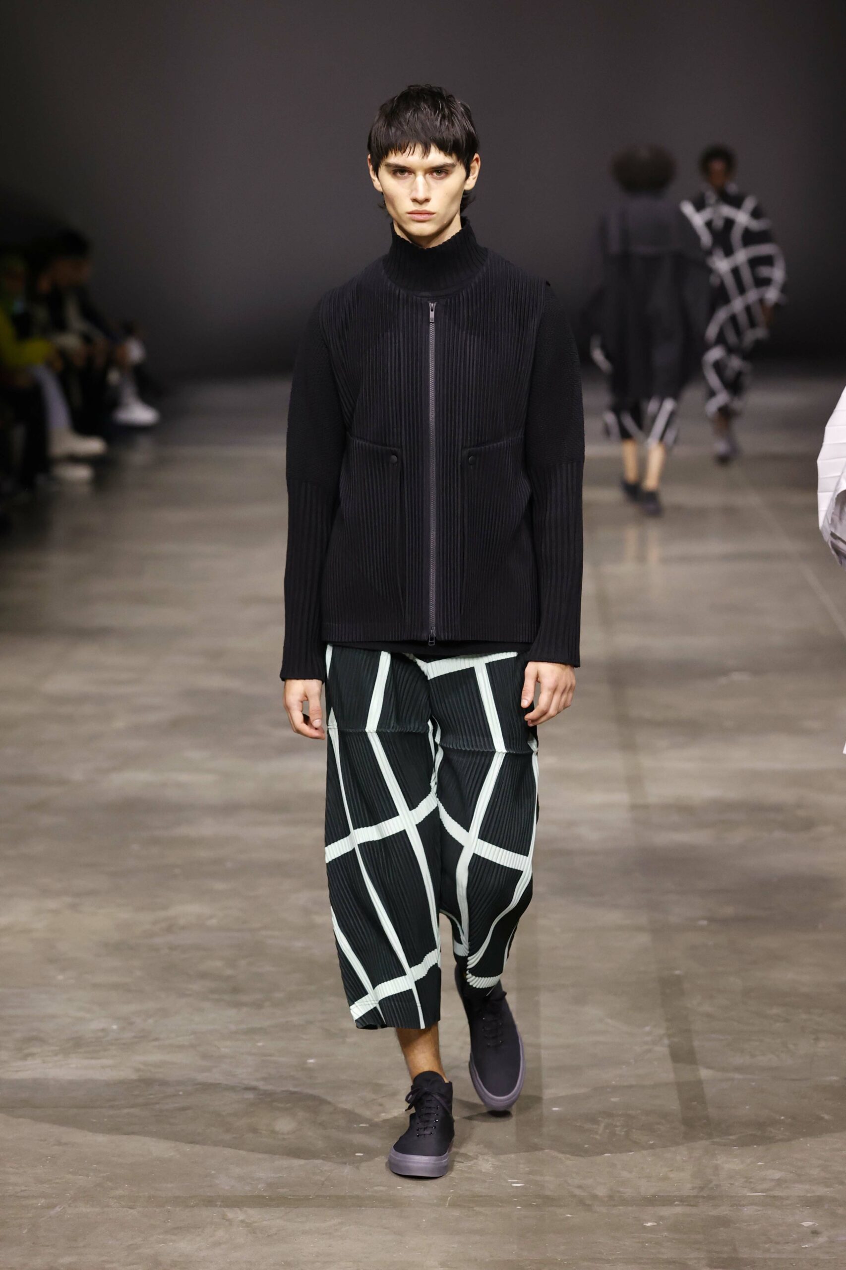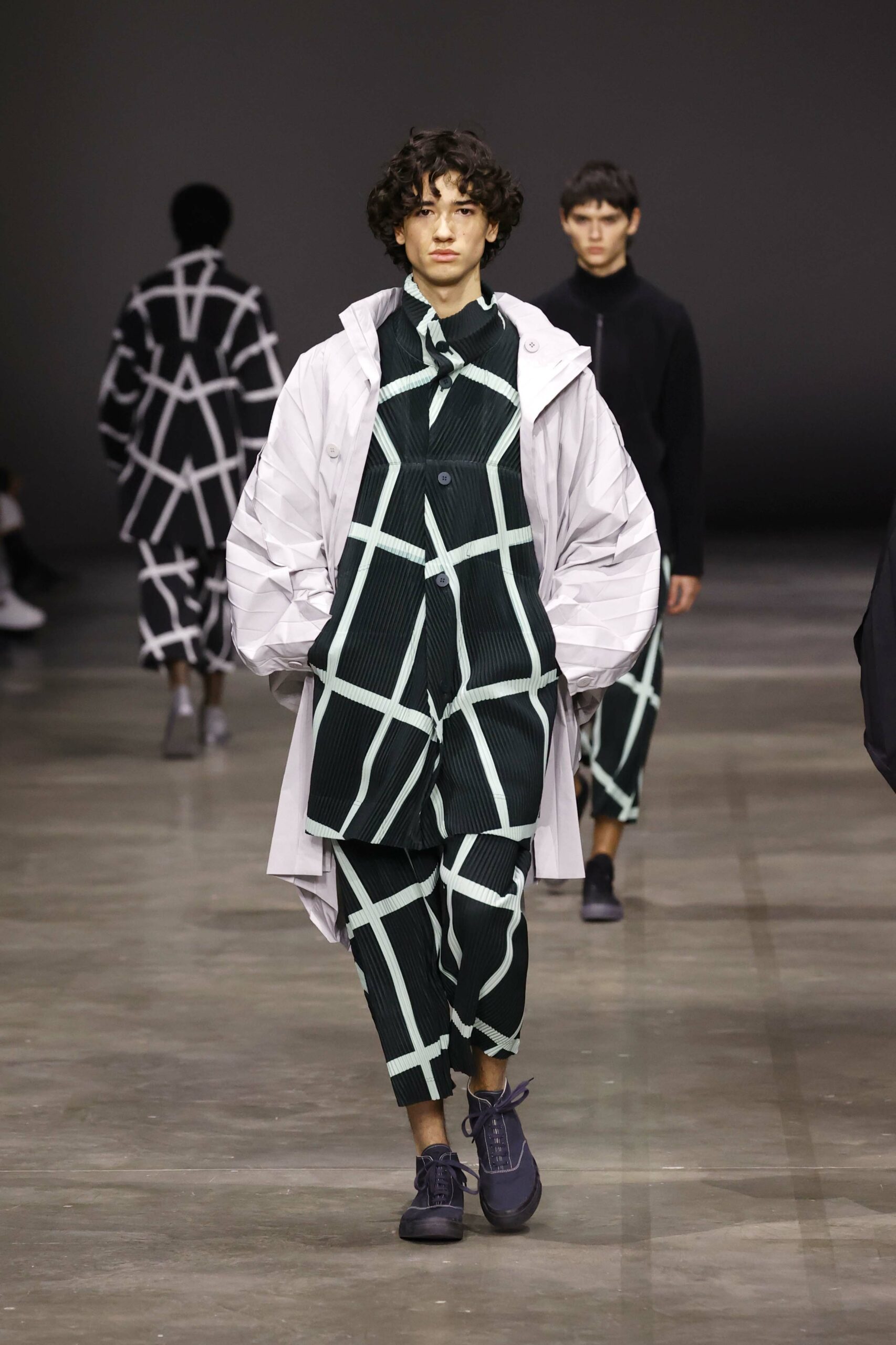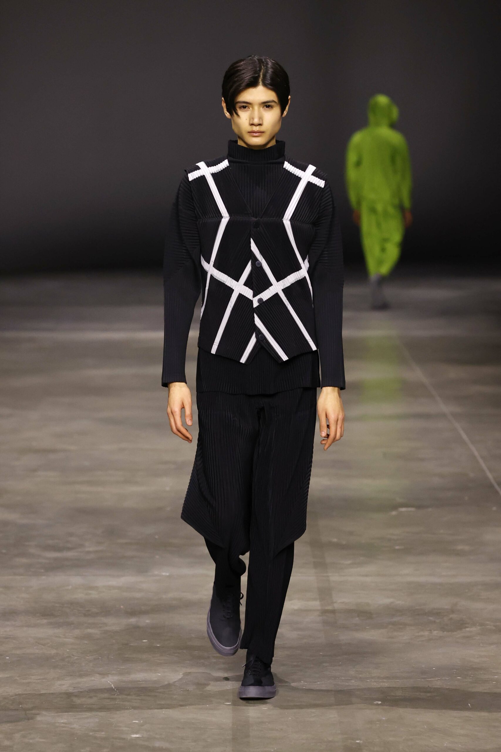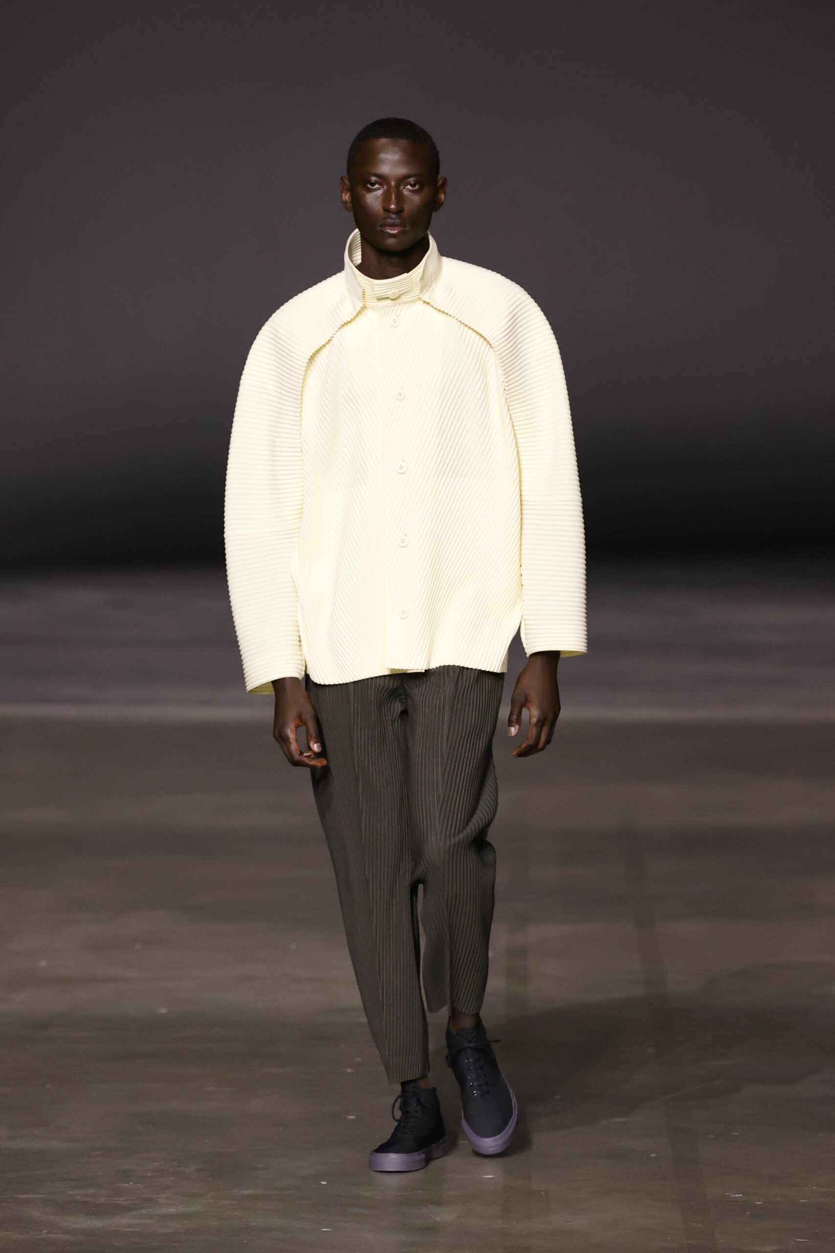 La nouvelle collection HOMME PLISSÉ ISSEY MIYAKE AUTUMN WINTER 2023/24, présentée lors du défilé Upon A Simplex au Palais de Tokyo à Paris le jeudi 19 janvier, se caractérise par une exploration de triangles et d’autres formes géométriques simples qui se transforment en créations aux formes complexes. Les formes obtenues sont intégrées aux vêtements, et les segments de ligne de leurs composants sont adaptés en plis dans les constructions de tissu, créant une collection de formations élaborées qui reflètent la simplicité de la géométrie de base.