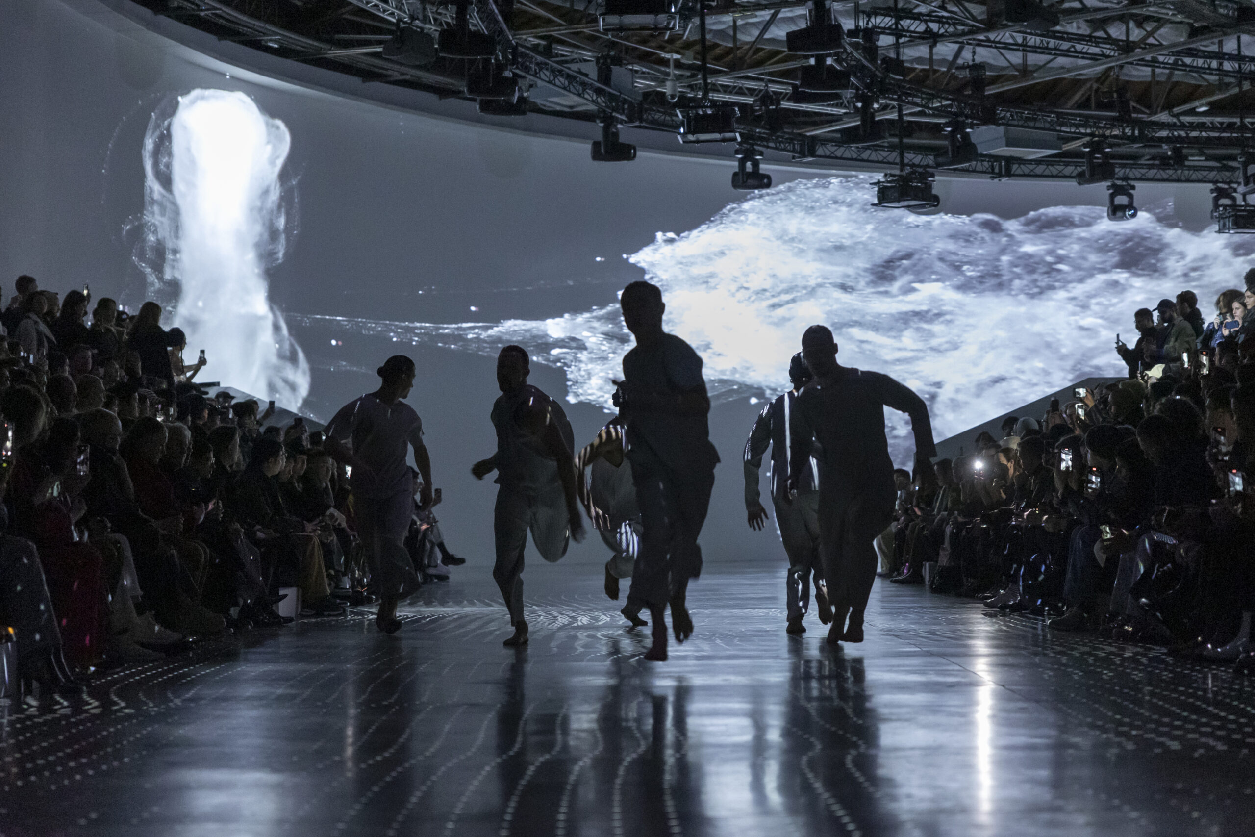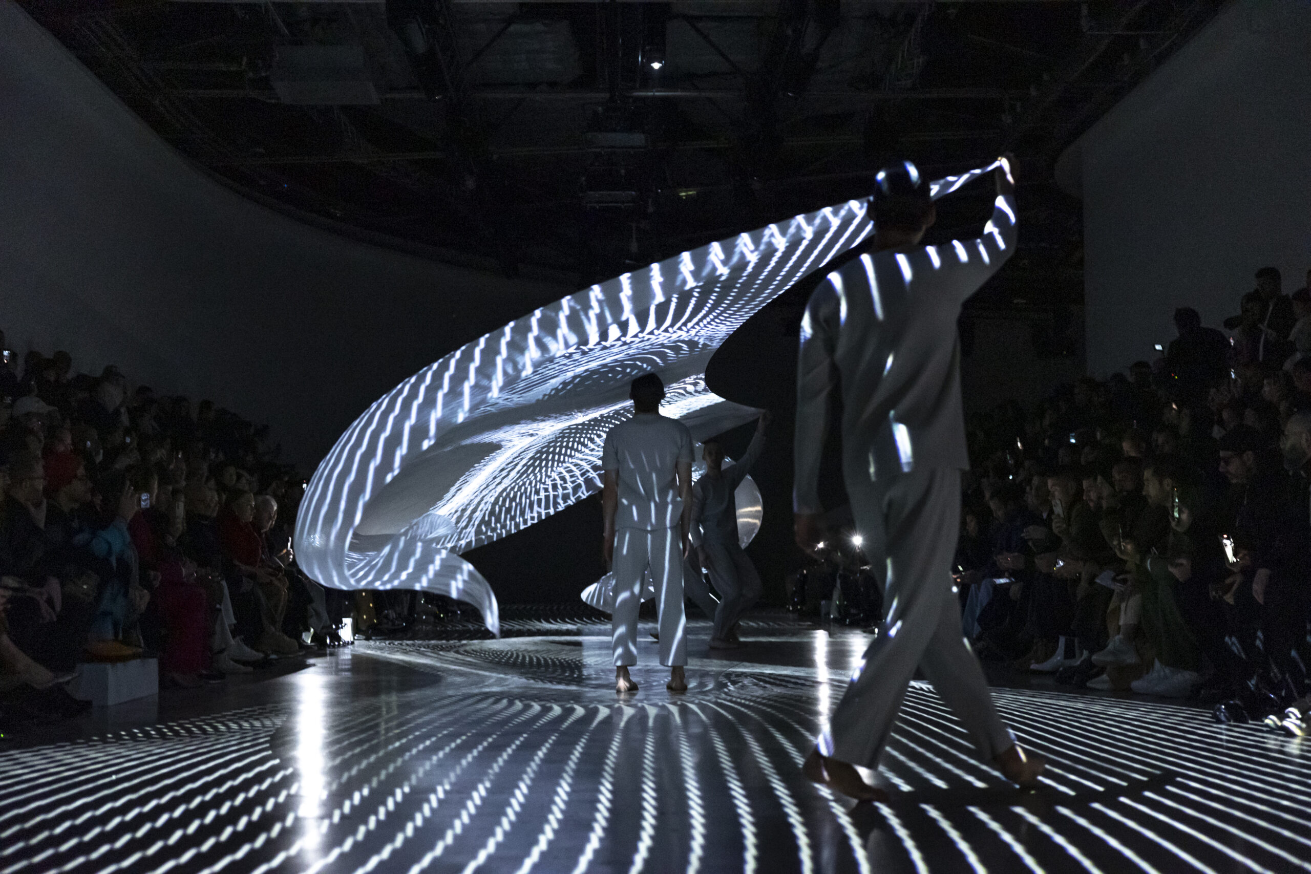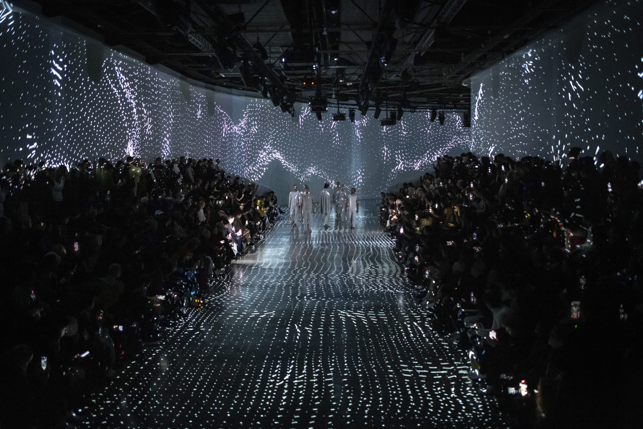 Le défilé a été réalisé par Adrien M & Claire B, une compagnie française d’arts visuels et de performance, dont l’installation vidéo immersive transforme le lieu en un monde qui brouille notre perception de l’espace et de la gravité. Une membrane fluide, comme une rivière imaginaire de myriades de particules, apparaît et disparaît en répondant au rythme de chants mystérieux. Elle palpite, ondule, se répand, se froisse et se déploie, créant des moments d’étrangeté en émergeant et en disparaissant.