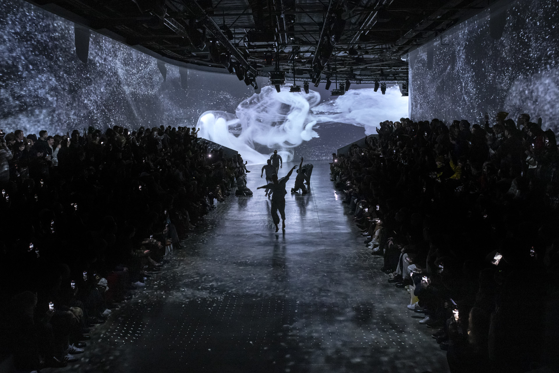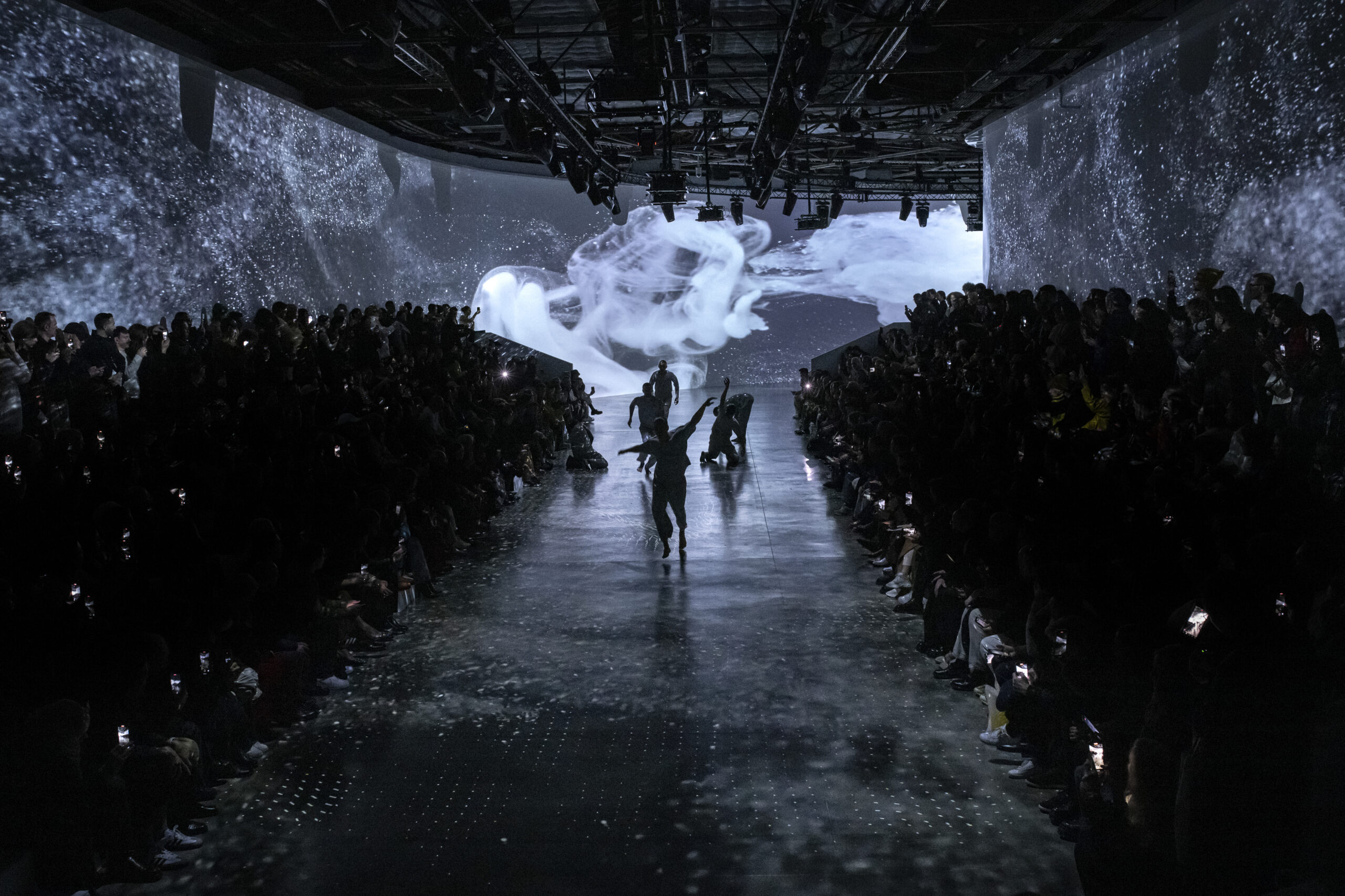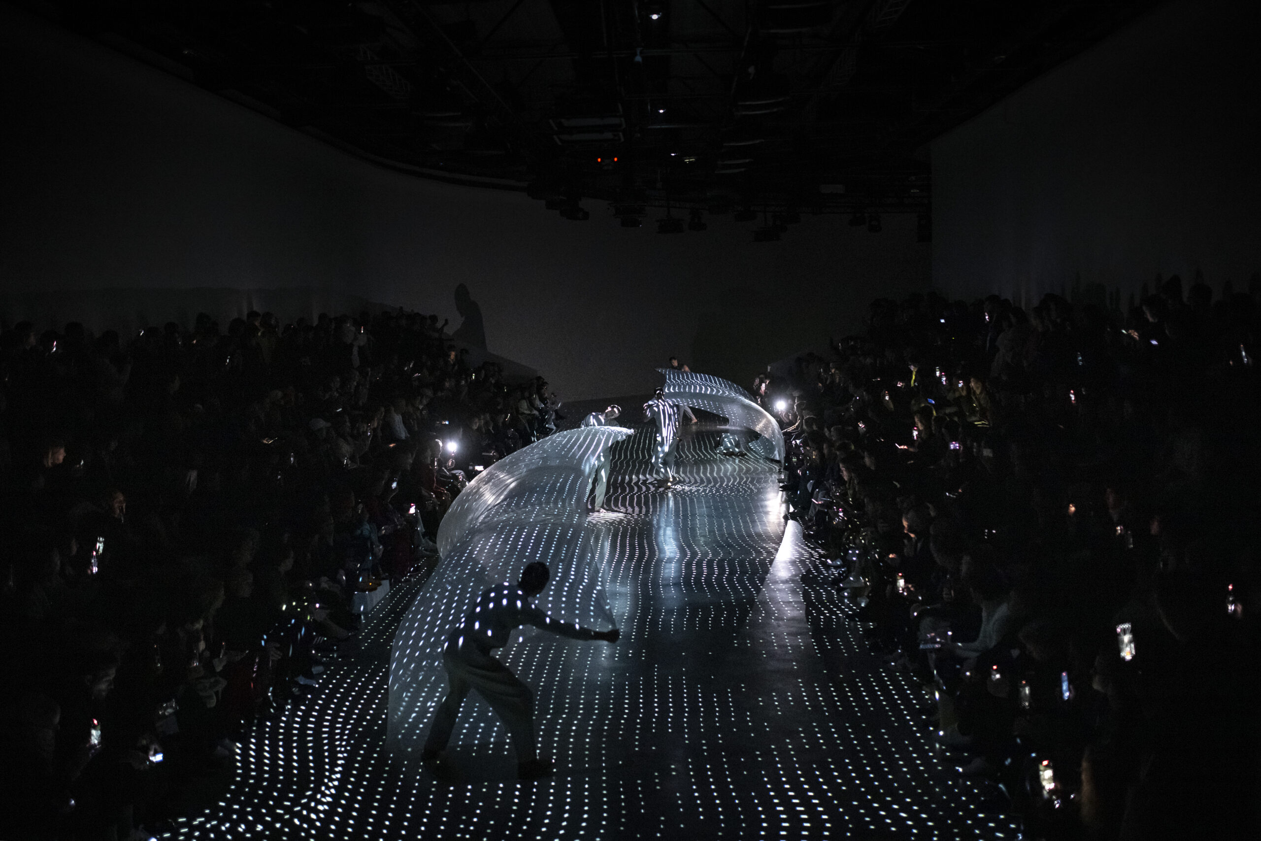 Le défilé a été réalisé par Adrien M & Claire B, une compagnie française d’arts visuels et de performance, dont l’installation vidéo immersive transforme le lieu en un monde qui brouille notre perception de l’espace et de la gravité. Une membrane fluide, comme une rivière imaginaire de myriades de particules, apparaît et disparaît en répondant au rythme de chants mystérieux. Elle palpite, ondule, se répand, se froisse et se déploie, créant des moments d’étrangeté en émergeant et en disparaissant.