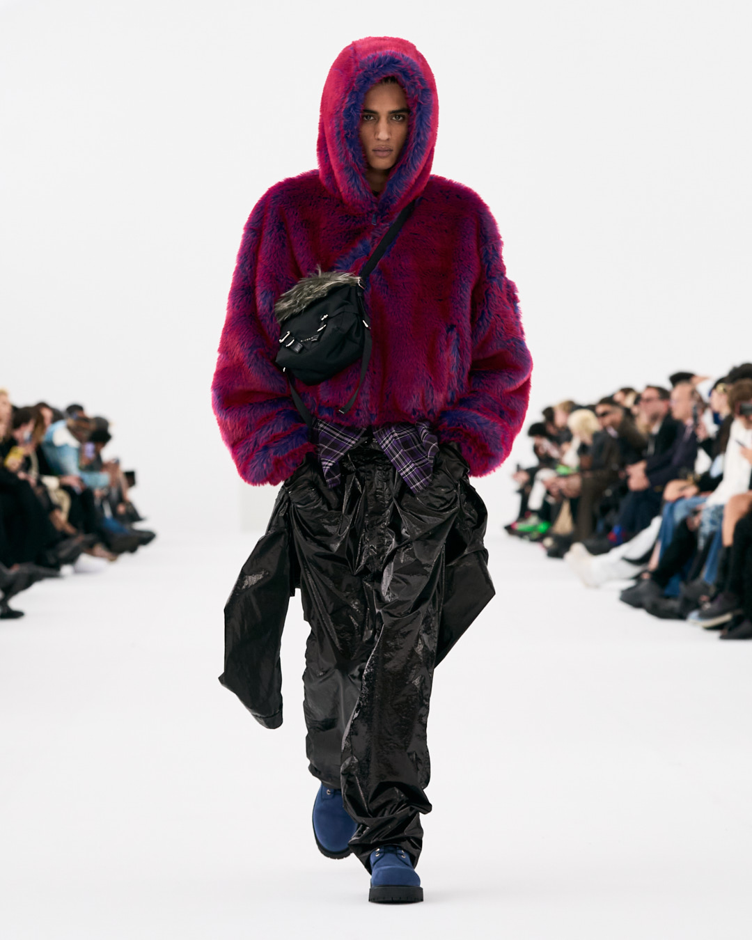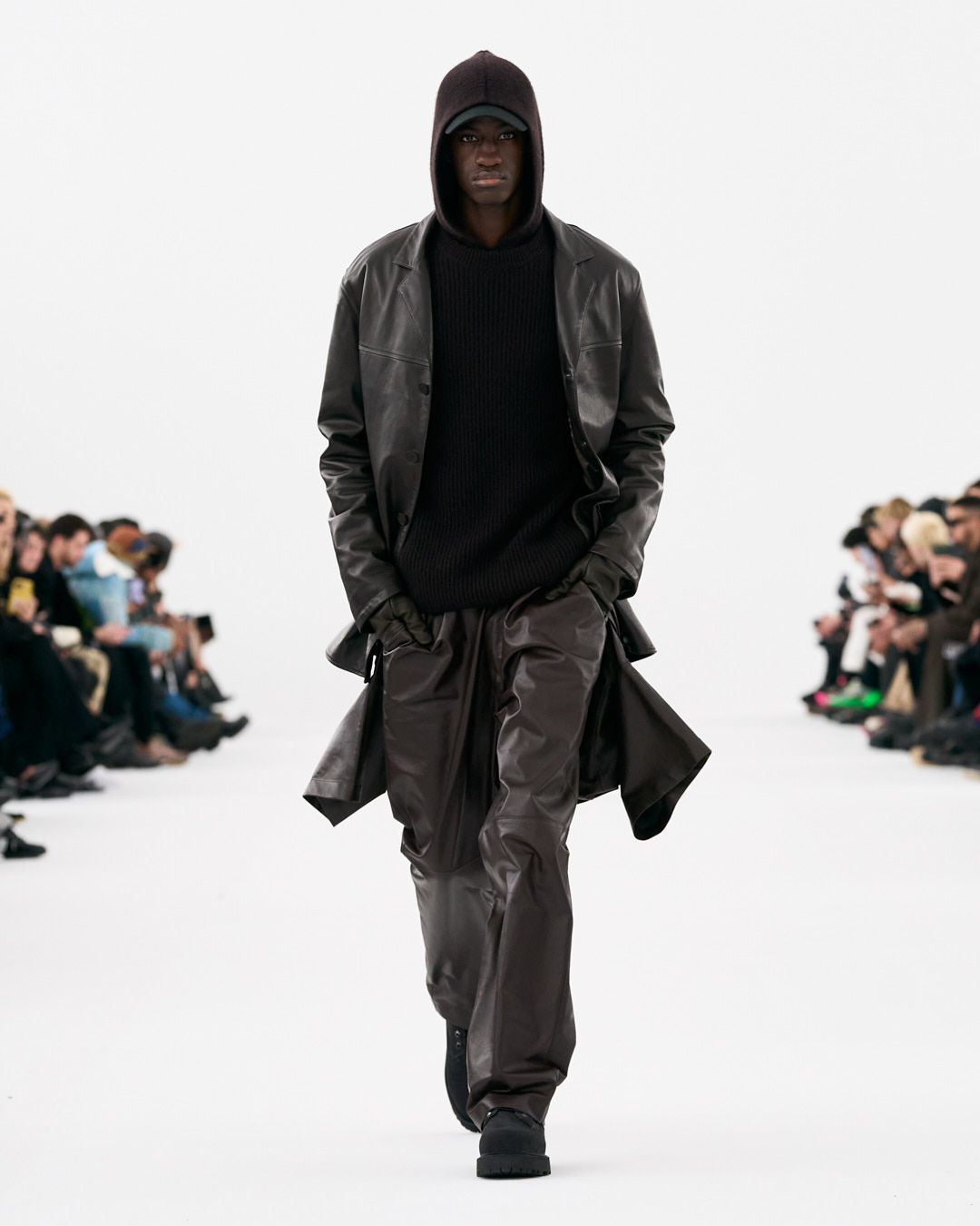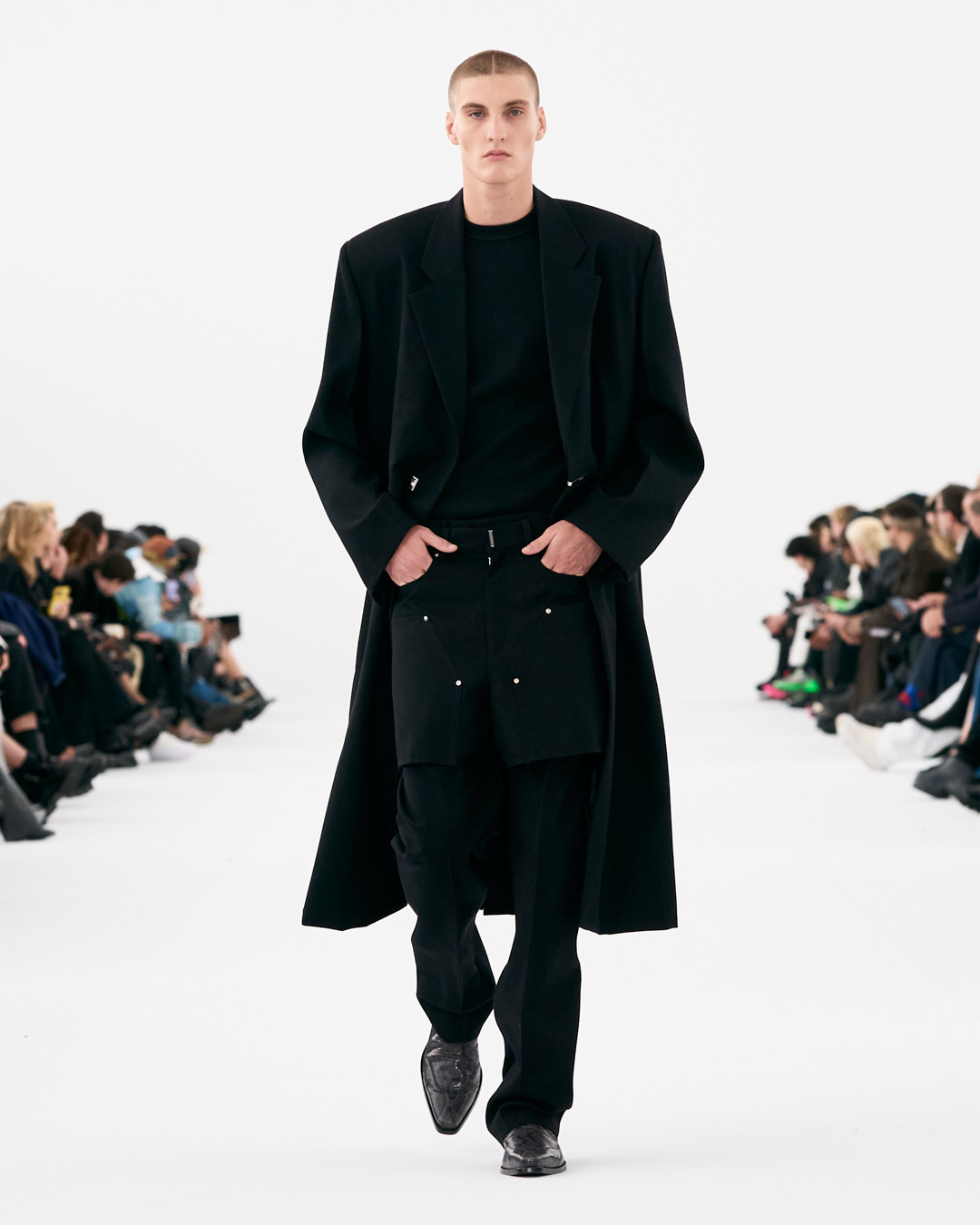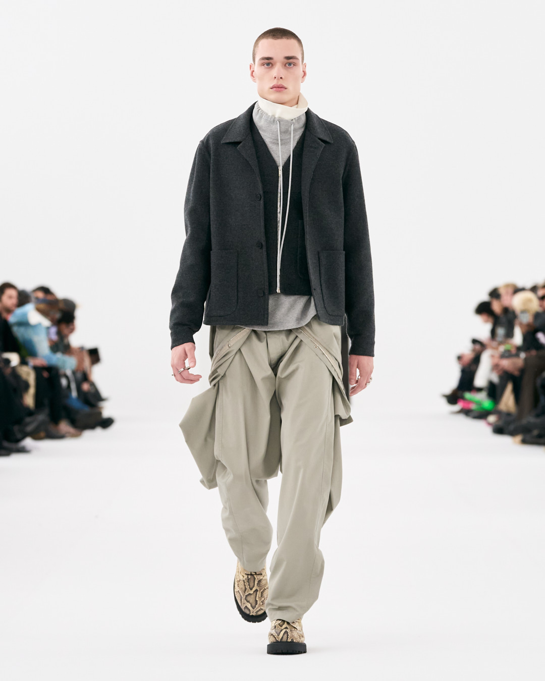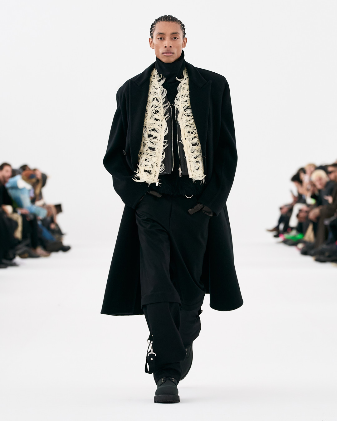 La réflexion sur l’individualité se manifeste dans une étude du sur-mesure, aussi bien pratique que proverbiale: des archétypes déconstruits et reconstruits comme proposition pour les personnages à facettes multiples qui les porteront. Le thème résonne dans une bande-son composée et enregistrée pour le spectacle par le musicien de rock indépendant britannique Bakar dans les jours précédant sa présentation. Présentée dans une boîte optique blanche, la collection met en évidence les approches techniques et artisanales employées dans la transformation des vêtements et des accessoires, magnifiant la coupe radicale, les traitements de tissus complexes et les décorations de surface complexes qui sous-tendent le processus.