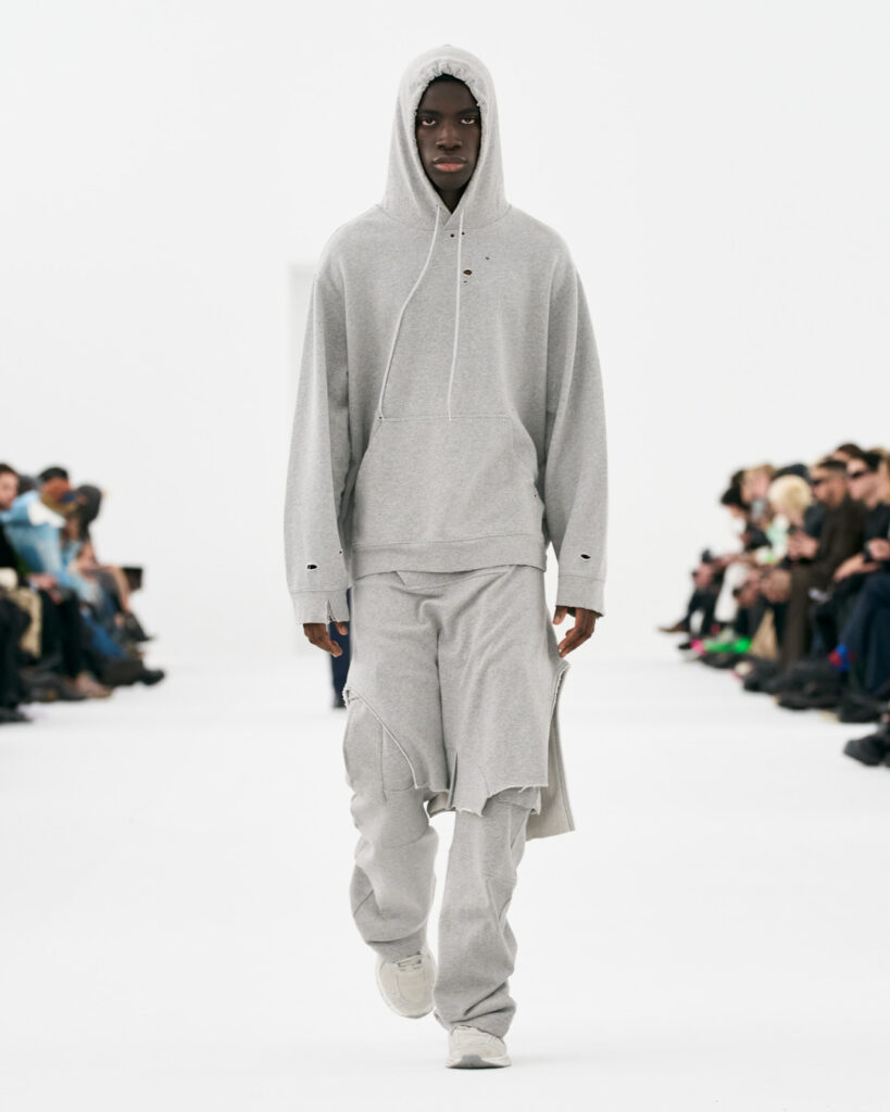 Le décorticage des formes classiques entraîne une déconstruction des vêtements de travail exprimée dans des pantalons cargo spontanément découpés et transformés en jupes portées sur des pantalons de jogging, réverbérés dans des kilts écossais et des salopettes laissées ouvertes. Le look évoque une photographie de Hubert de Givenchy dans les années 1960 où il porte un pull-over noué sans effort autour de son jean comme une jupe, alimentant encore plus l’idée de comment porter les choses: l’expression de soi à travers l’imprégnation de gestes personnels dans les vêtements. Cela inspire des sweat-shirts déconstruits pour pendre autour de la taille embrassés par leurs manches, une silhouette de soirée générationnelle qui ouvre la voie à une nouvelle formalité: un costume de toutes les occasions en tissus molletonnés.