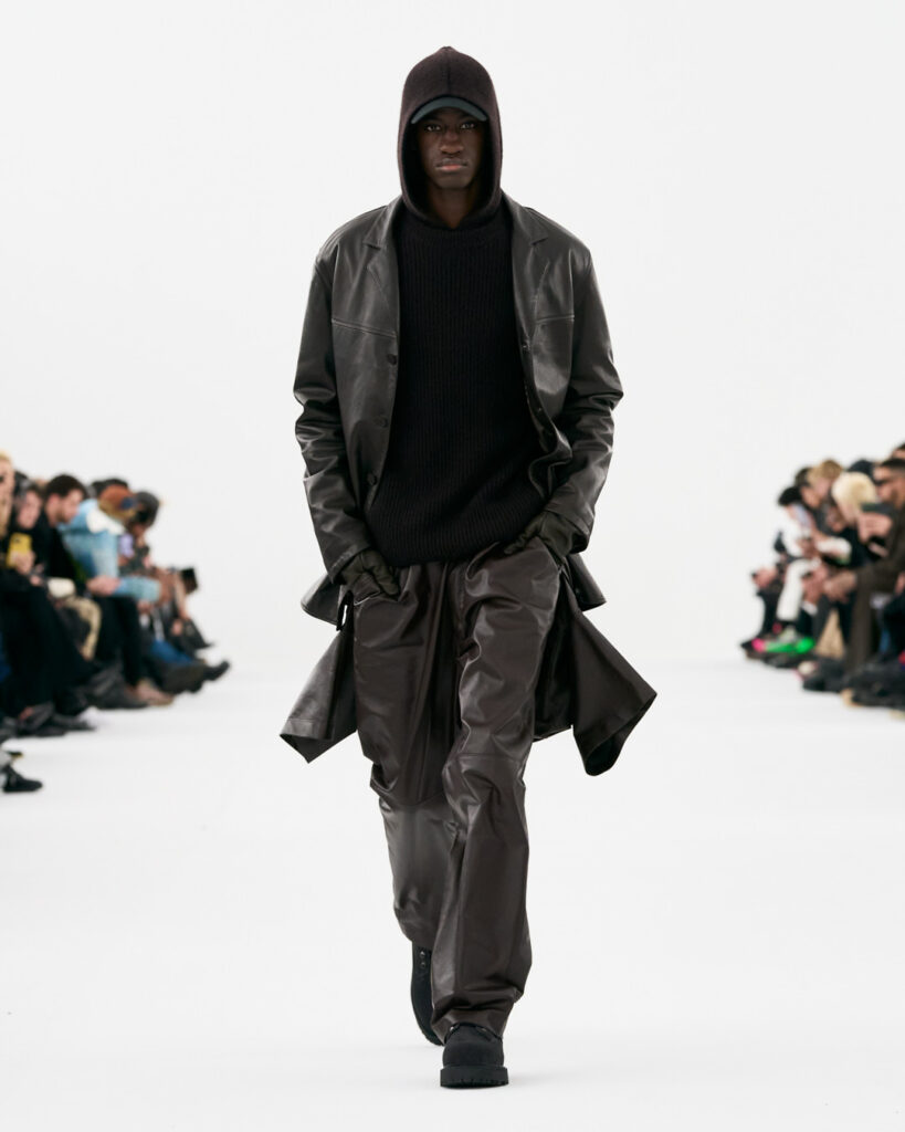 Les sacs s’adaptent aux formes féminines d’archives dans une conversation de code-switching : Pandora, un sac fourre-tout, est décontracté dans sa construction dans une dimension d’épaule en bandoulière ou un sac d’homme coupé sous le bras et interprété dans les matériaux de la collection. Ceux-ci résonnent dans un sac messager Voyou avec des détails de sangle créés dans une proportion agrandie ou une édition très minimisée dont la fausse fourrure déborde de la doublure. L’idée est réévoquée dans les gants, complétés par des bagues sculpturales. Les chaussures se concentrent sur les archétypes : une botte de travail agrandie en cuir et en toile lavée ; une chaussure formelle transformée en une botte de cowboy en cuir, en cuir verni ou en faux serpent ; des bottes en caoutchouc altérées avec du cuir gaufré en fibre de carbone ; et la basket TK-MX mise à jour dans les matériaux de la collection.