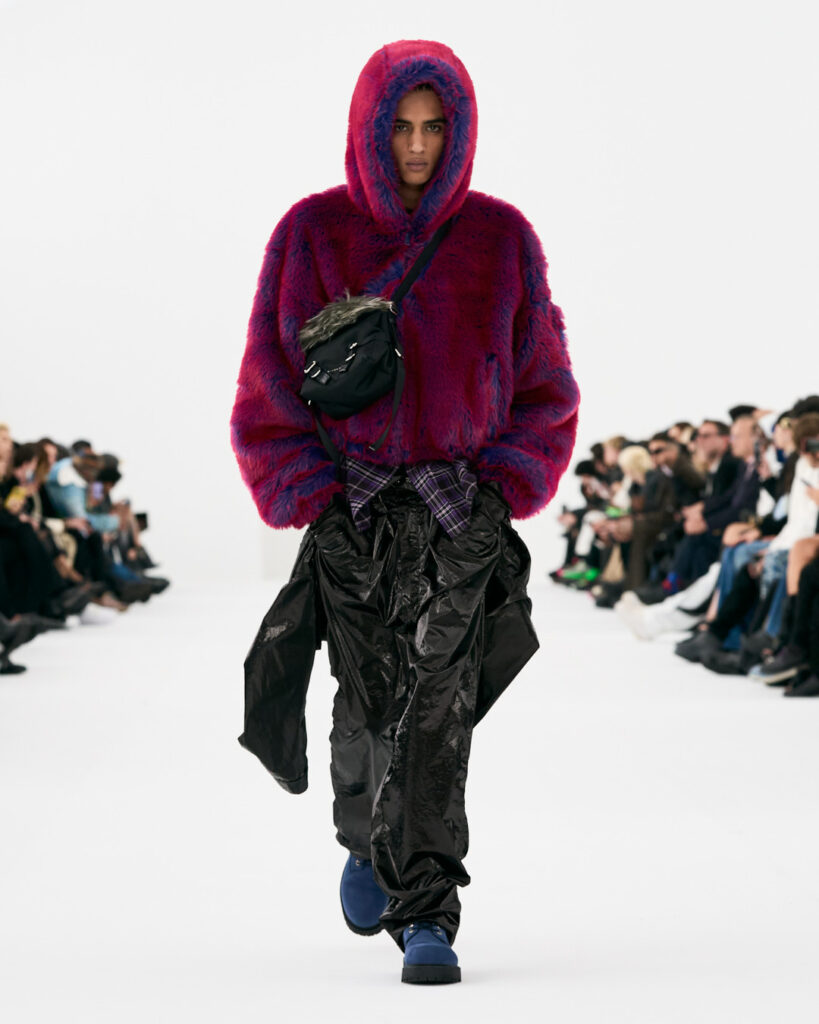 La personnalisation des codes vestimentaires prend forme dans la taille – comprenant quatre costumes noirs créés dans l’atelier de haute couture – défiant les coutures non cousues, permettant un processus de déroulement qui allonge la silhouette. La technique déclenche une étude des volumes qui débordent – désobéissant à la tradition du rentré – dans des looks superposés pour atteindre l’effet maximal de l’idée. Ils sont créés avec des sweat-shirts coupés ou avec des maillots délicats tirés serrés sur des couches baggy de vêtements de sport pour définir une silhouette élégante. En chemin, les tropes de la mode américaine abondent : les carreaux, les camouflages, les flammes, le denim, la toile blanchie, le marl gris, les néons et les pastels pour adolescents.