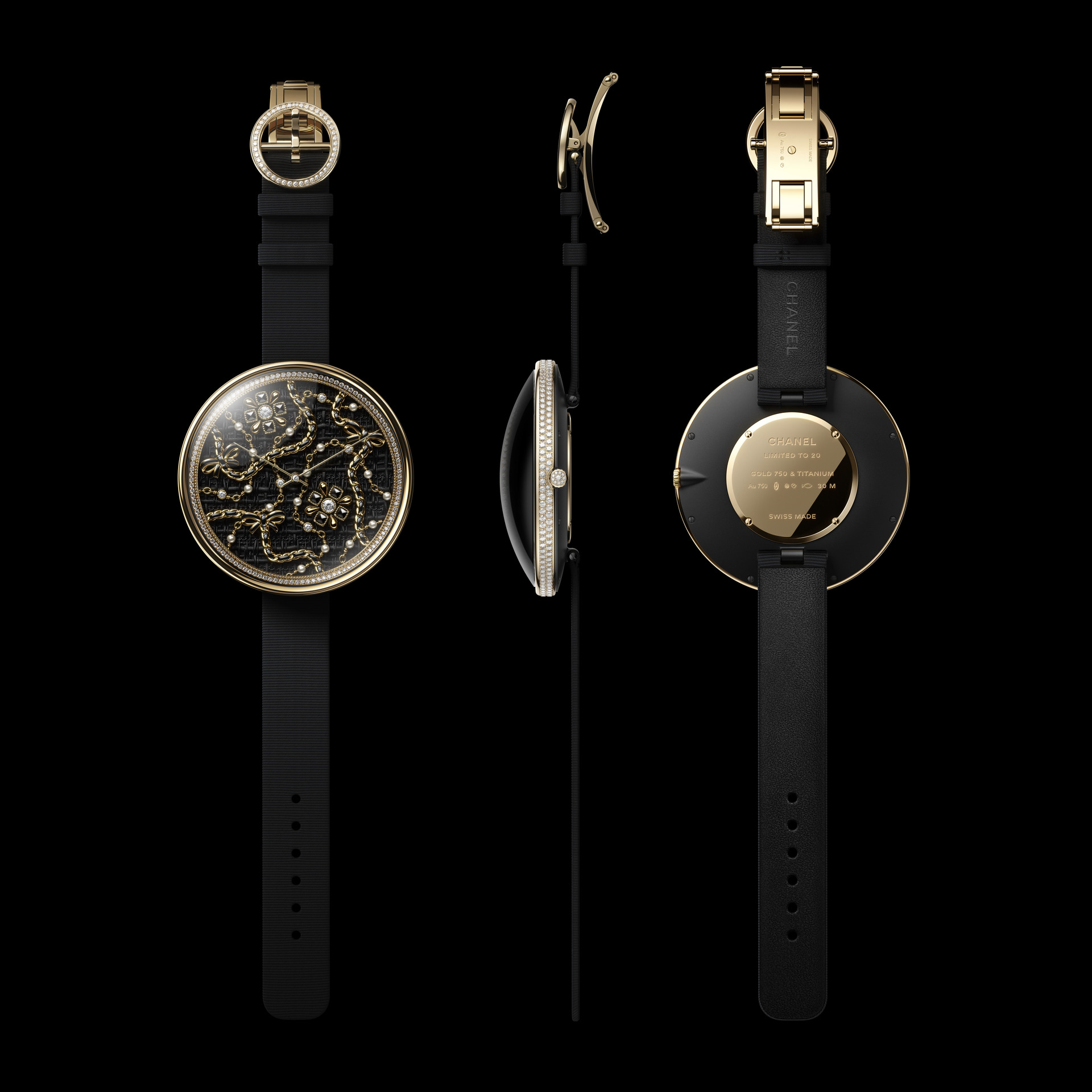 La montre Mademoiselle Privé Pique-Aiguilles se décline en cinq modèles, chacun racontant une histoire propre à CHANEL et à l’univers de la couture. La première montre, intitulée Décor Perles, évoque une envolée de bijoux en or jaune sculpté, laqué et serti, délicatement posés sur une plaque figurant un tweed noir en relief. Les quatre autres modèles, Décor Dentelle, Décor Tweed, Décor Broderie et Décor Matelassé, reprennent chacun un motif emblématique de la maison de couture pour le transposer sur le cadran de la montre.