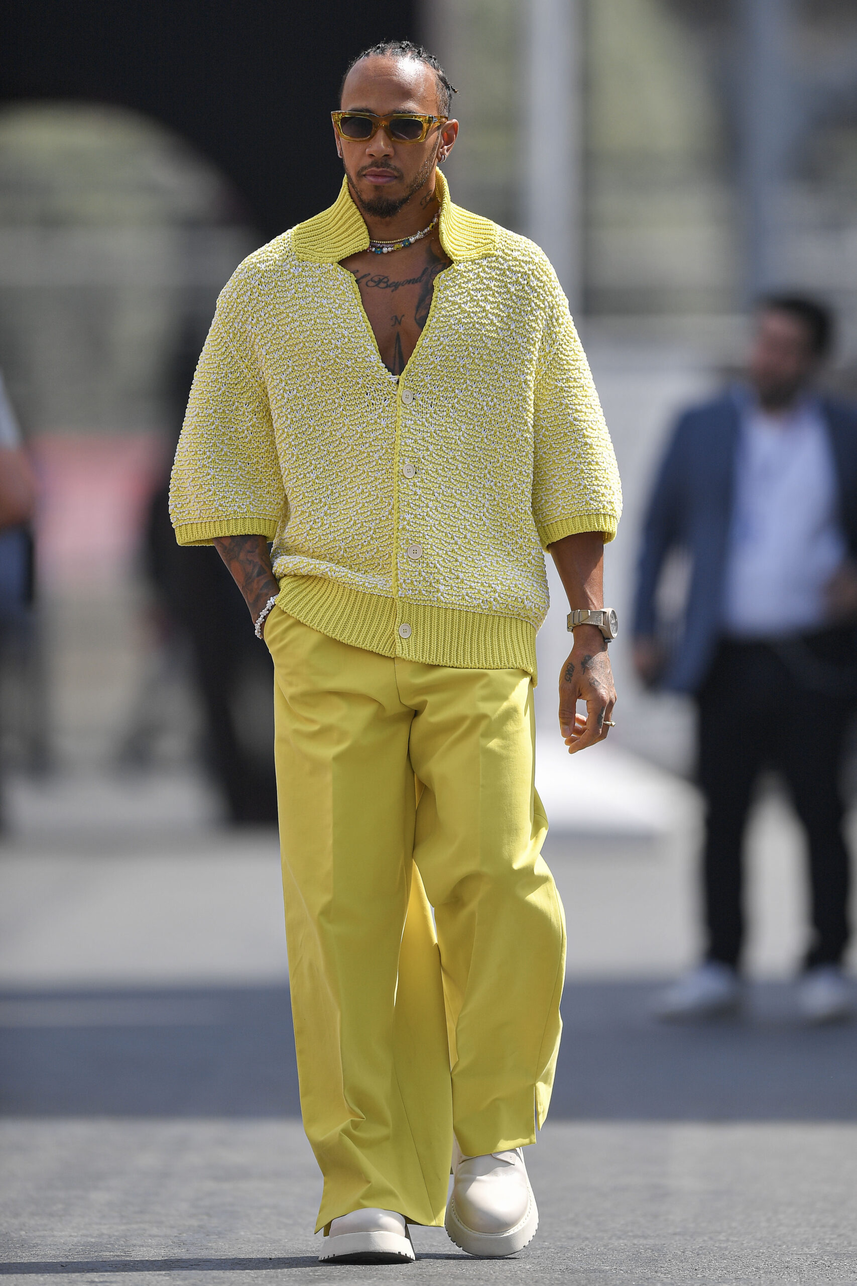 (Dubai, UAE – May 1, 2023) – Lewis Hamilton wore a ZEGNA SS23 yellow textured shirt and pants ahead of the F1 Grand Prix of Azerbaijan at Baku City Circuit on April 29.