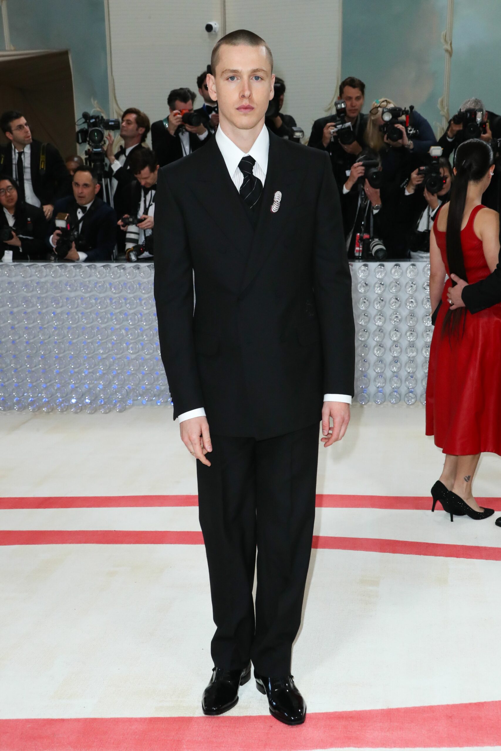 Harris Dickinson wore a custom black barathea double-breasted jacket, tailored waistcoat and evening trousers, paired with a white half-spread point collar shirt in needlepoint striped poplin, black chalkstripe fine Worsted wool tie and black handmade evening Oxford shoes. A Cartier Tank Must watch and pair of Cartier Tradition Ecus Comptes clip-brooches completed the look.