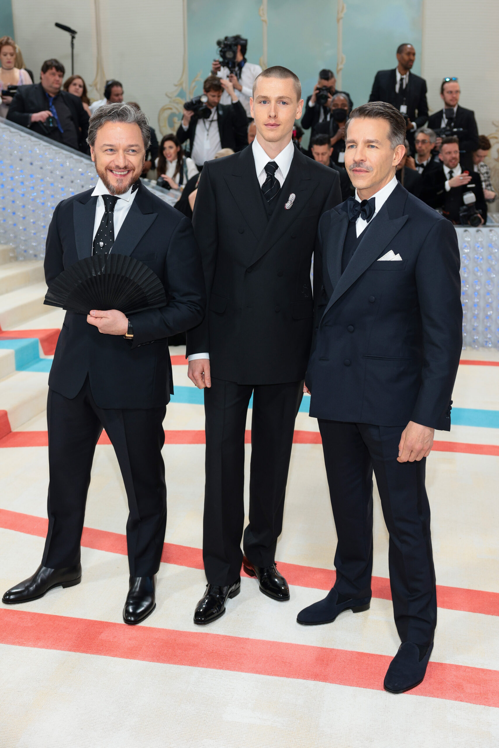 (L-R) James McAvoy, Harris Dickinson and Simon Holloway arrive for the 2023 Met Gala at the Metropolitan Museum of Art on May 1, 2023, in New York. – The Gala raises money for the Metropolitan Museum of Art’s Costume Institute. The Gala’s 2023 theme is « Karl Lagerfeld: A Line of Beauty. » (Photo by Angela WEISS / AFP) (Photo by ANGELA WEISS/AFP via Getty Images)