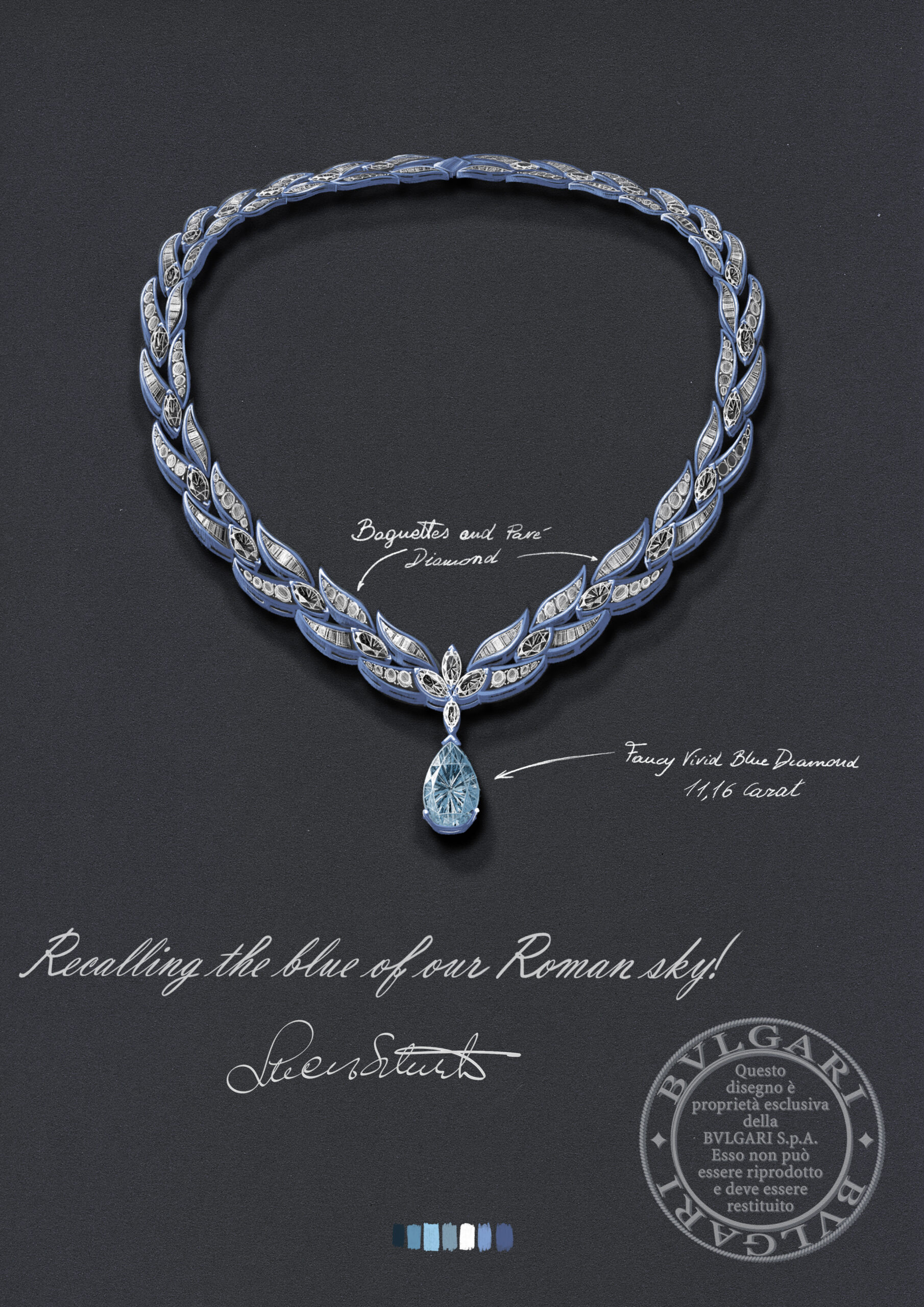 Le collier, qui met en vedette le diamant Laguna Blu de Bulgari, est une véritable merveille de l’artisanat joaillier. Les diamants entrelacés en platine, inspirés des couronnes de laurier portées par les empereurs de l’Antiquité, sont un hommage à la ville de Rome, berceau antique de Bulgari. Avec sa touche contemporaine de mouvement et de lumière, ce bijou exceptionnel rend les charmes de la Ville Éternelle plus modernes que jamais.