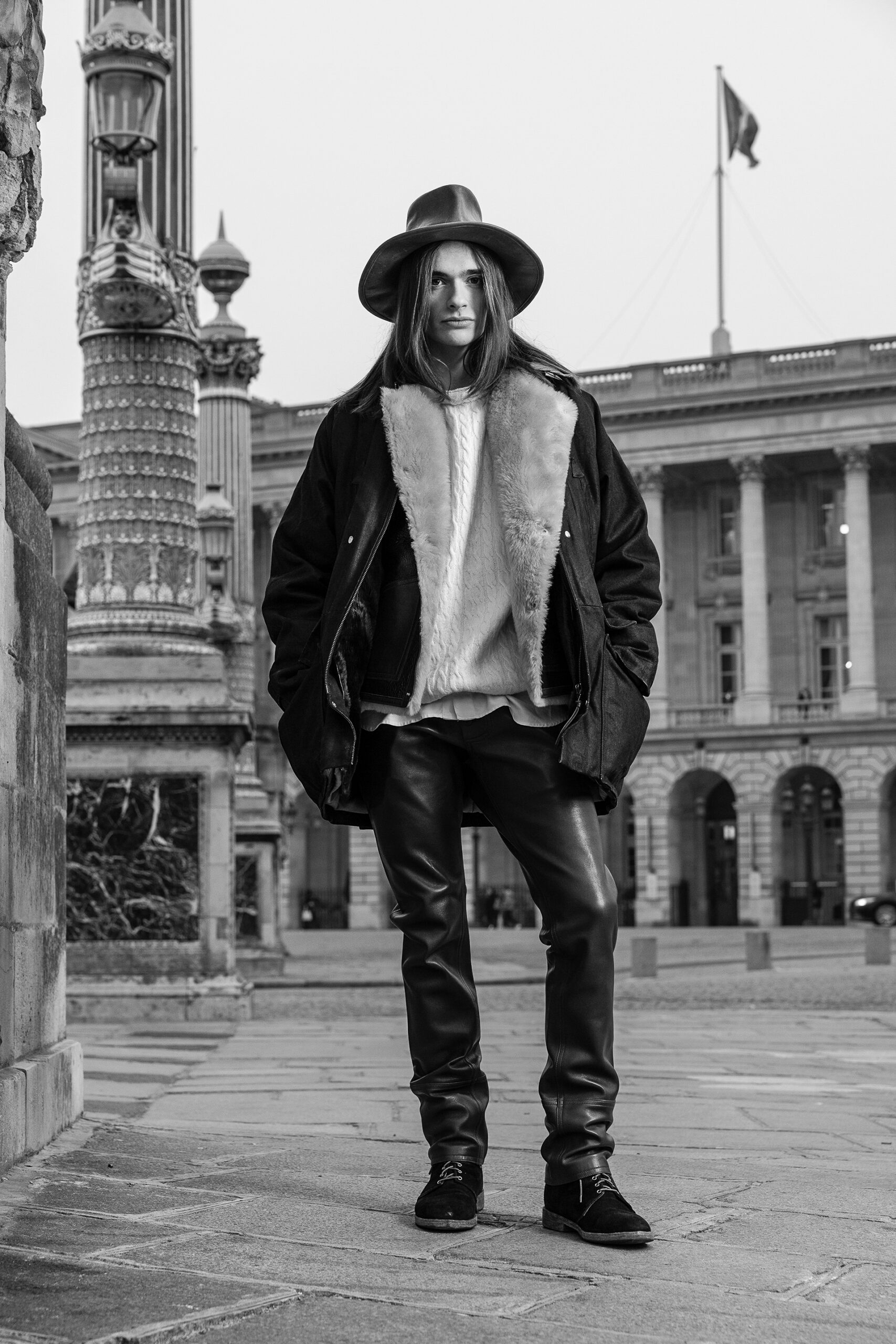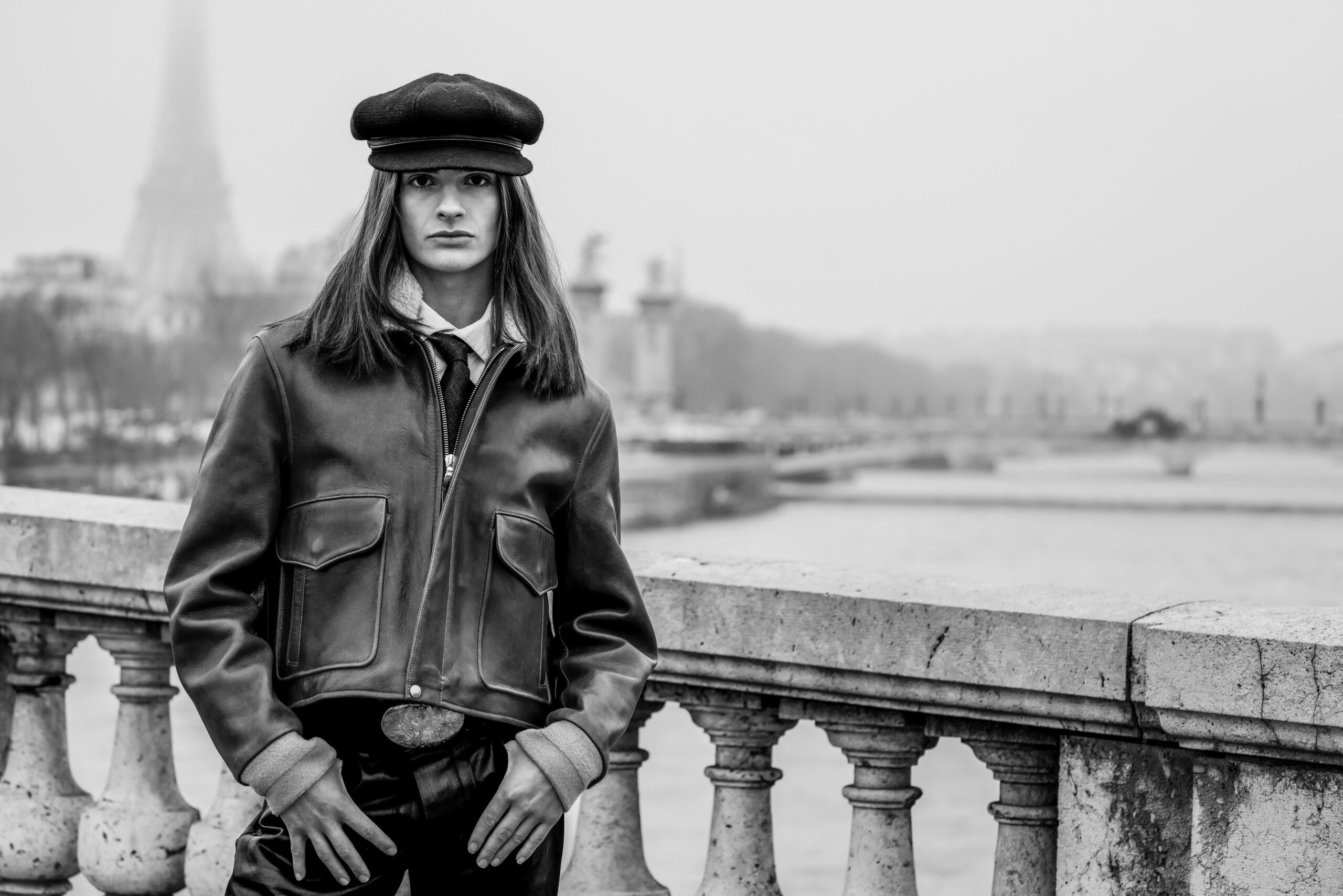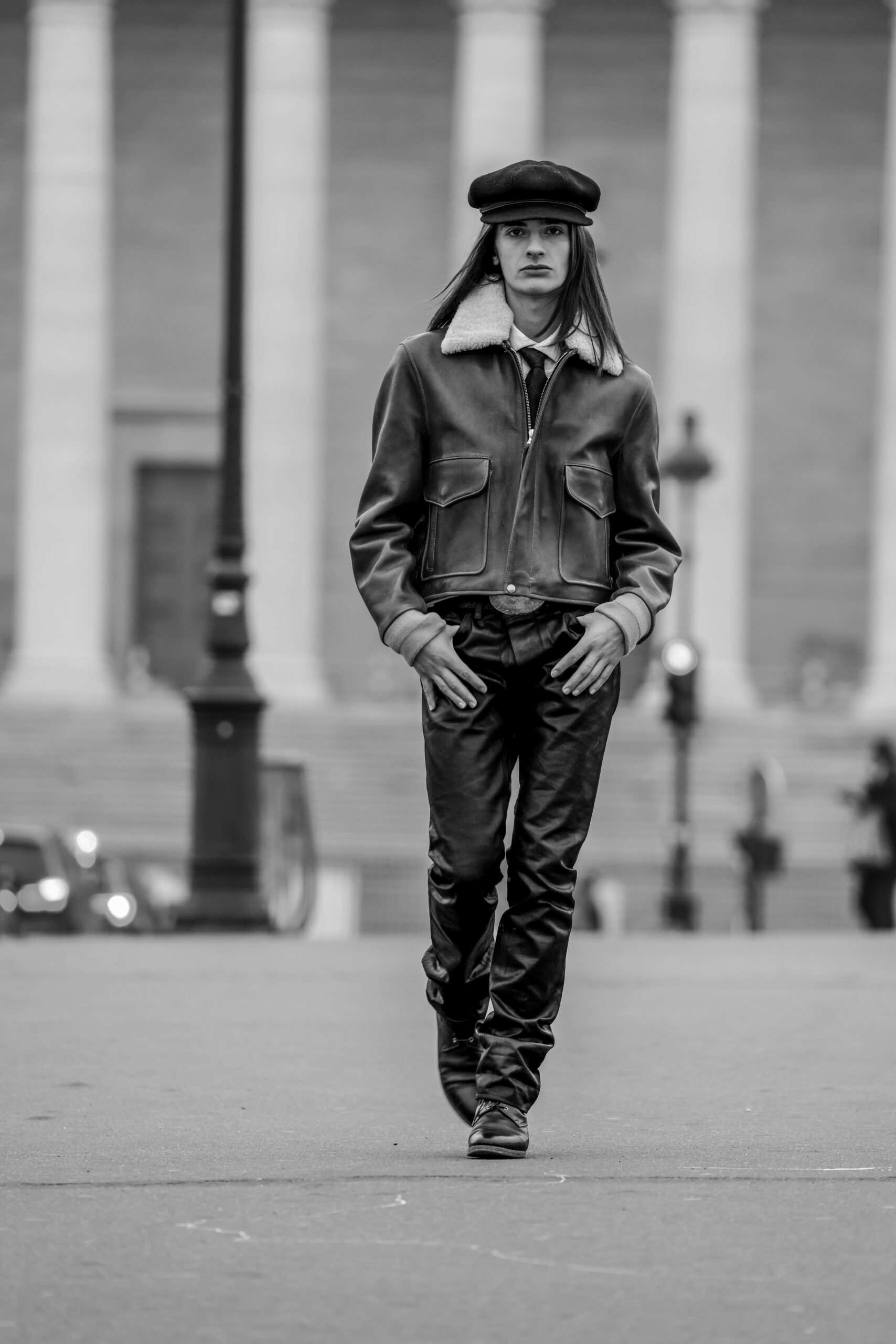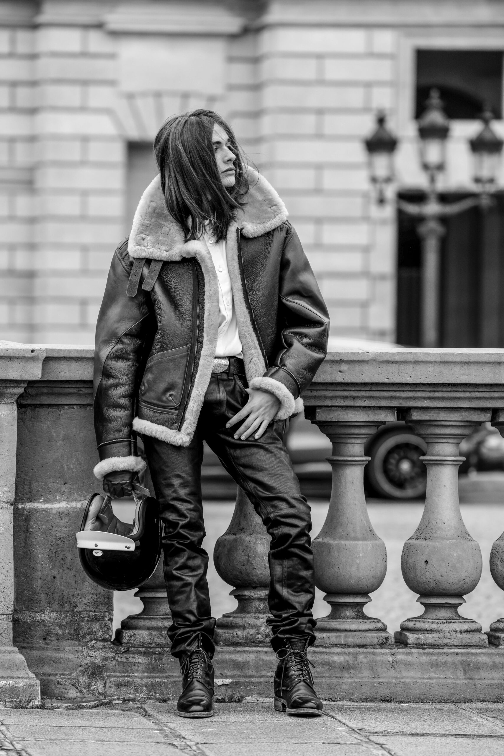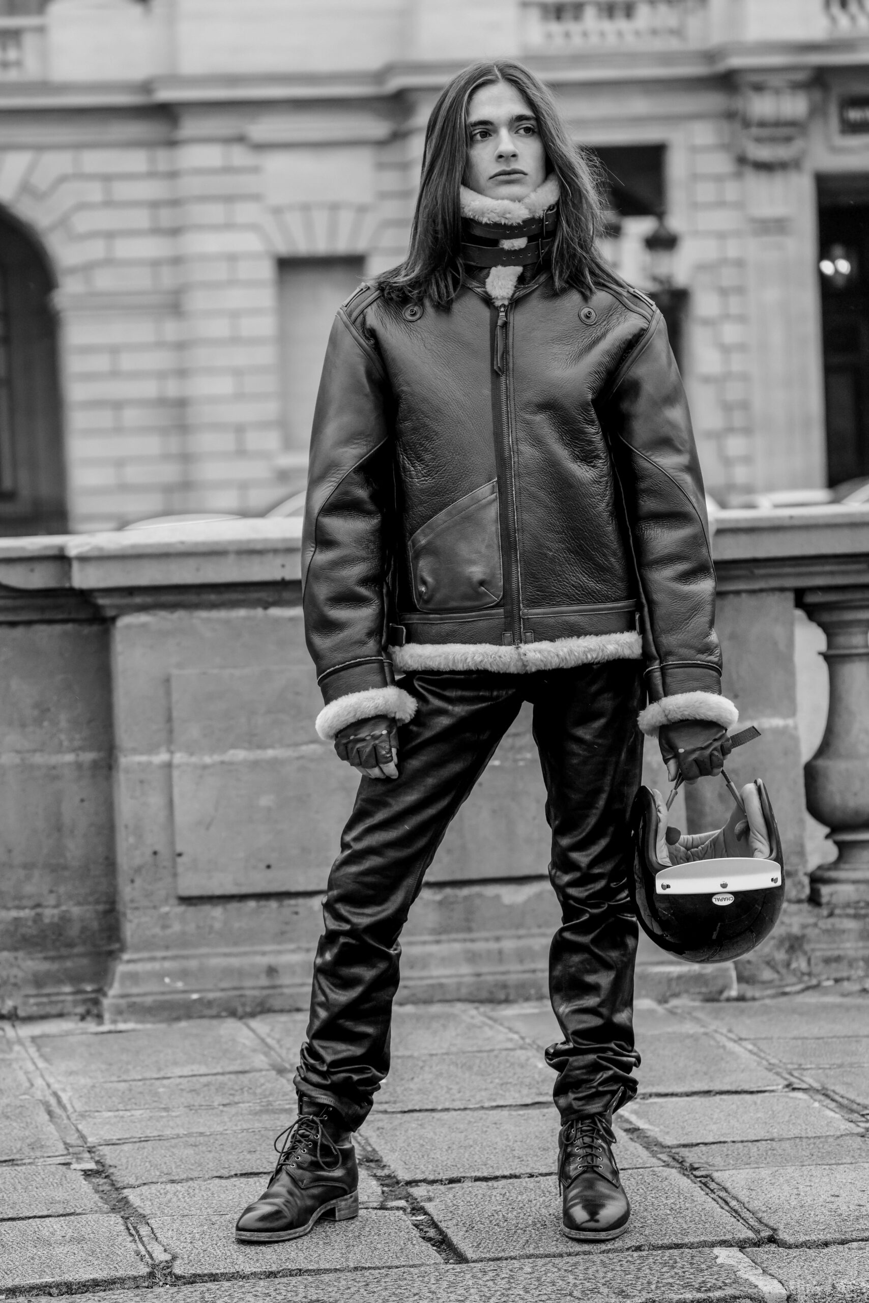 La place de la Concorde, à proximité du showroom parisien de la marque, sert de cadre idéal pour mettre en lumière cette nouvelle interprétation des pièces iconiques de CHAPAL. Gabriel, grâce à sa sensibilité, se fond dans cet univers et adopte ces blousons virils avec finesse et légèreté. La robustesse devient douceur et confort, tandis que l’aviateur se transforme en une délicate figure romantique.