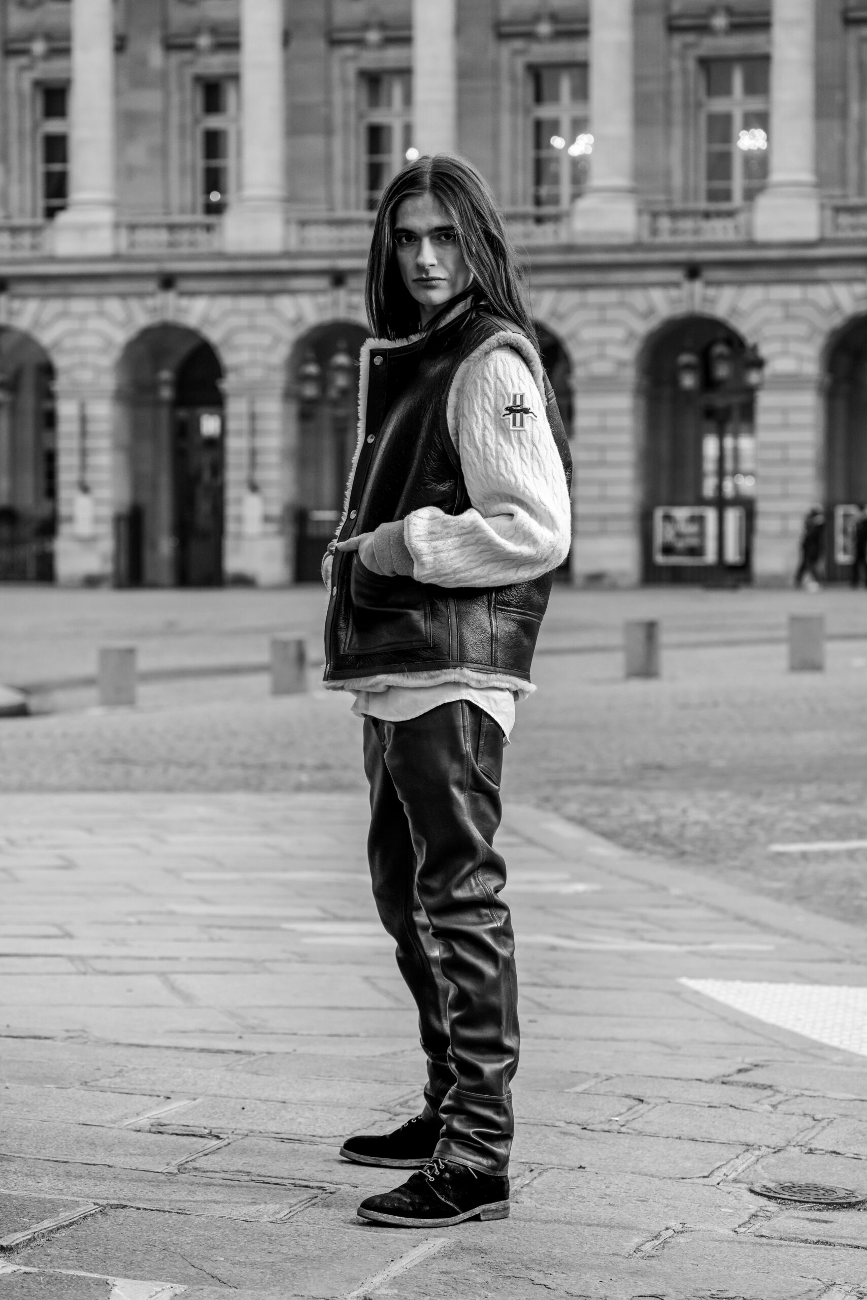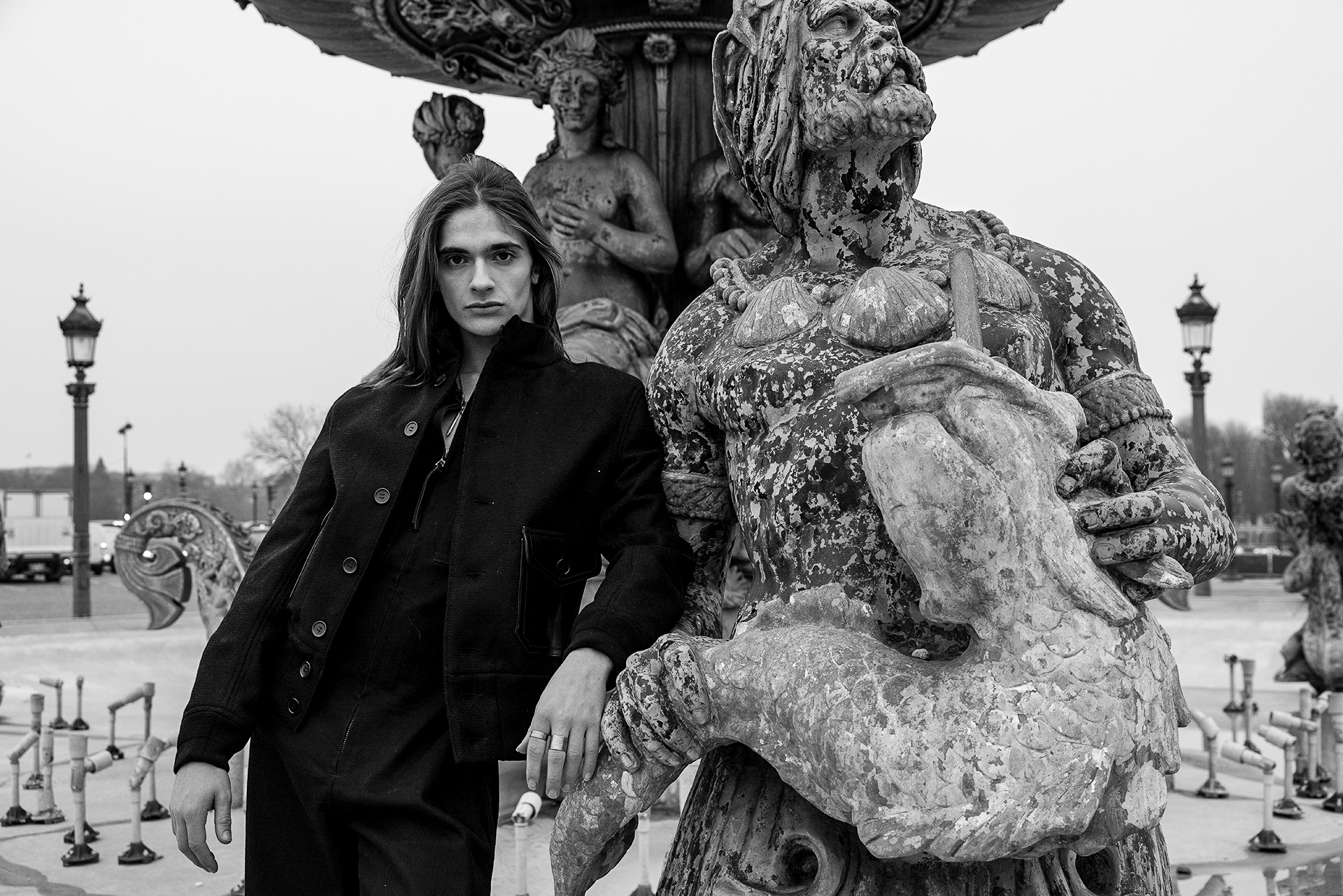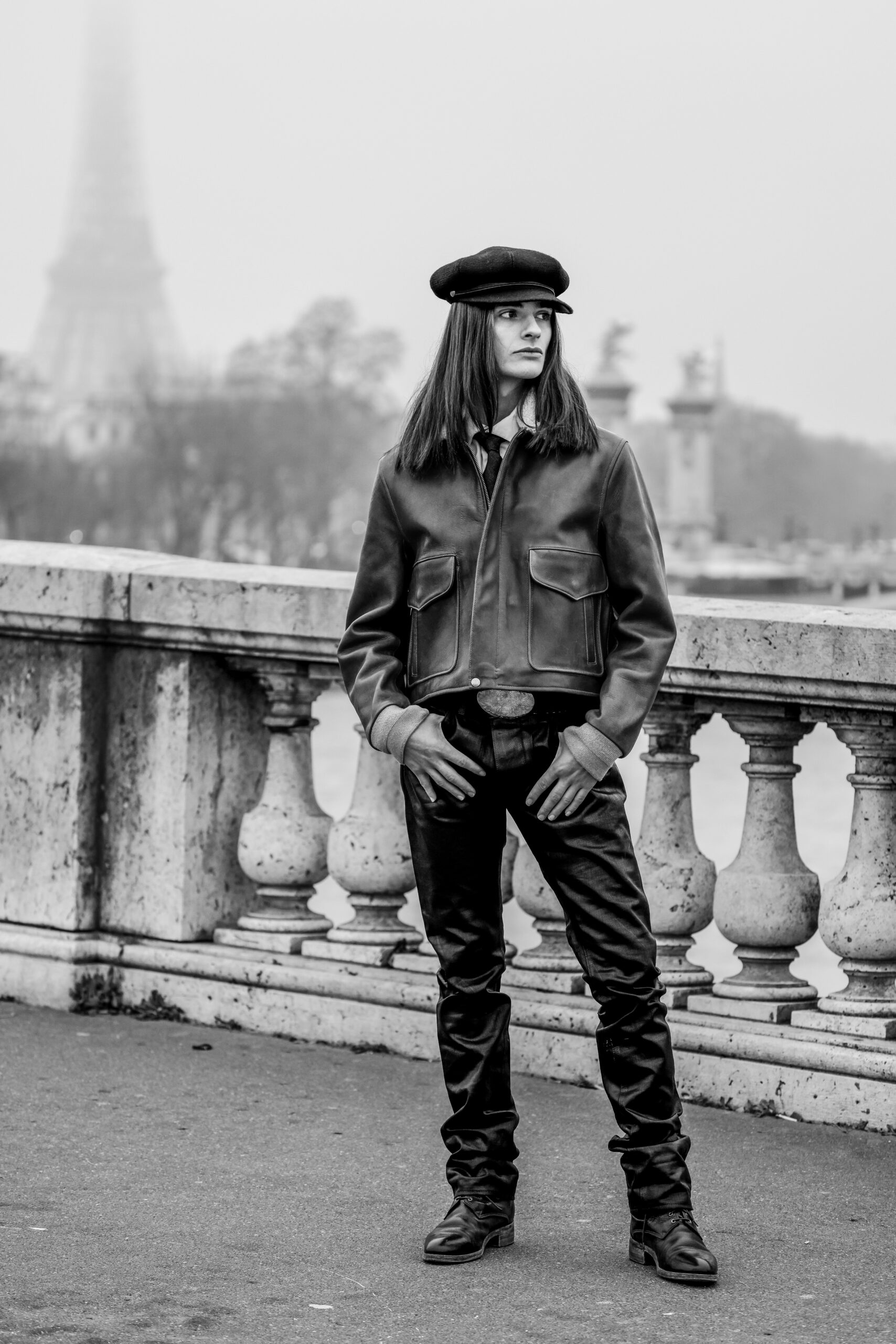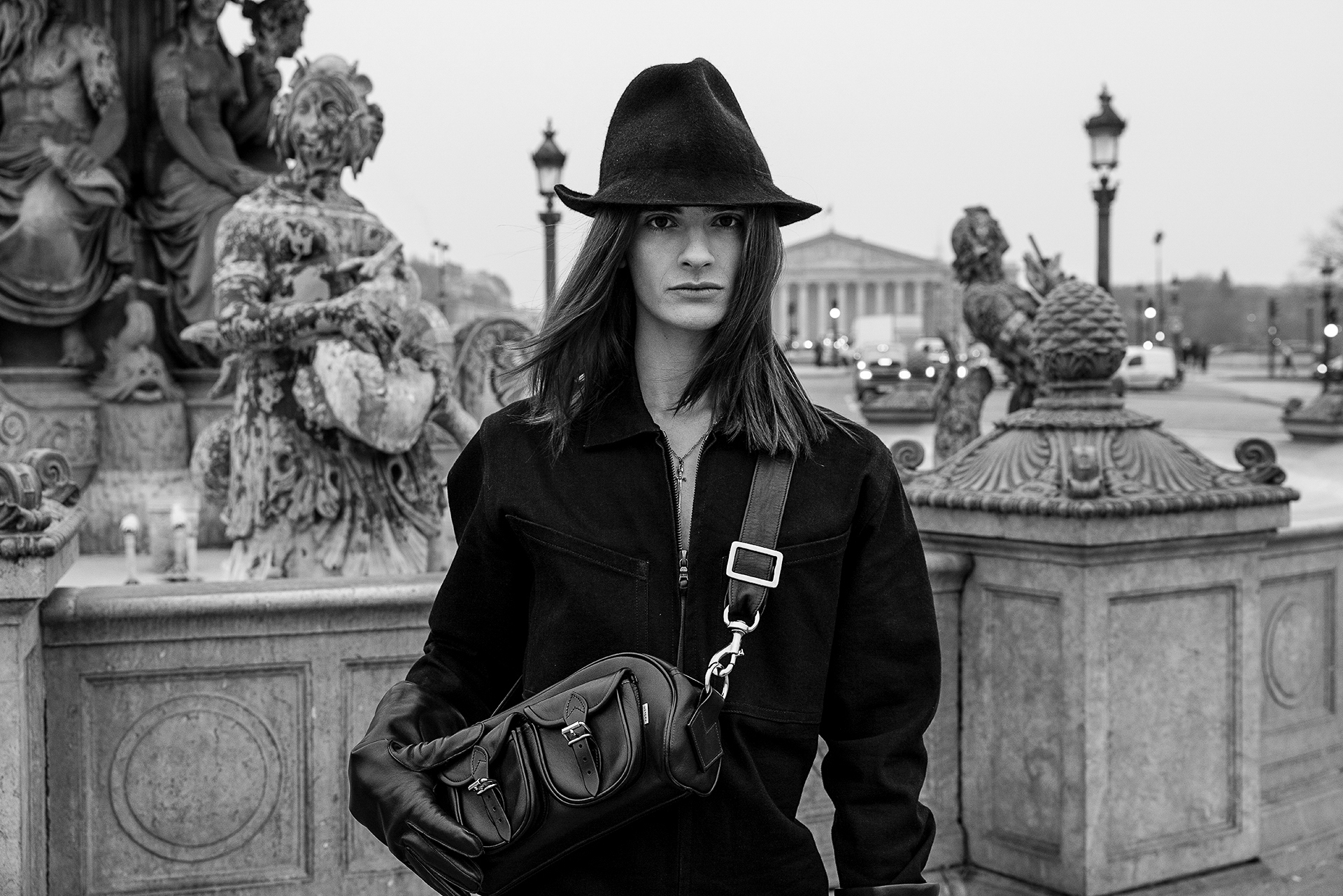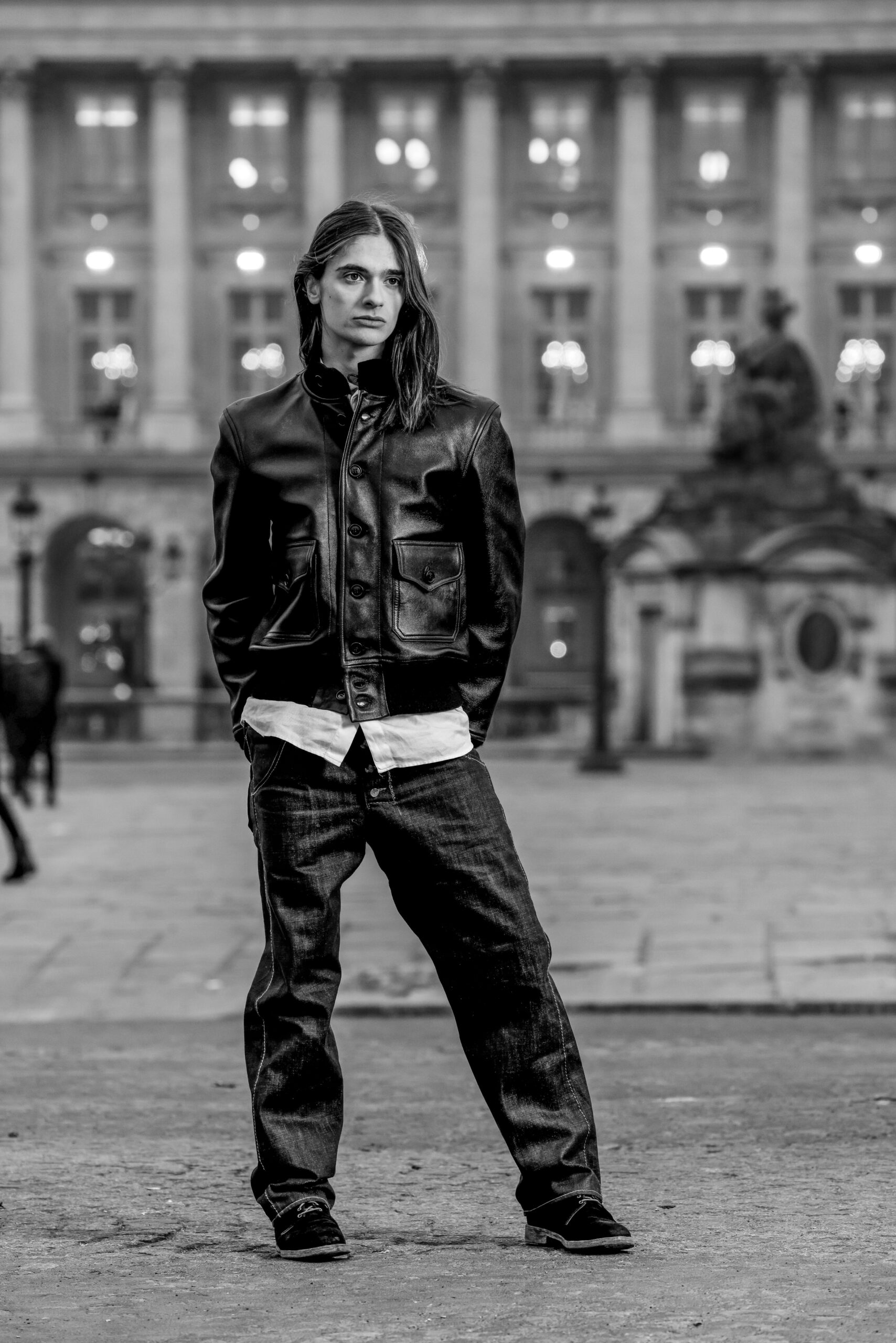 La place de la Concorde, à proximité du showroom parisien de la marque, sert de cadre idéal pour mettre en lumière cette nouvelle interprétation des pièces iconiques de CHAPAL. Gabriel, grâce à sa sensibilité, se fond dans cet univers et adopte ces blousons virils avec finesse et légèreté. La robustesse devient douceur et confort, tandis que l’aviateur se transforme en une délicate figure romantique.