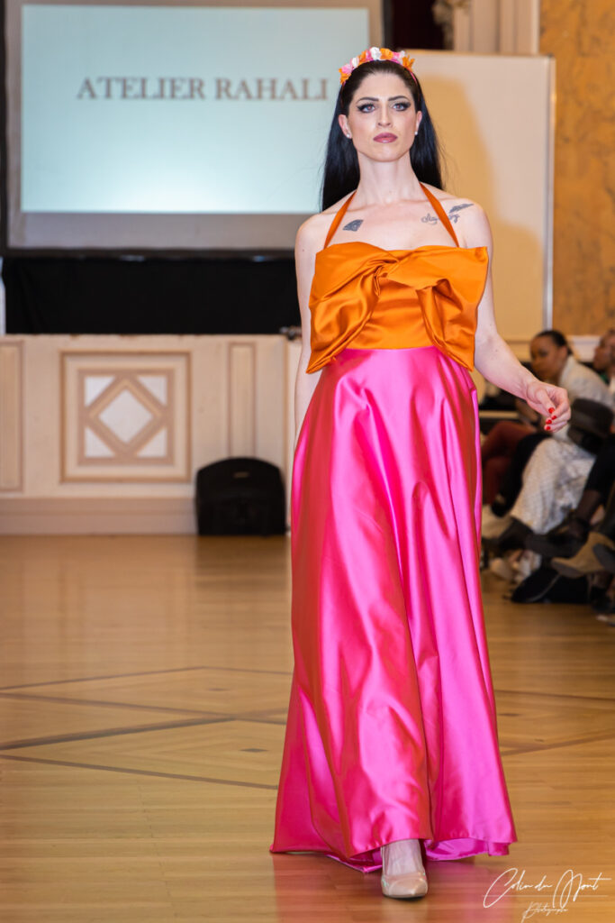 Myriam Rahali, créatrice haute couture sur-mesure, a présenté sa collection « Renaissance », inspirée de la mode des années 50 et 60. Elle est également une sportive de haut niveau en Jujitsu et aime jouer avec les matières pour travailler les formes et les contrastes.