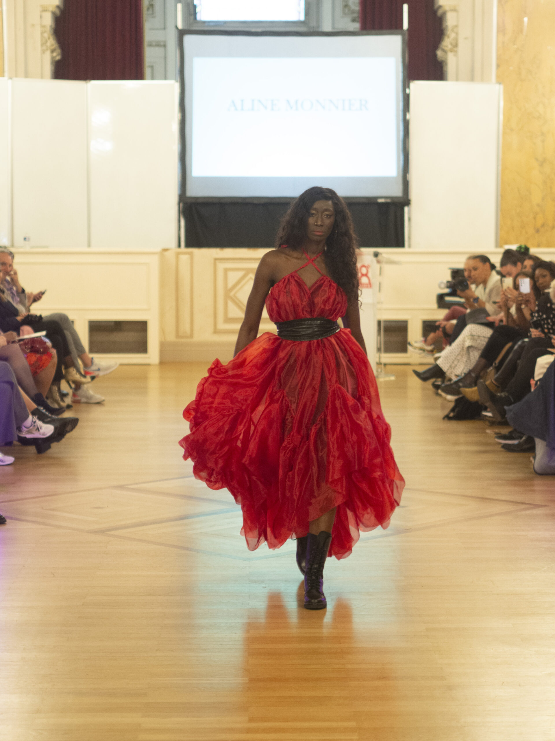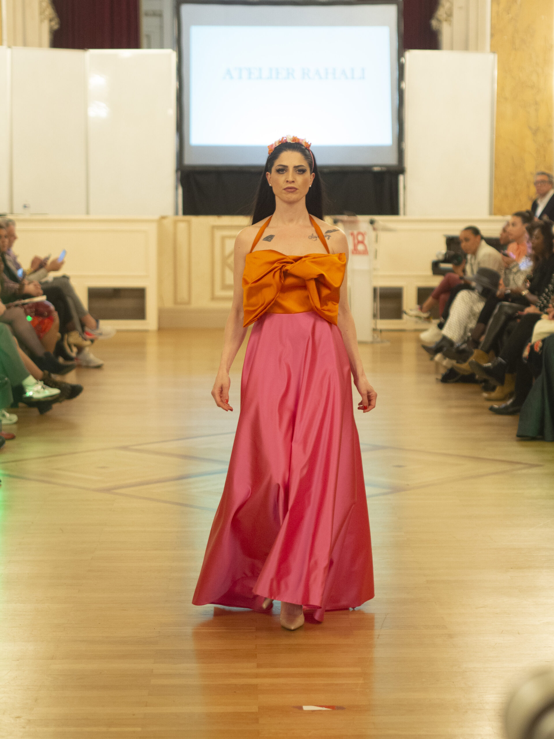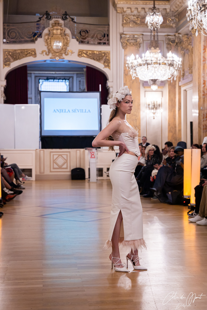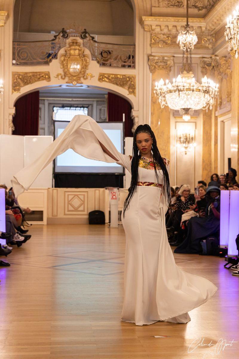 Myriam Rahali, créatrice haute couture sur-mesure, a présenté sa collection « Renaissance », inspirée de la mode des années 50 et 60. Elle est également une sportive de haut niveau en Jujitsu et aime jouer avec les matières pour travailler les formes et les contrastes.