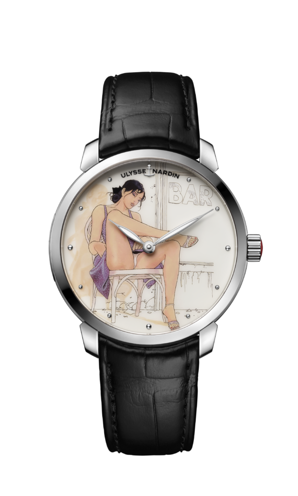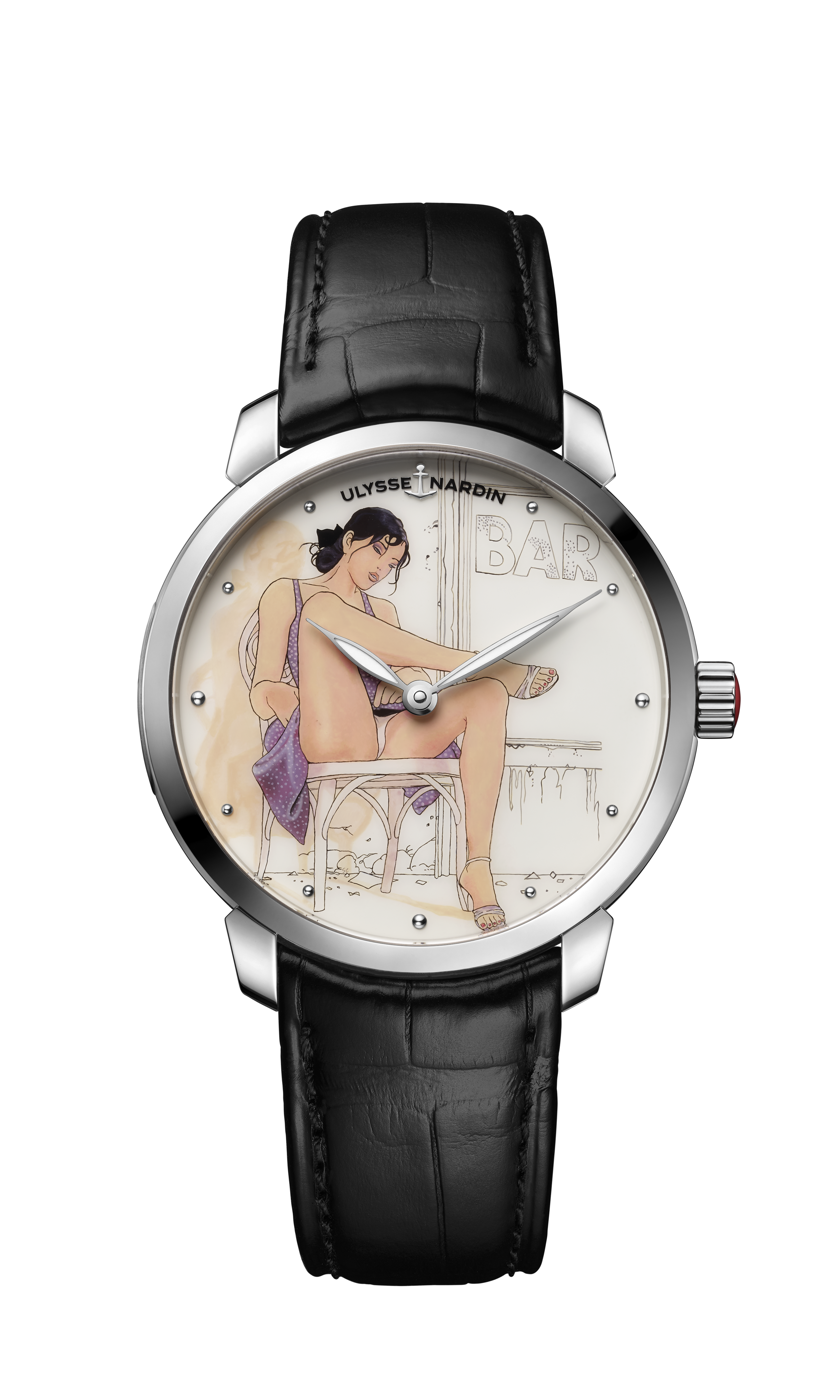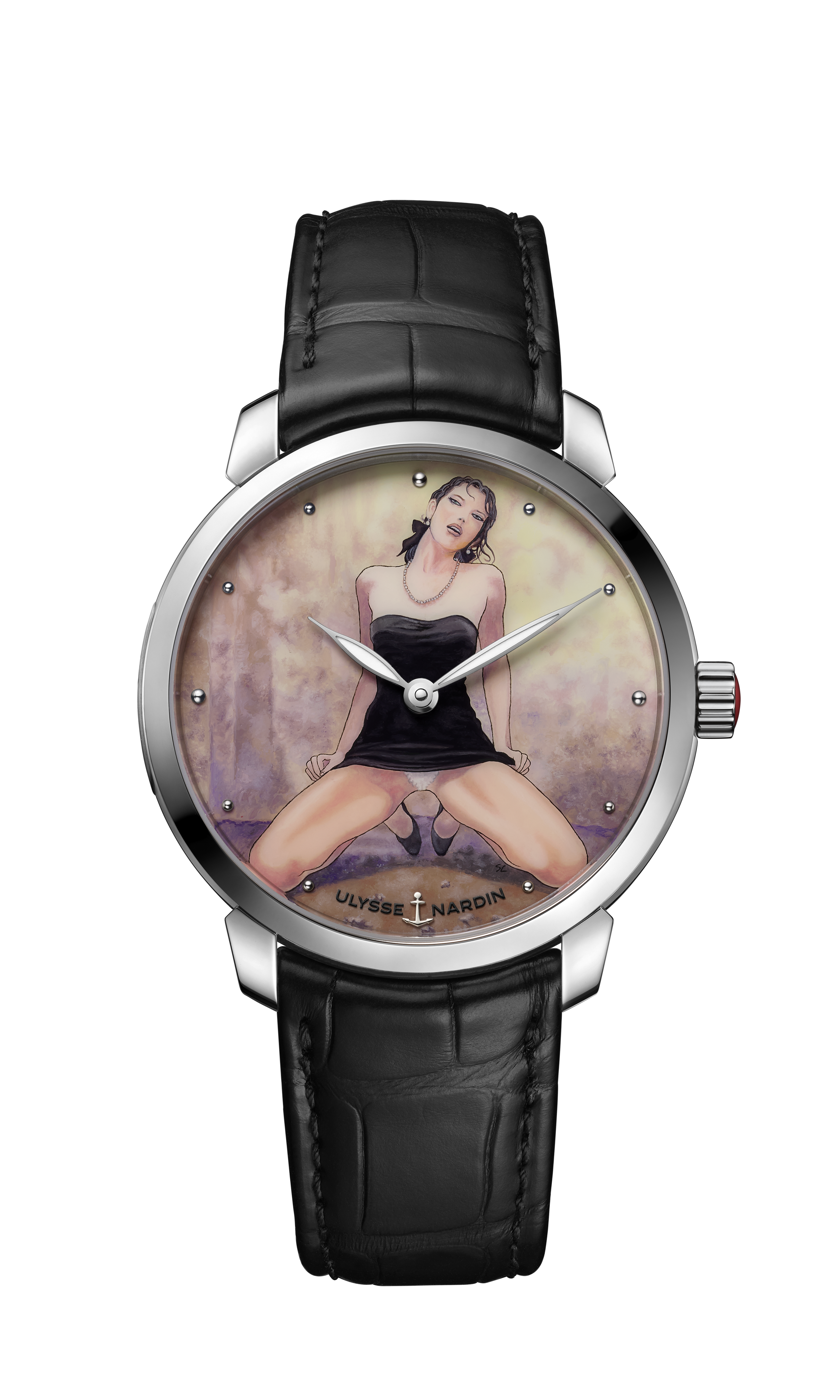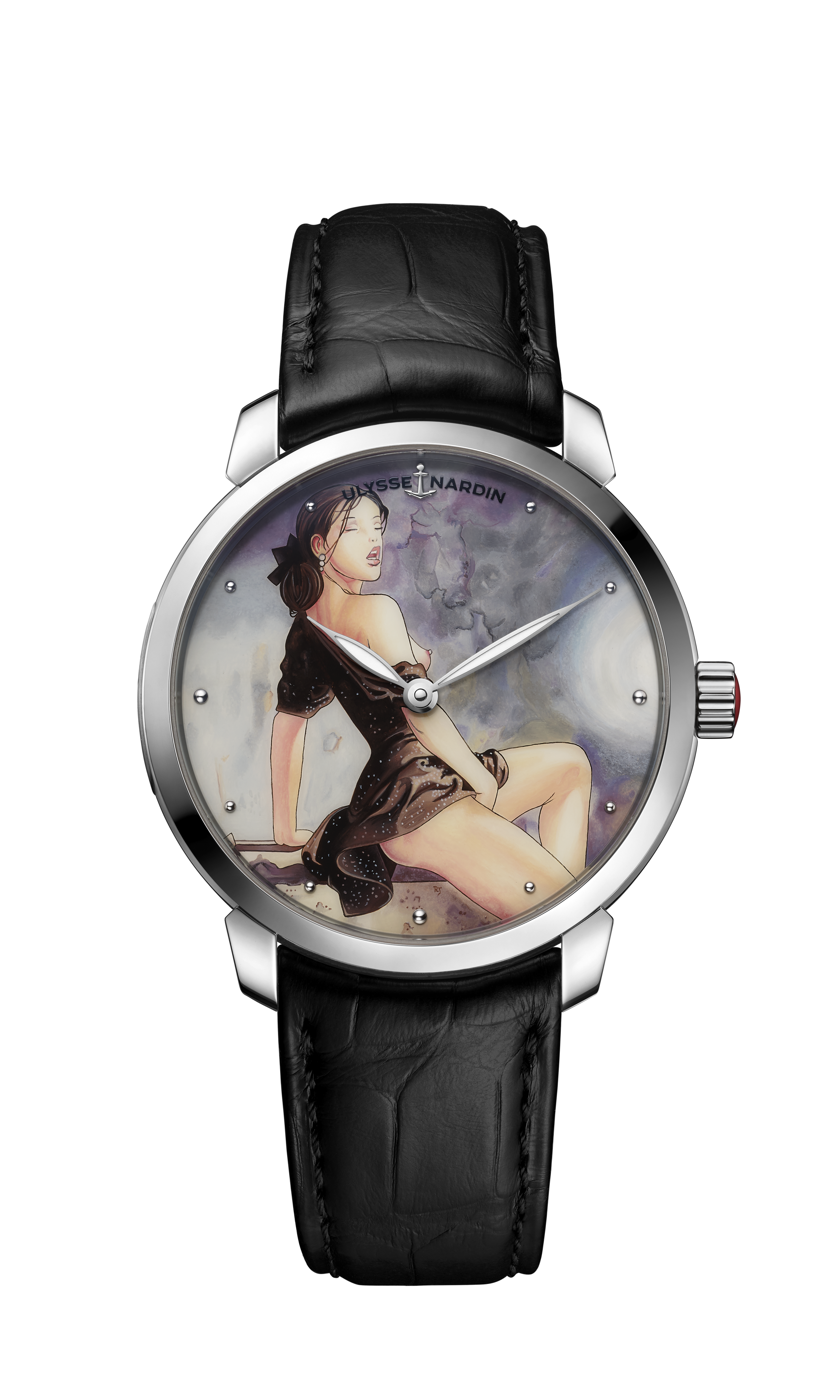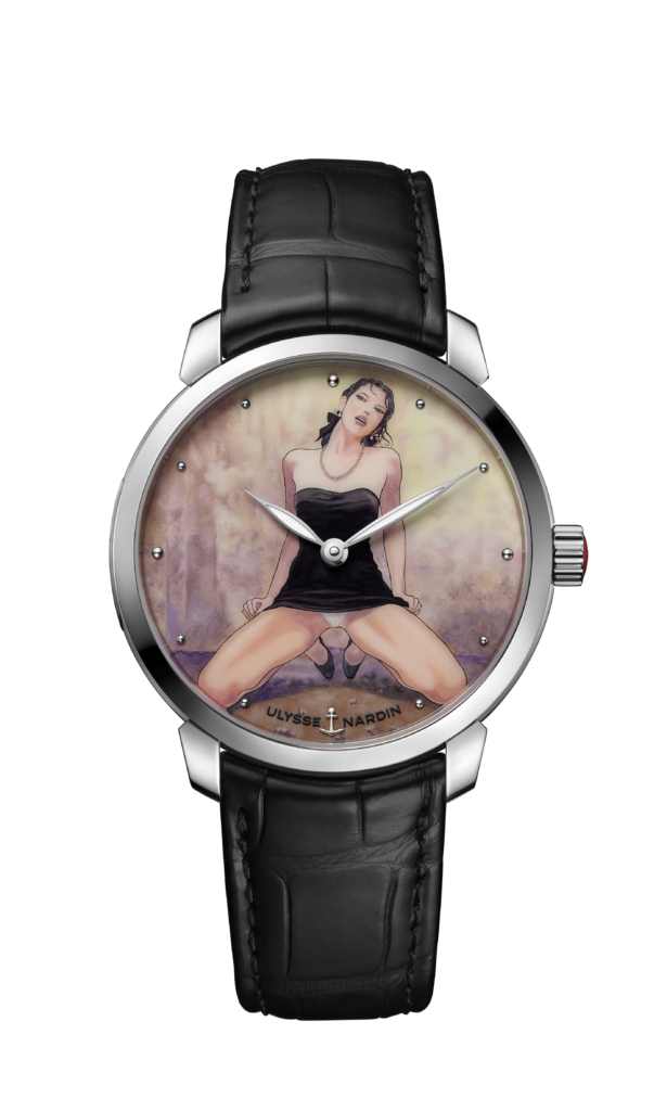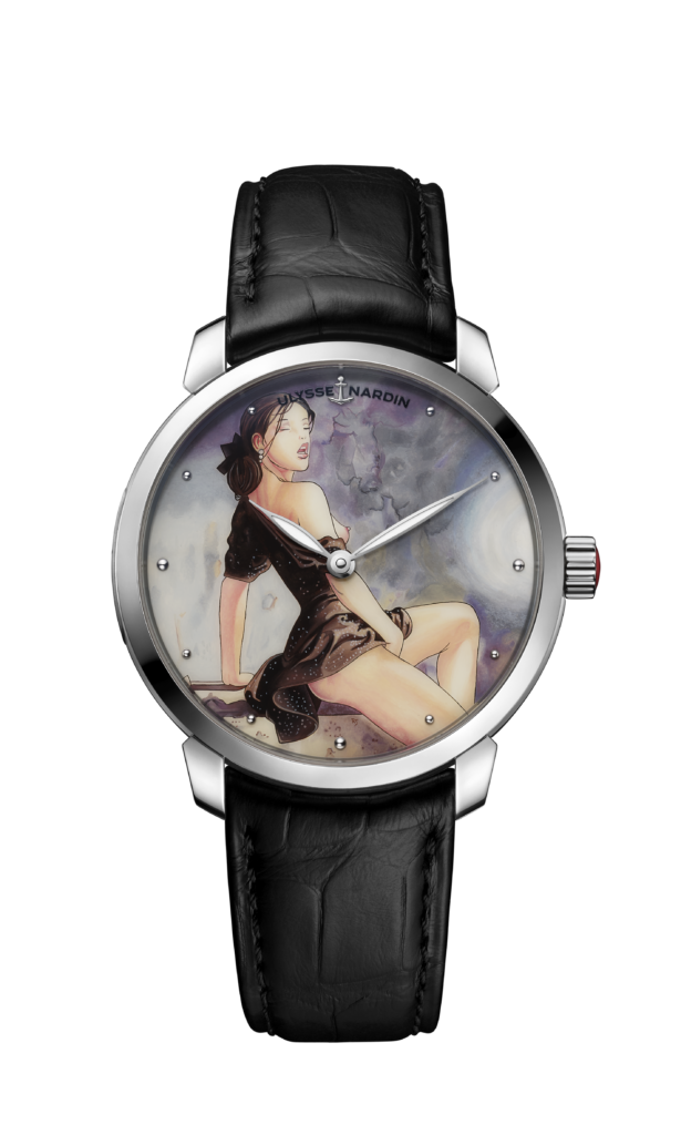Les montres de la collection Classico Manara de 40 mm ont été produites en édition limitée à 40 exemplaires pour chacune des illustrations. Elles étaient dotées d’un mouvement manufacture UN-320 à remontage automatique et intégraient la technologie du silicium qu’Ulysse Nardin maîtrise depuis deux décennies. La couronne de cette édition limitée a été décorée de laque rouge en hommage au bouton de la télécommande érotique illustrée dans le Déclic de Manara.
