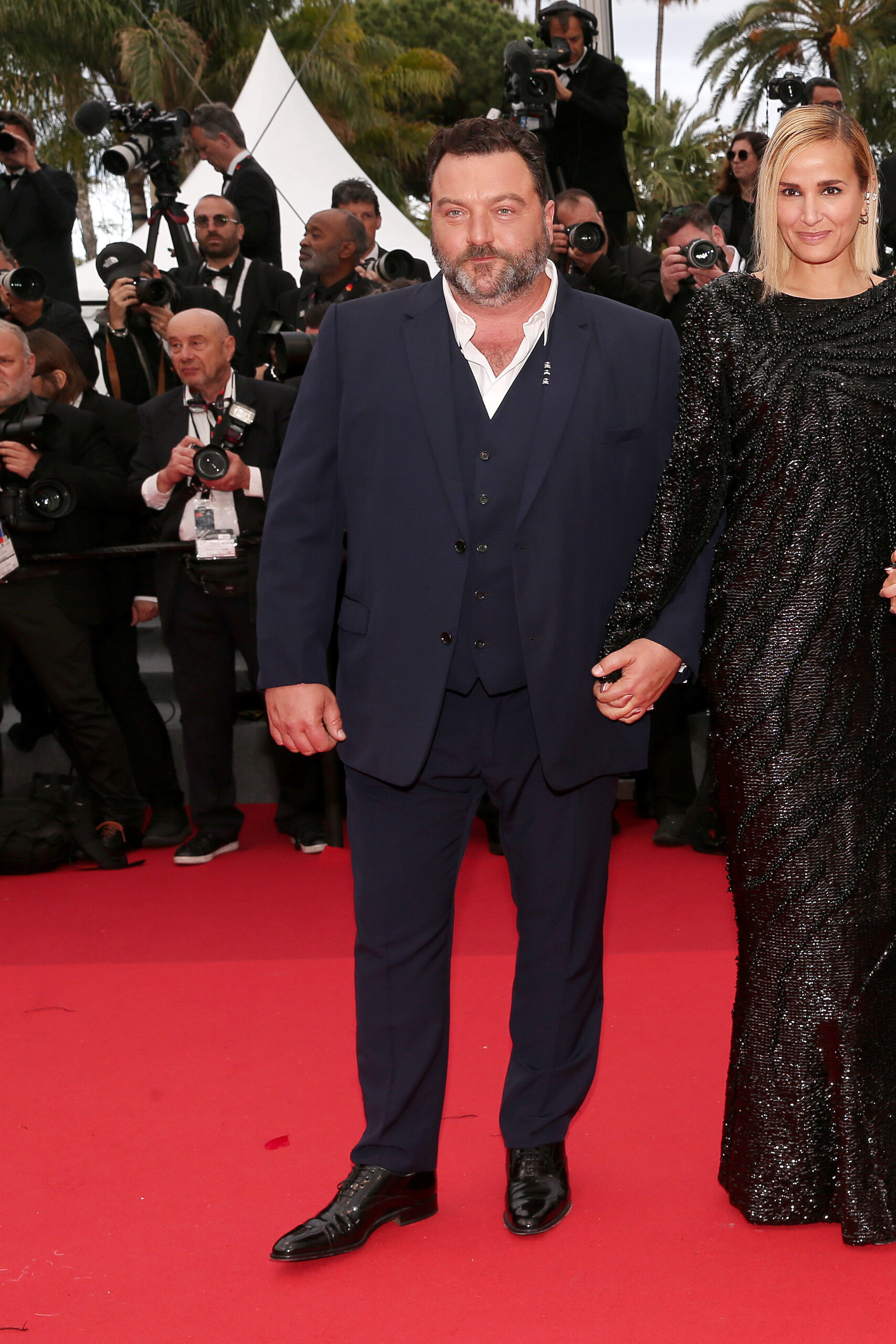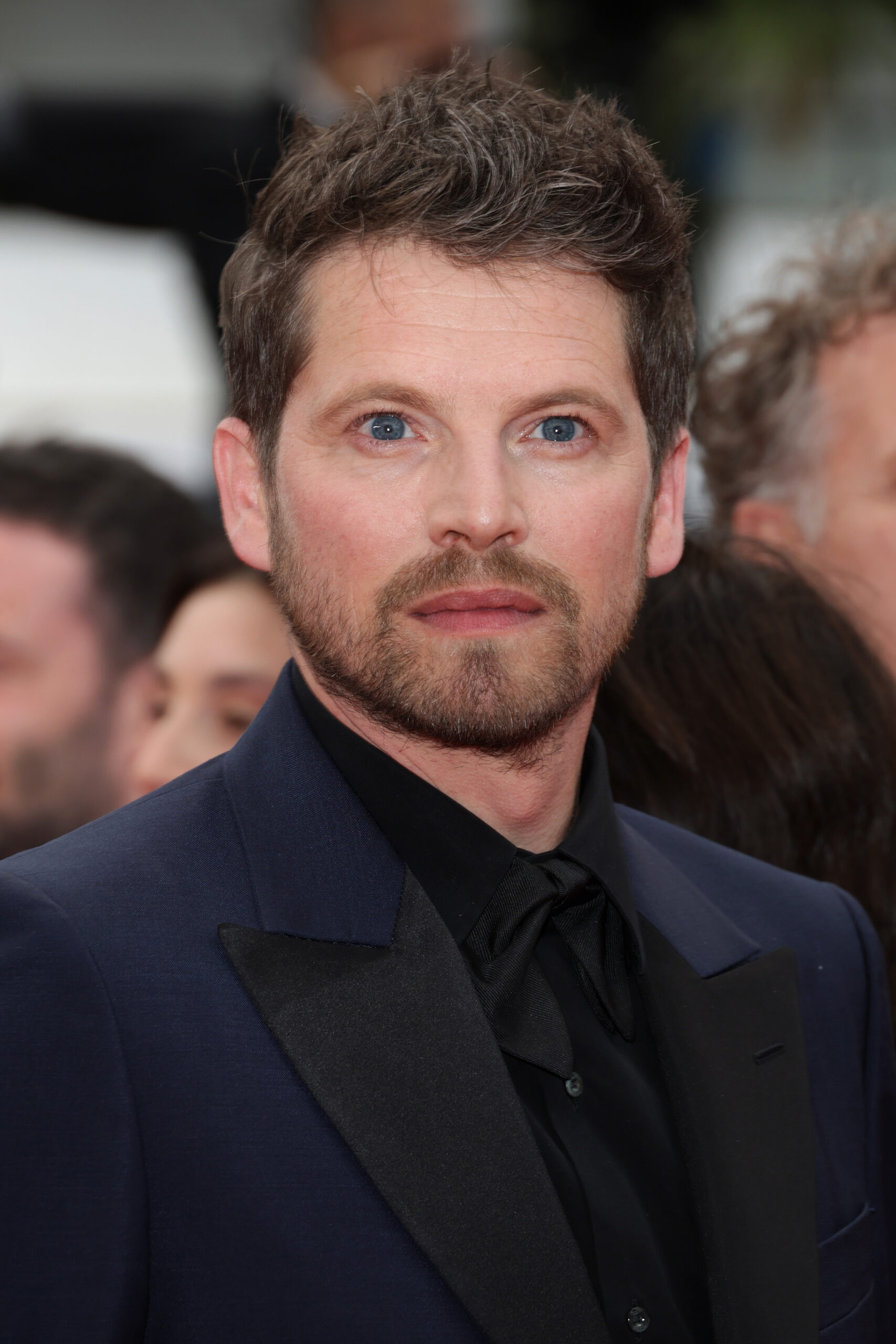 Les messieurs n’ont pas été en reste. Pierre-Yves Cardinal, vêtu par Kim Jones, a été aperçu dans un smoking bleu nuit en laine à revers crantés, complété par une chemise blanche classique, un nœud papillon en soie bleu marine et des derbies en cuir noir. Denis Ménochet, également habillé par Jones, portait un costume trois pièces sur mesure en laine bleu marine, accompagné d’une chemise à col blanc classique.