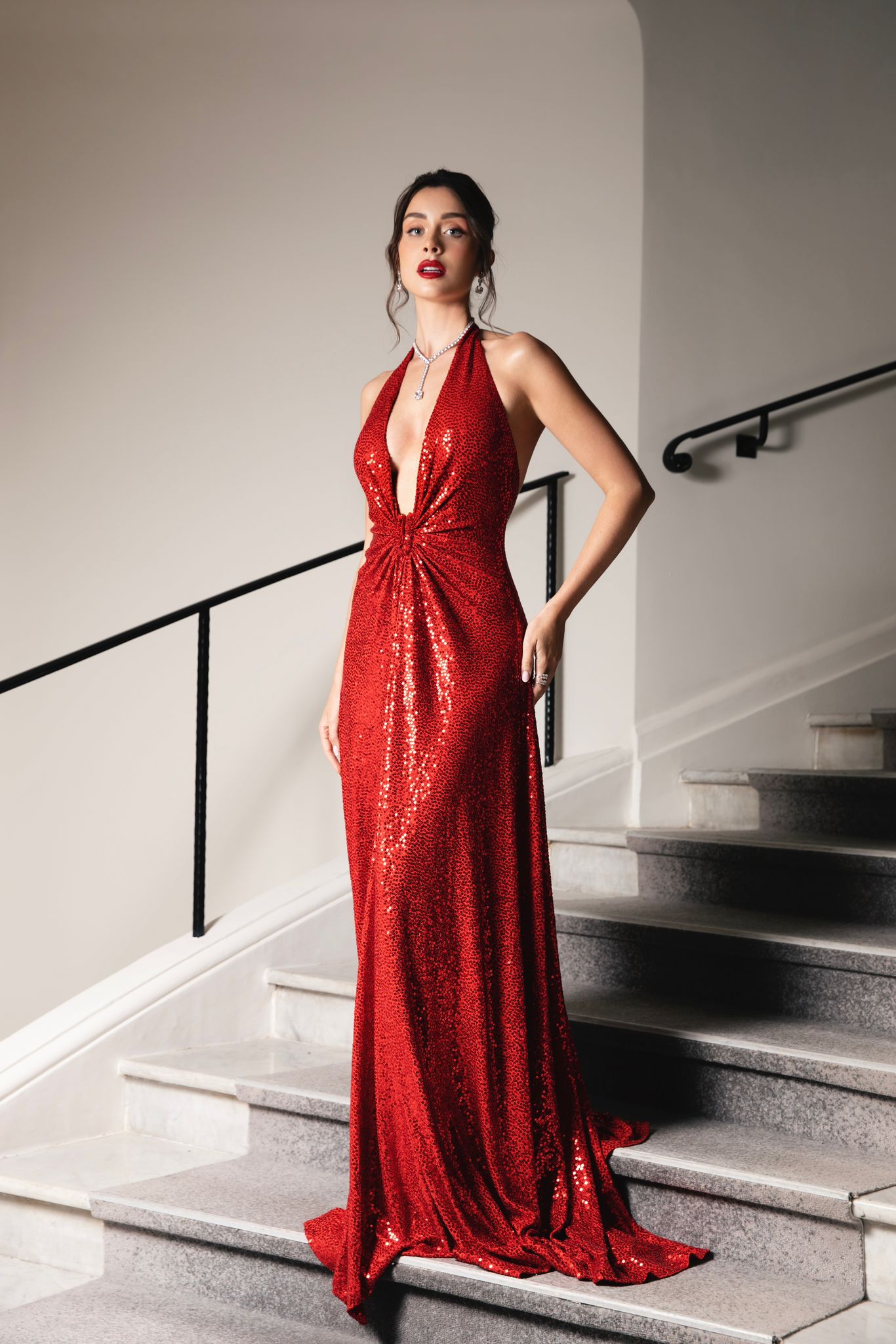 La tenue choisie par Claudia Bouza pour cet événement prestigieux était à la fois élégante et audacieuse. La robe, avec son encolure halter, mettait en valeur les épaules délicates de l’actrice et créait une silhouette gracieuse. Les broderies de sequins apportaient une touche de glamour et de sophistication à l’ensemble, capturant la lumière sous les flashs des photographes.