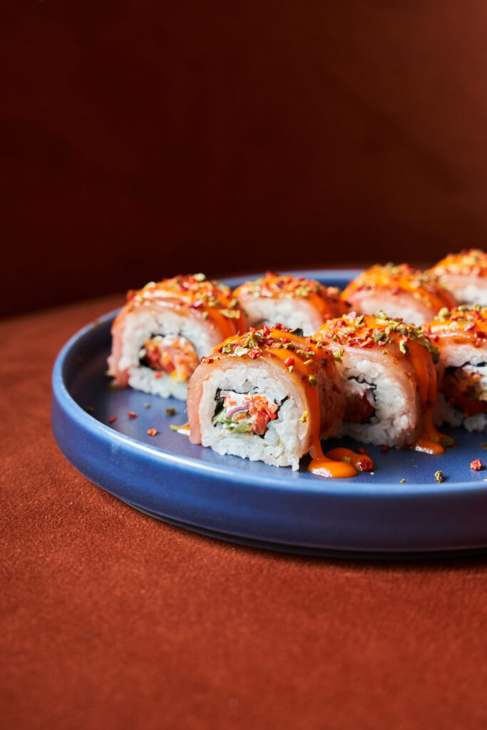 Le « Samba Basque », une pièce de 8, est un roll relevé et fondant qui célèbre la traditionnelle piperade basque. Il renferme un cœur mariant le croquant de pickles d’oignon rouge et de poivron et le fondant d’un chèvre frais. Il est surmonté d’une fine tranche de thon assaisonnée par une sauce soja-yuzu-sésame au piment d’Espelette, parsemé de poivron déshydraté et nappé d’un coulis poivron rouge et romarin.