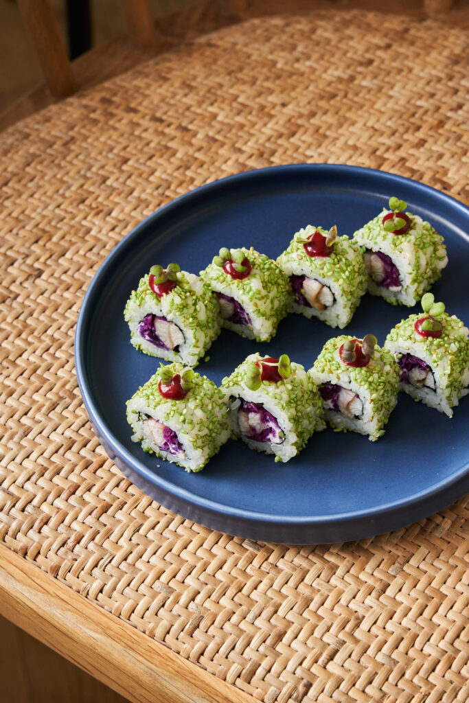 Le « Samba Le Nord », une pièce de 8, est une audacieuse combinaison de saveurs fumées et surprenantes avec de l’anguille fumée, du chou rouge mariné à la betterave et du fromage frais relevé par une pointe de raifort. Le tout est complété par un coulis de betterave au gingembre et une pousse de moutarde, le tout entouré de graines de sésame au wasabi.