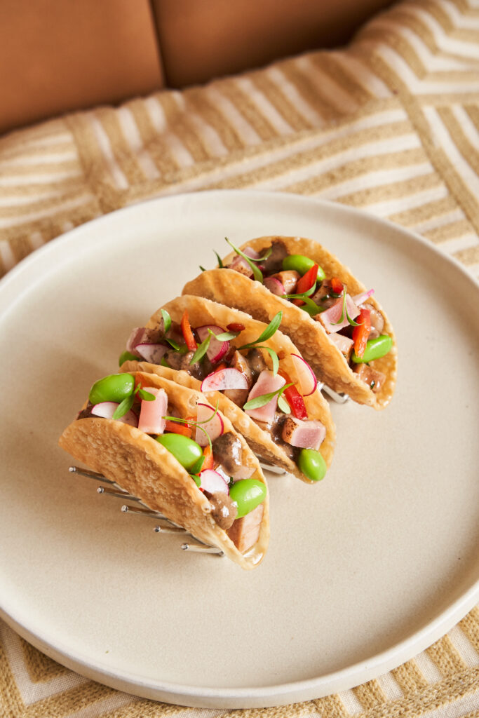 Enfin, le « Bagnat Nikkei », une pièce de 3, est croustillant et gourmand, proposant un tataki de thon dans un tacos croustillant, accompagné d’edamame, de radis rose, de poivron rouge et d’oignon nouveau. Il est assaisonné de pointes de mayonnaise à la tapenade d’olive noire et décoré de pousses de coriandre.