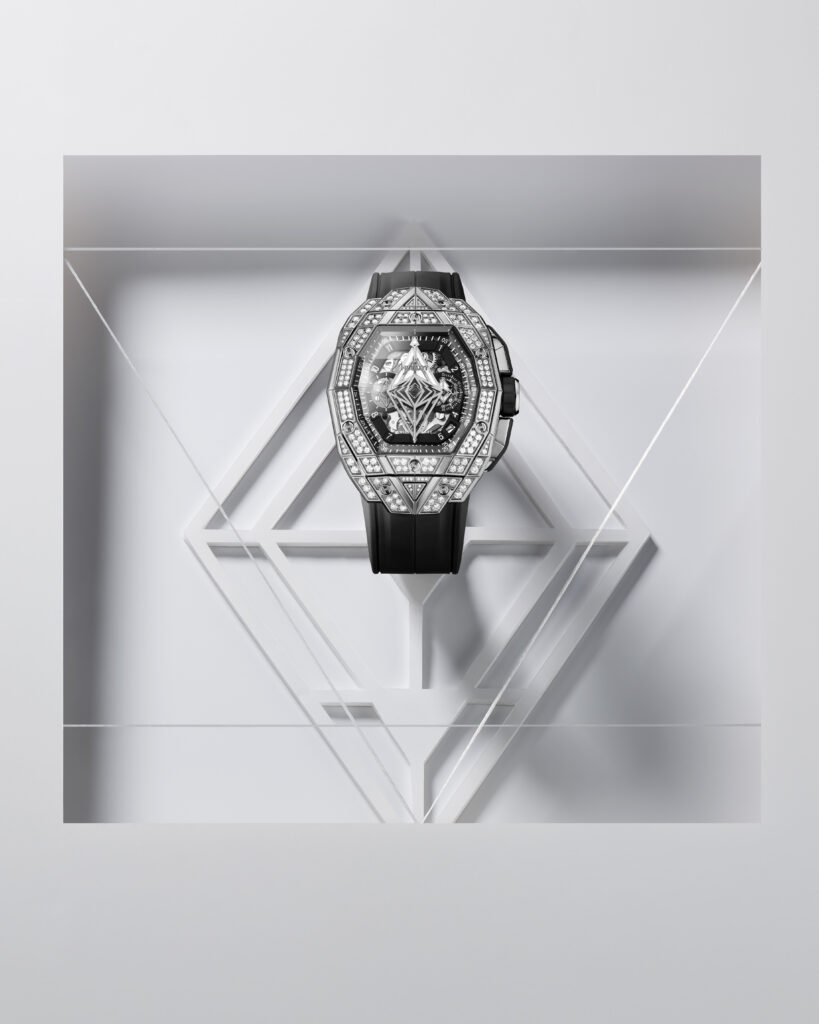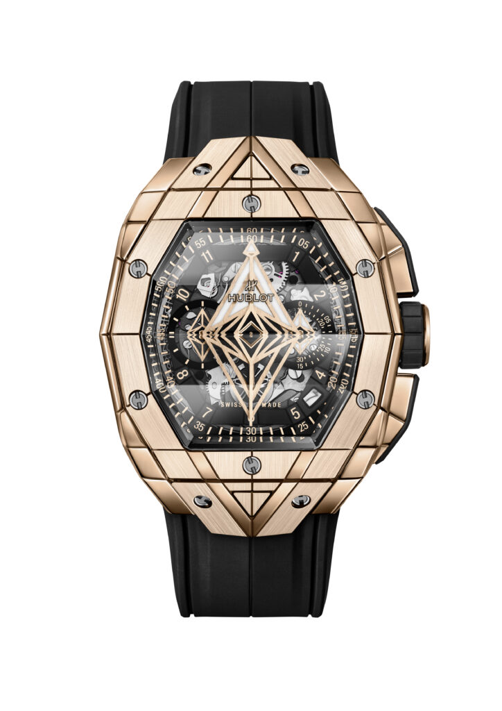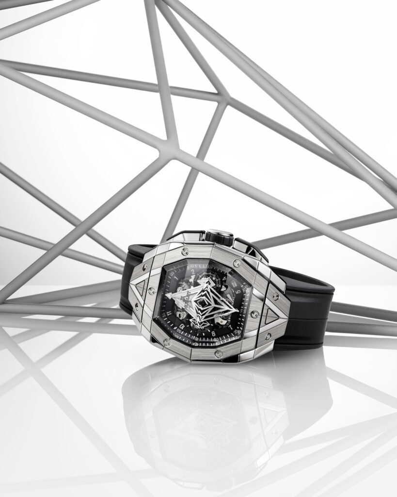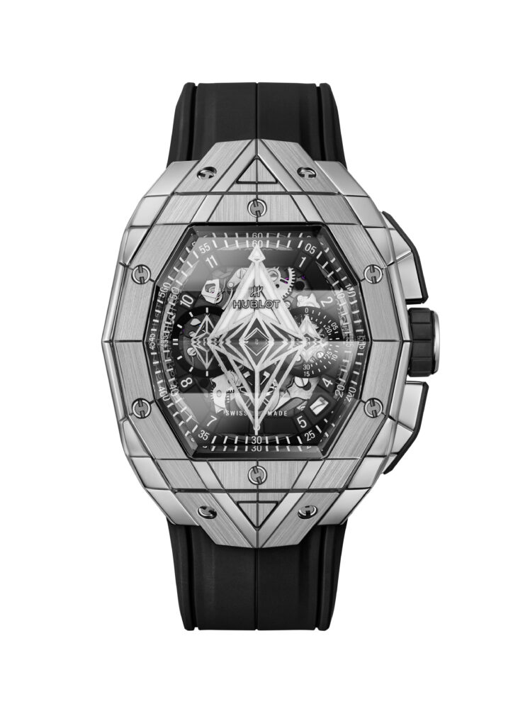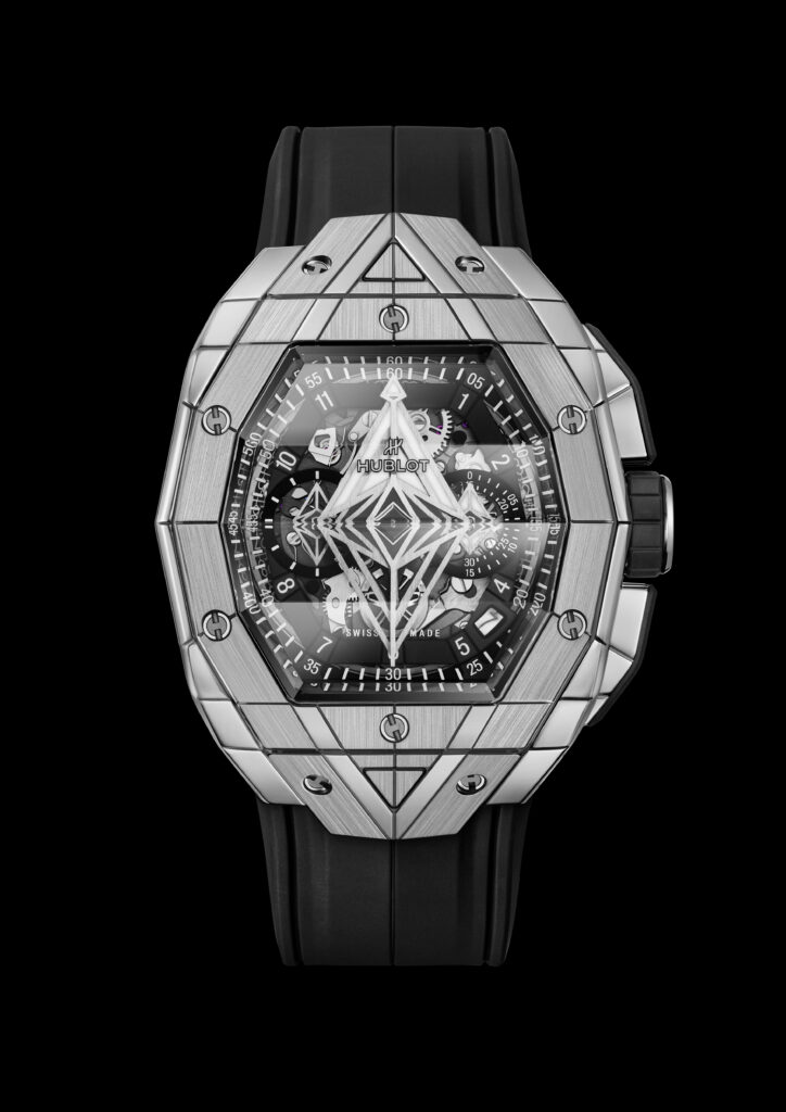 Le boîtier de 42 mm de diamètre est taillé dans différentes matières et présente des motifs géométriques qui se superposent sur le cadran en saphir. Le mouvement chronographe automatique squelette HUB4700 est visible à travers les aiguilles-disques aux formes géométriques uniques. La montre offre une ergonomie parfaite pour s’adapter à toutes les tailles de poignet, que ce soit pour les hommes ou les femmes, avec des proportions généreuses et une forme affirmée.