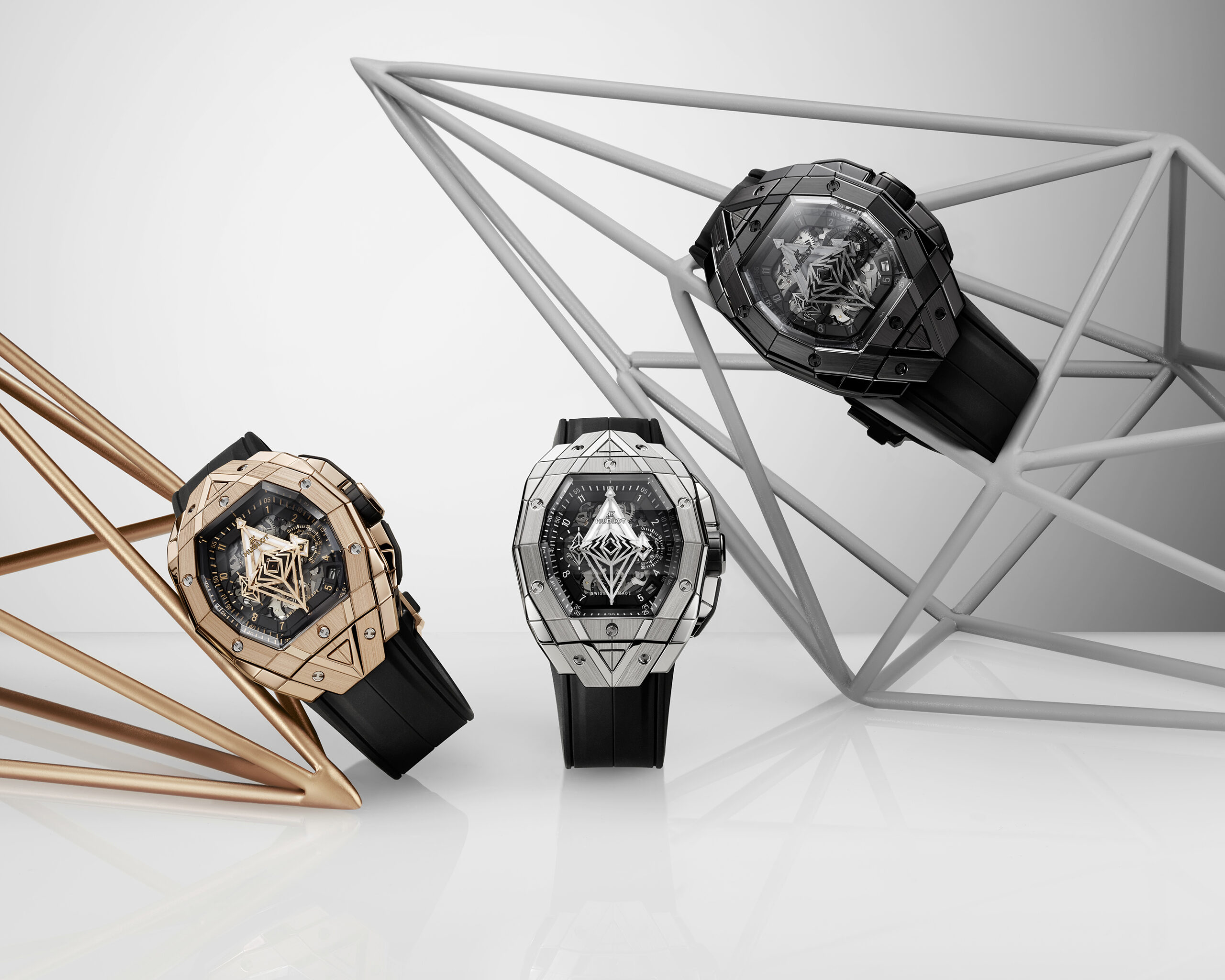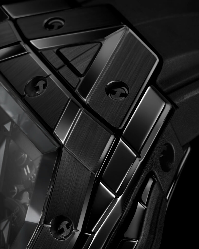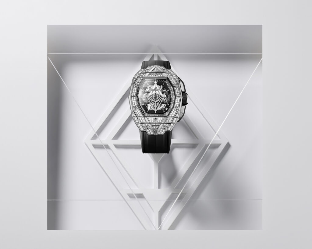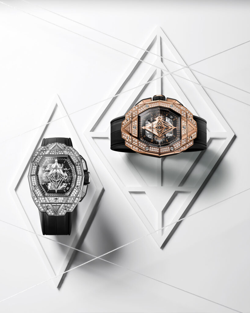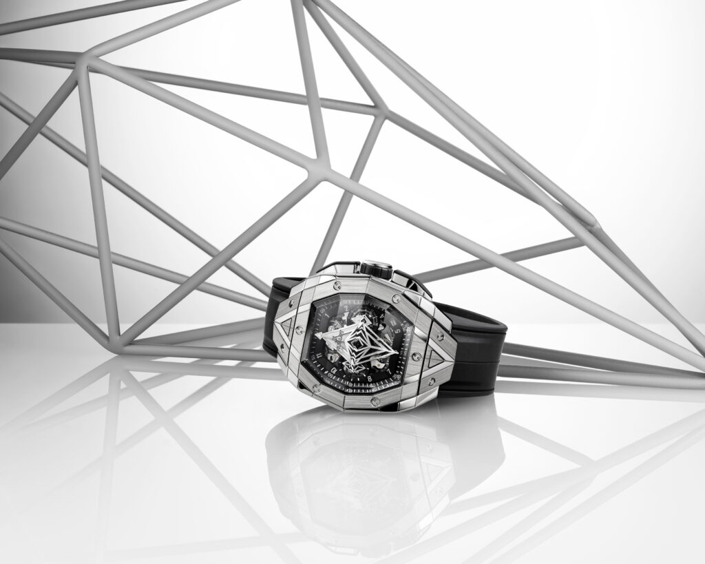 Le boîtier de 42 mm de diamètre est taillé dans différentes matières et présente des motifs géométriques qui se superposent sur le cadran en saphir. Le mouvement chronographe automatique squelette HUB4700 est visible à travers les aiguilles-disques aux formes géométriques uniques. La montre offre une ergonomie parfaite pour s’adapter à toutes les tailles de poignet, que ce soit pour les hommes ou les femmes, avec des proportions généreuses et une forme affirmée.