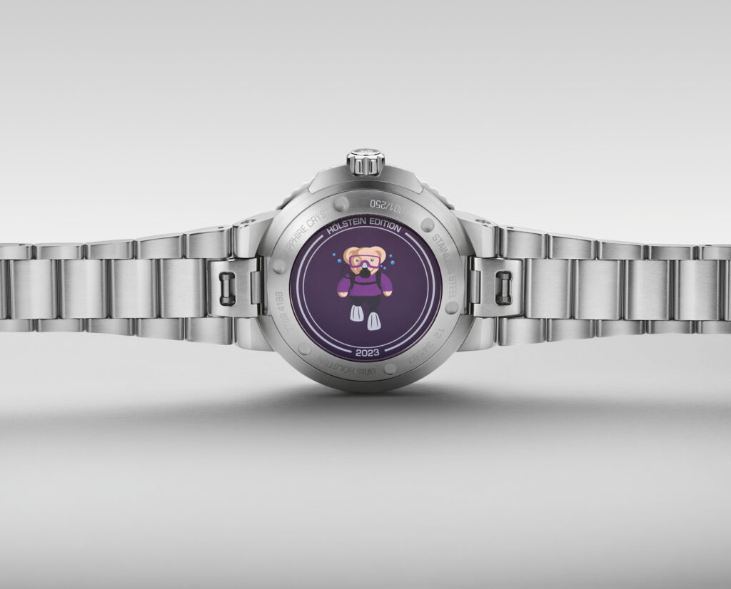 Tout d’abord, la couleur du cadran est un violet profond, choisie par la communauté Oris. Ensuite, la montre est animée par le Calibre 400 automatique révolutionnaire, offrant une forte résistance au magnétisme, une réserve de marche de cinq jours, une garantie de 10 ans et des intervalles d’entretien de 10 ans. Mais il y a une différence essentielle : il s’agit de la première Aquis « sans date », en réponse à une autre demande de la communauté Oris. Enfin, le fond du boîtier est gravé du numéro de l’édition limitée et estampillé de l’Oris Bear plongeant en scaphandre.