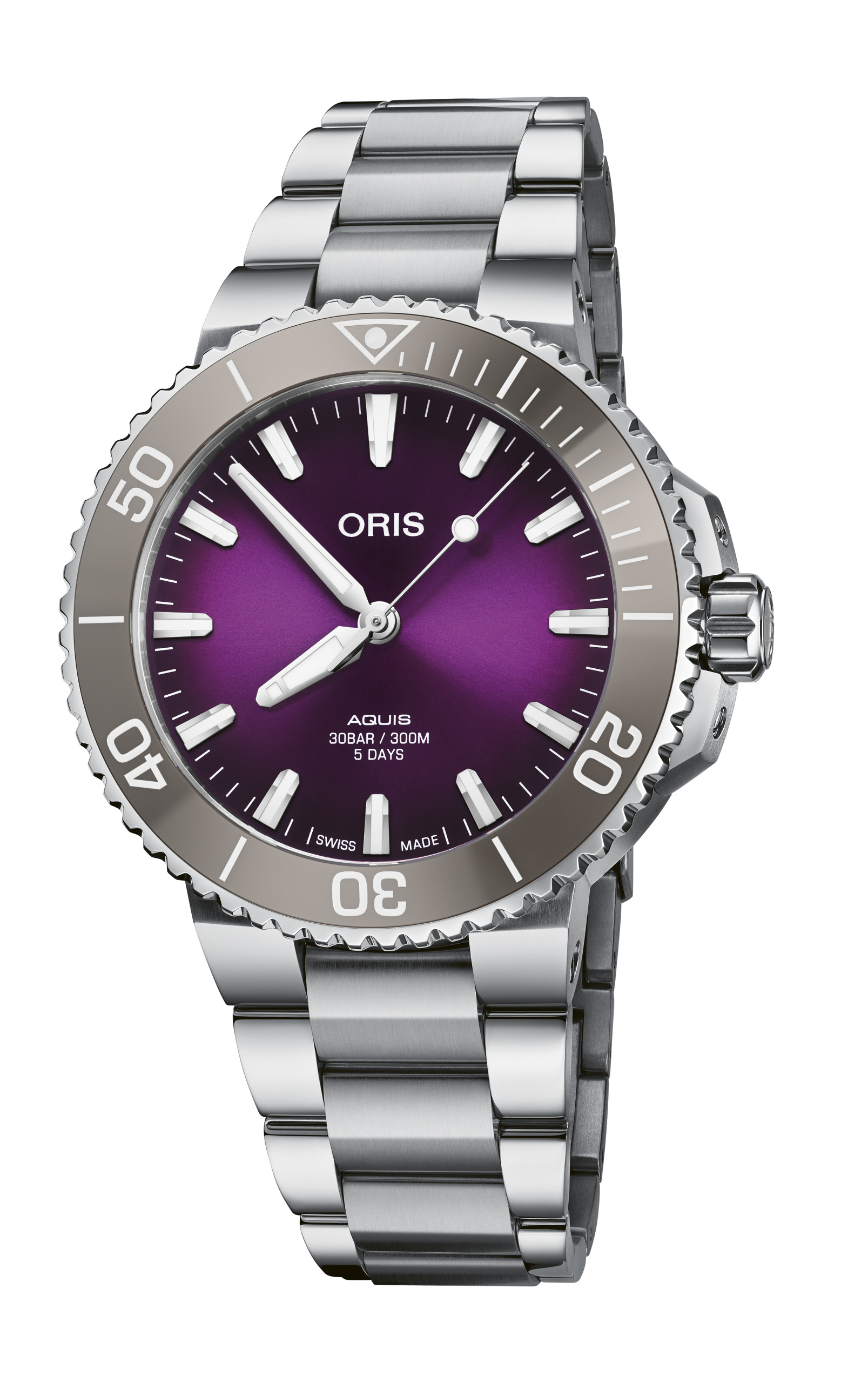 Tout d’abord, la couleur du cadran est un violet profond, choisie par la communauté Oris. Ensuite, la montre est animée par le Calibre 400 automatique révolutionnaire, offrant une forte résistance au magnétisme, une réserve de marche de cinq jours, une garantie de 10 ans et des intervalles d’entretien de 10 ans. Mais il y a une différence essentielle : il s’agit de la première Aquis « sans date », en réponse à une autre demande de la communauté Oris. Enfin, le fond du boîtier est gravé du numéro de l’édition limitée et estampillé de l’Oris Bear plongeant en scaphandre.
