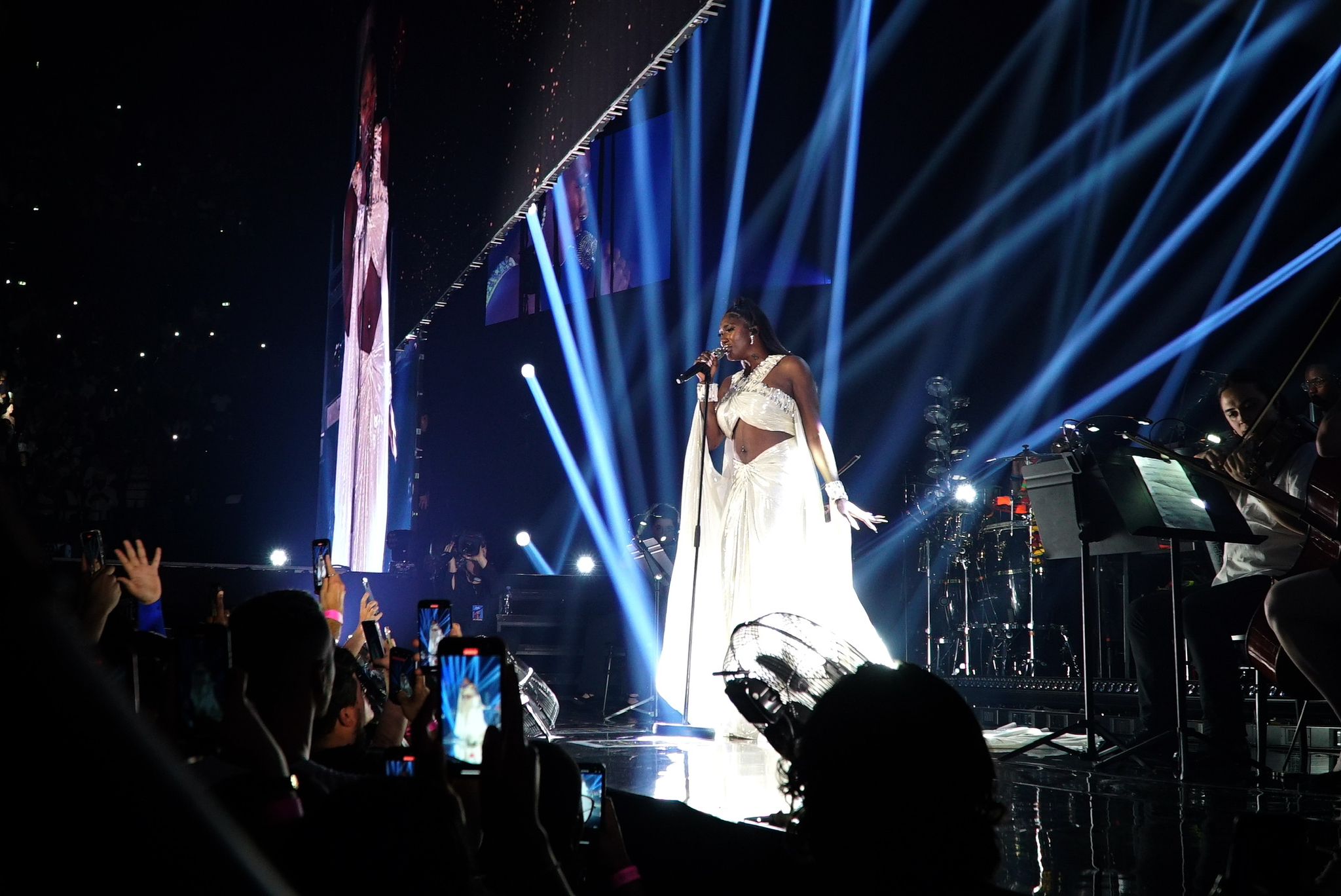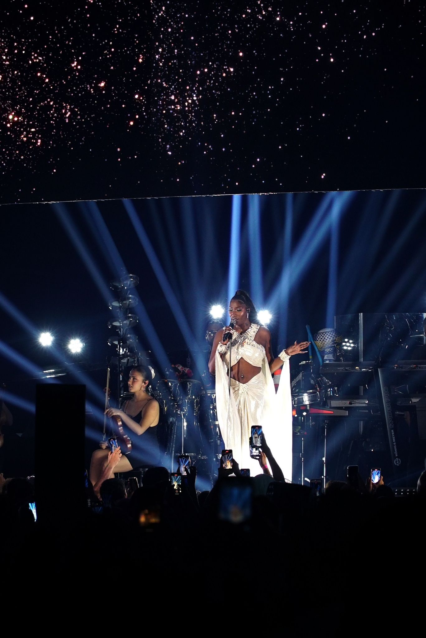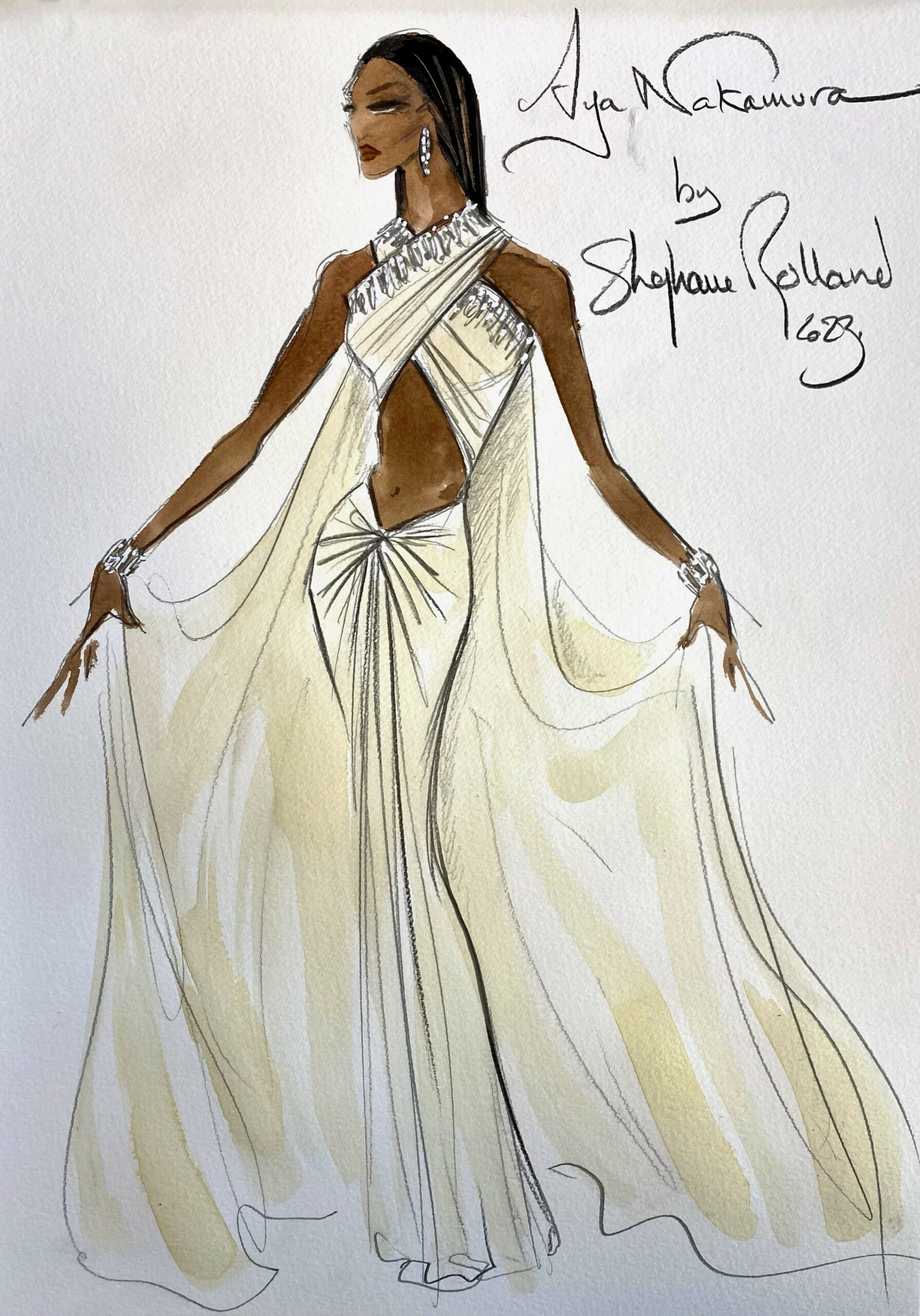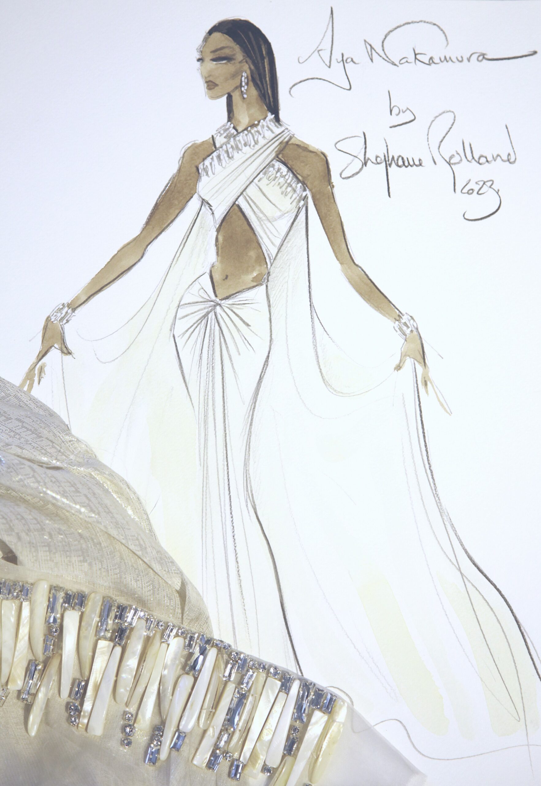 La robe, agrémentée de deux grands pans de cape, a été imaginée comme un écrin lumineux, destiné à faire rayonner Aya Nakamura lors du final de chaque concert. Cette création est un véritable hommage au talent d’Aya et à l’expertise de Stéphane Rolland, deux icônes dans leur domaine respectif.