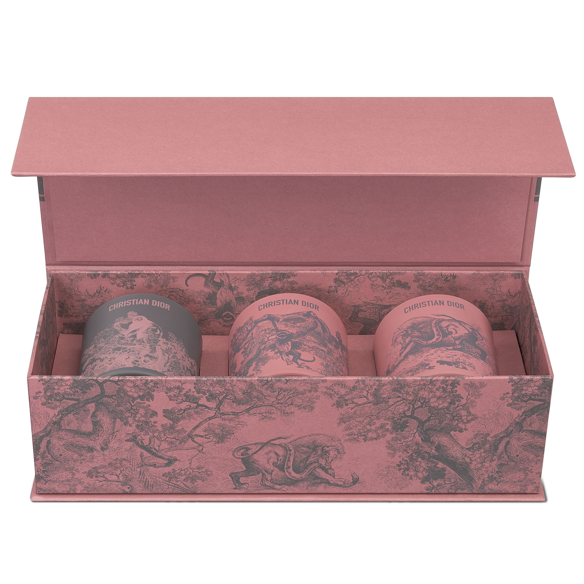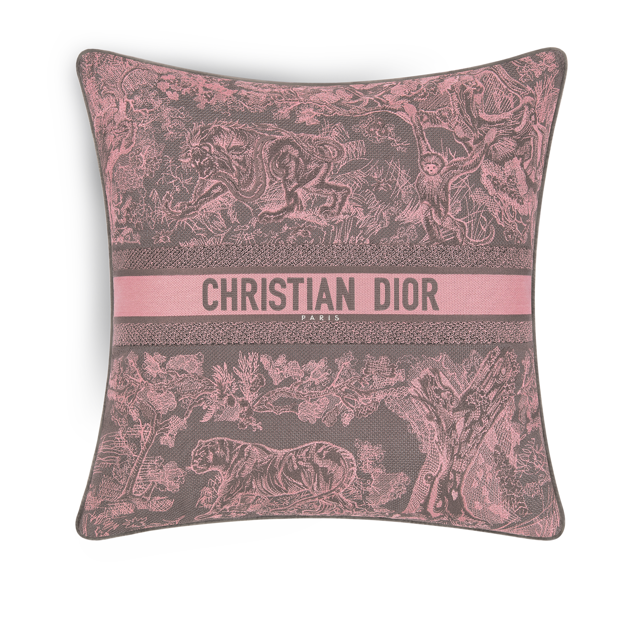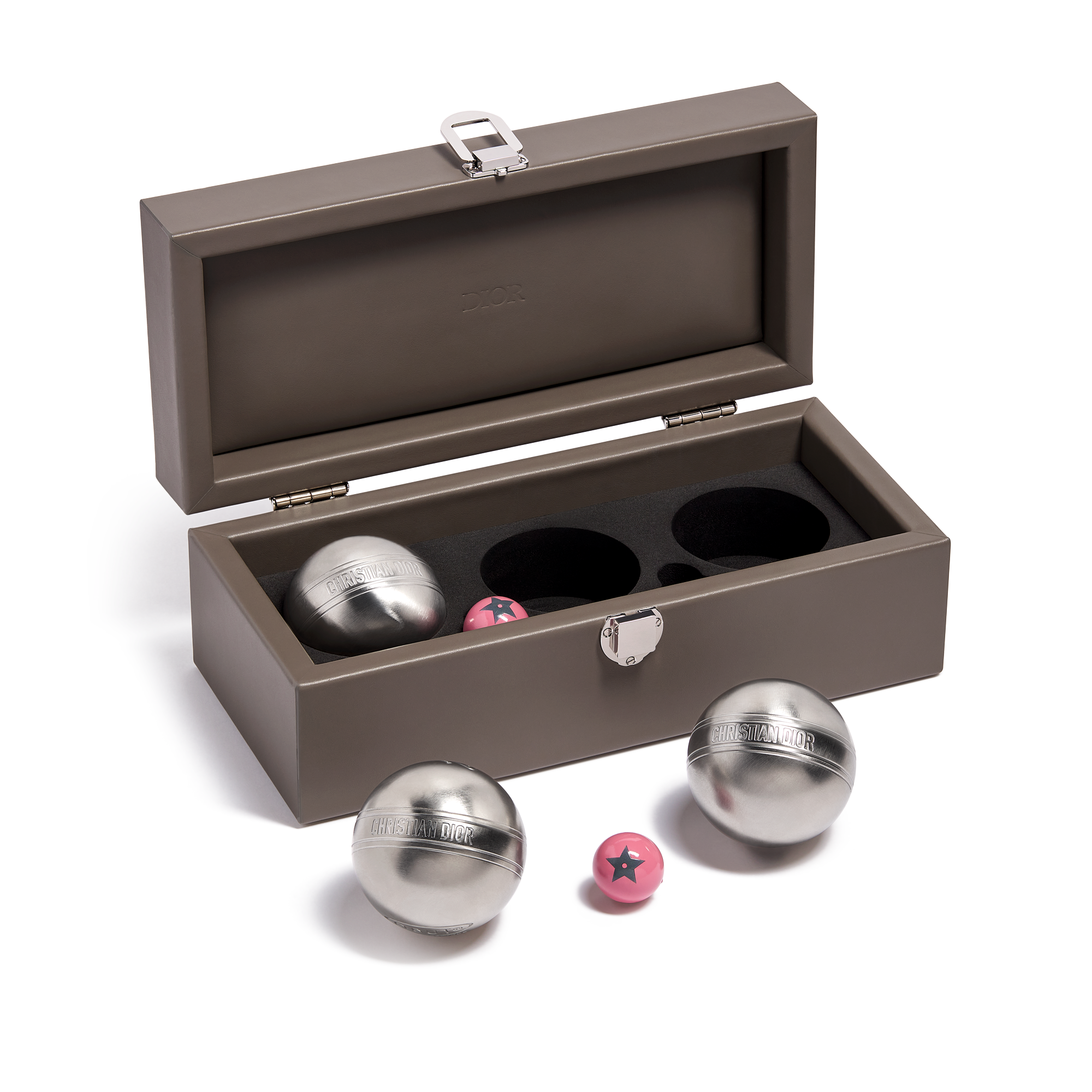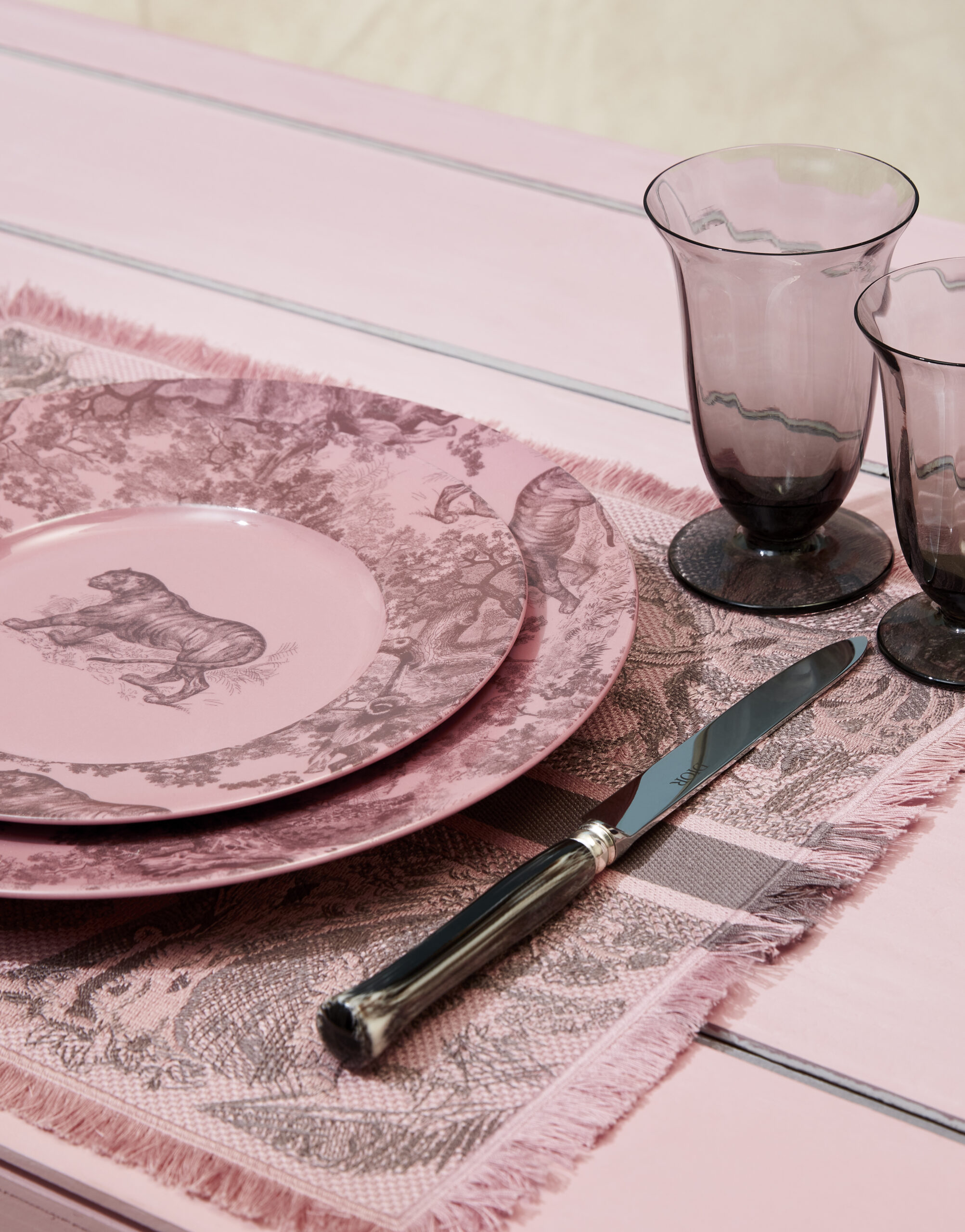 Dior Maison unveils the latest additions to the Dioriviera capsule, celebrating the gentle life dear to Christian Dior. Extensions of a radiant wardrobe reinvented by Maria Grazia Chiuri, these unique creations are dressed in iconic toile de Jouy, dreamed up by the Creative Director of women’s collections, in two emblematic Dior colors: pink and gray – the founding-couturier’s favorite shade. This timeless motif illuminates essential summer accessories – a yoga mat, table tennis rackets, a set of Finnish skittles, pétanque balls and dumbbells –, as well as two placemats, dinner and dessert plates, a flask, a box of three mini candles and embroidered cushions. An invitation to take a sunny break, this exceptional design also adorns an armchair, two deckchairs, a parasol and a surfboard. A moment suspended in time, like an escape to the seaside.