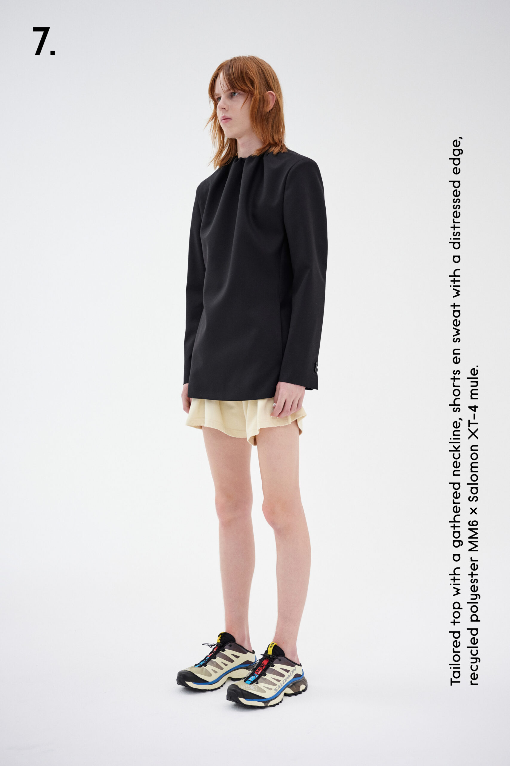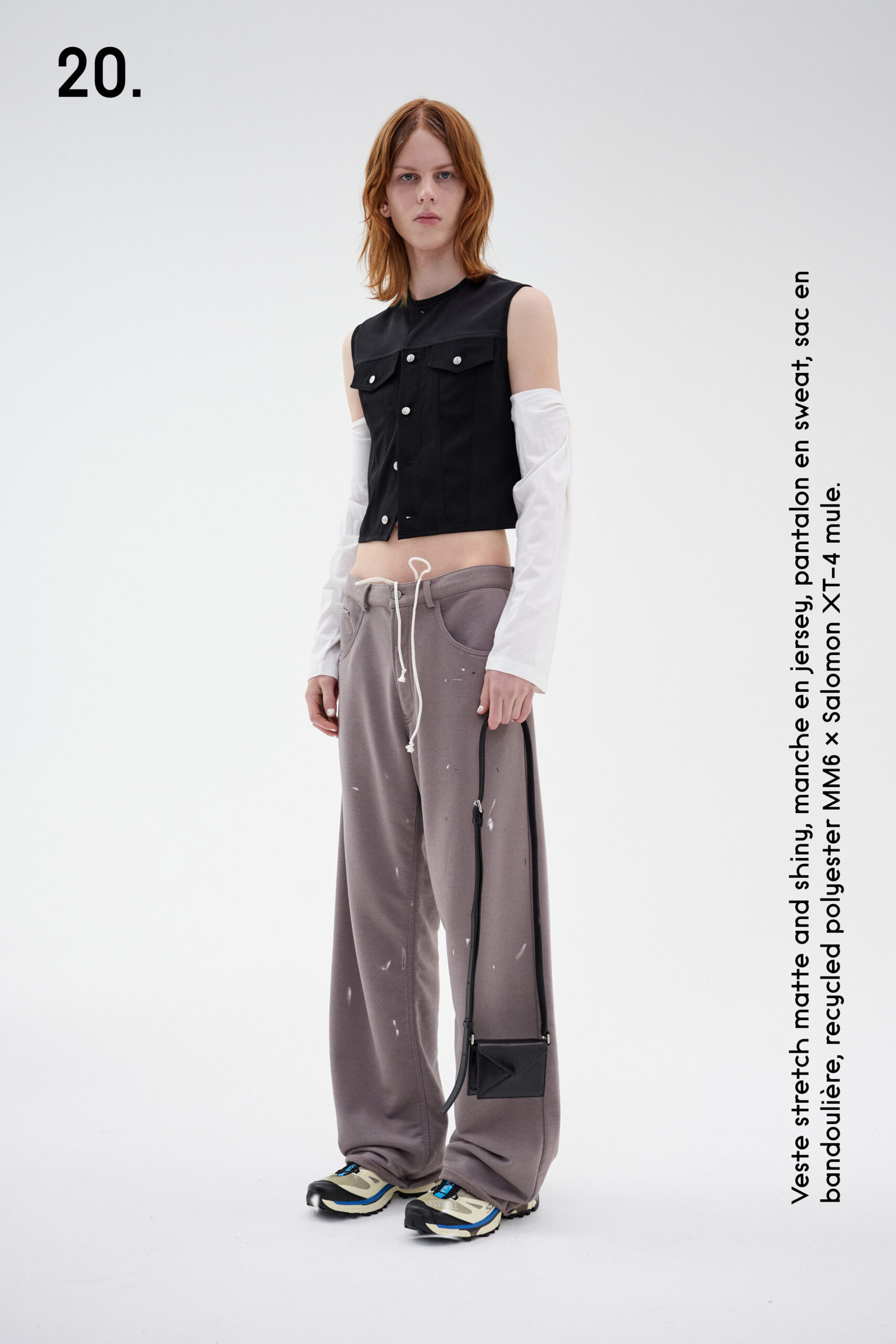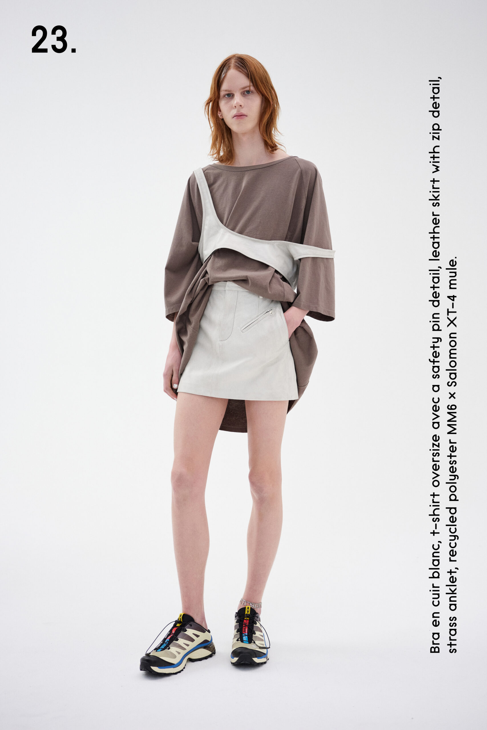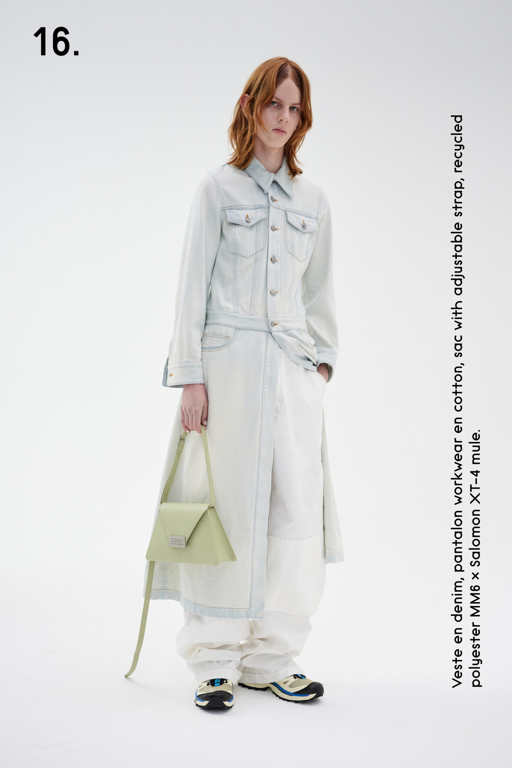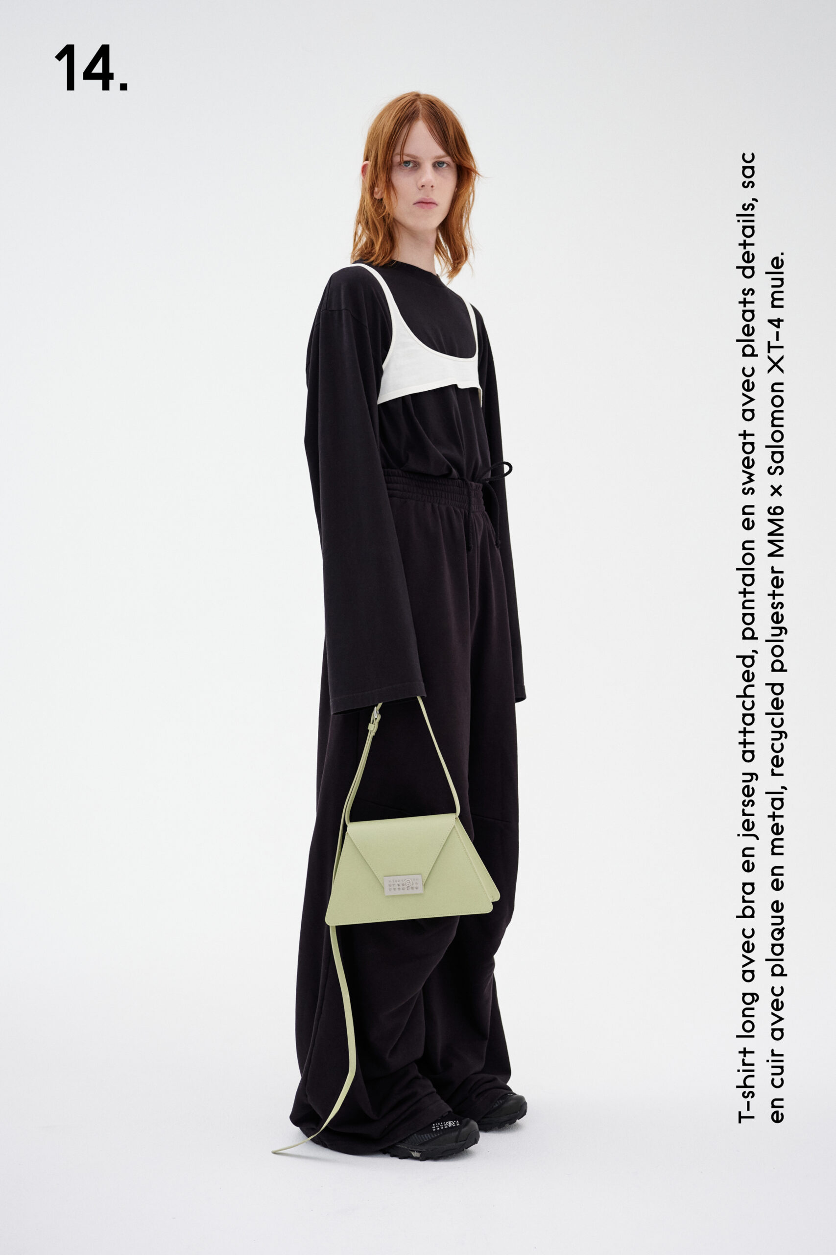 The ongoing creative dialogue between MM6 and the French sportswear manufacturer Salomon, whose designs are as ubiquitous on the streets of Paris as they are on hiking trails, continues for a fourth season. The Xt-4 all-terrain shoes, which meld style and function with their single-pull lacing system and exaggerated lugs, are reimagined as an open-back mule. Another key footwear style is the canvas boot – a facsimile of a German army style that has been demilitarised and tempered with highlighted contours to create a truly original design. Never-before-seen accessory designs with archival accents are introduced alongside MM6 archetypes. The number plate signature is revived as a metal closure or embossing on bags and small leather goods, as well as print on ready-two wear – an antidote to label and logo-driven meme and TikTok culture. The Numeric shoulder bag makes its debut in large and mini sizes in addition to the medium, which was unveiled last season. Its triangular shape and flap closure – punctuated with the metal numeric plate – is inspired by the beloved Japanese bag only with sharp and crisp lines and seam work for a minimal silhouette, and comes in shades of black, sage or lime green leather.