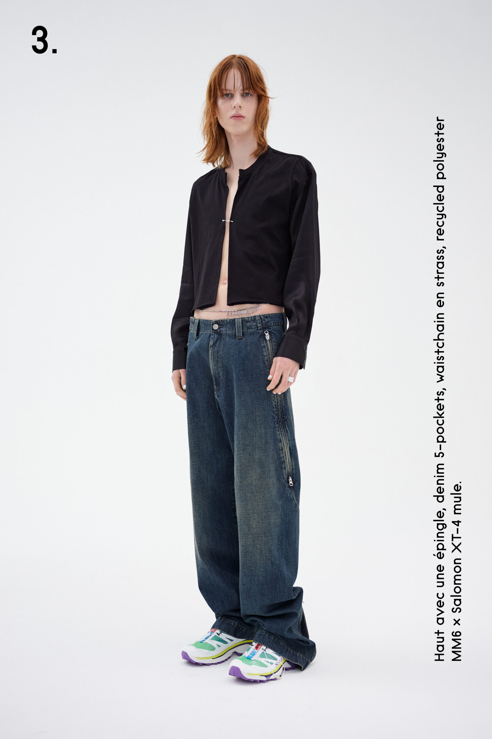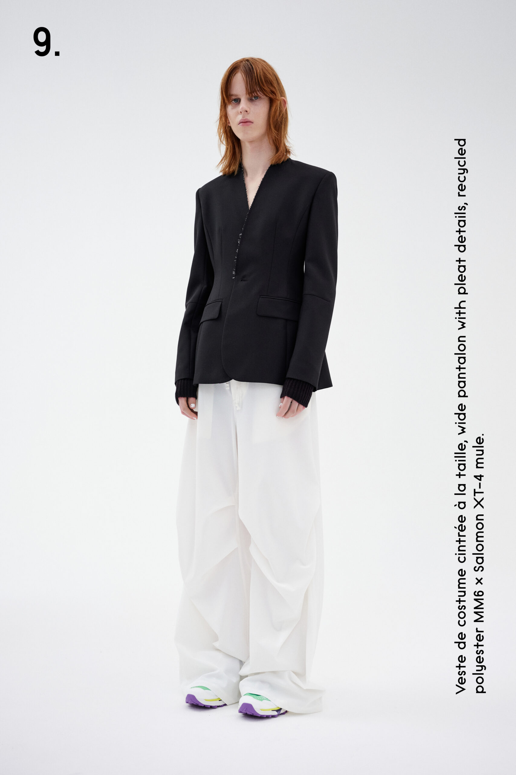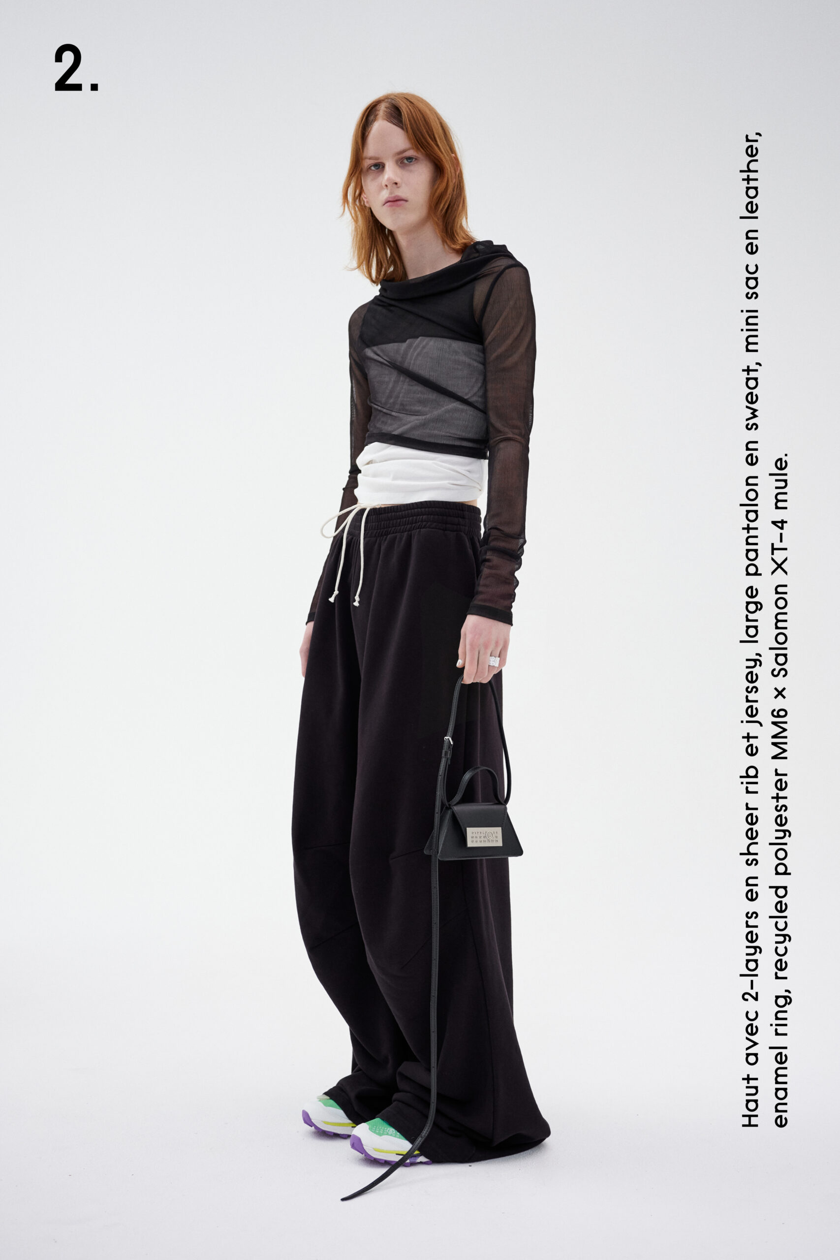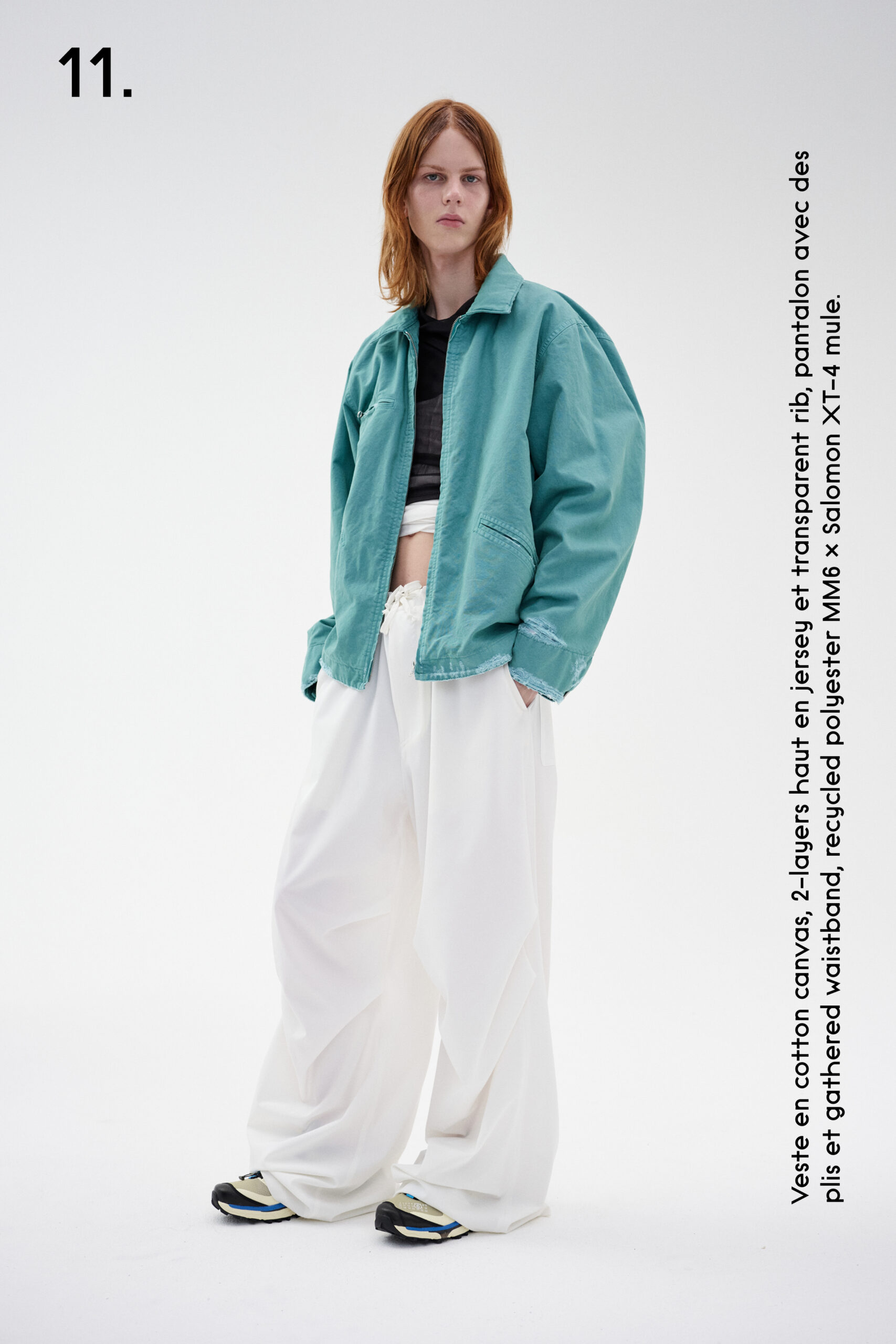 The ongoing creative dialogue between MM6 and the French sportswear manufacturer Salomon, whose designs are as ubiquitous on the streets of Paris as they are on hiking trails, continues for a fourth season. The Xt-4 all-terrain shoes, which meld style and function with their single-pull lacing system and exaggerated lugs, are reimagined as an open-back mule. Another key footwear style is the canvas boot – a facsimile of a German army style that has been demilitarised and tempered with highlighted contours to create a truly original design. Never-before-seen accessory designs with archival accents are introduced alongside MM6 archetypes. The number plate signature is revived as a metal closure or embossing on bags and small leather goods, as well as print on ready-two wear – an antidote to label and logo-driven meme and TikTok culture. The Numeric shoulder bag makes its debut in large and mini sizes in addition to the medium, which was unveiled last season. Its triangular shape and flap closure – punctuated with the metal numeric plate – is inspired by the beloved Japanese bag only with sharp and crisp lines and seam work for a minimal silhouette, and comes in shades of black, sage or lime green leather.