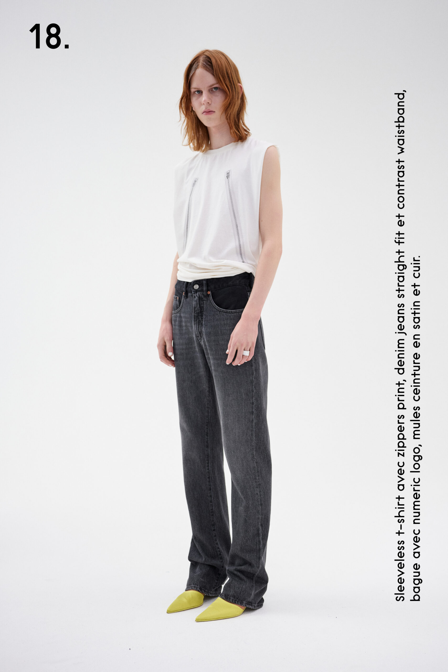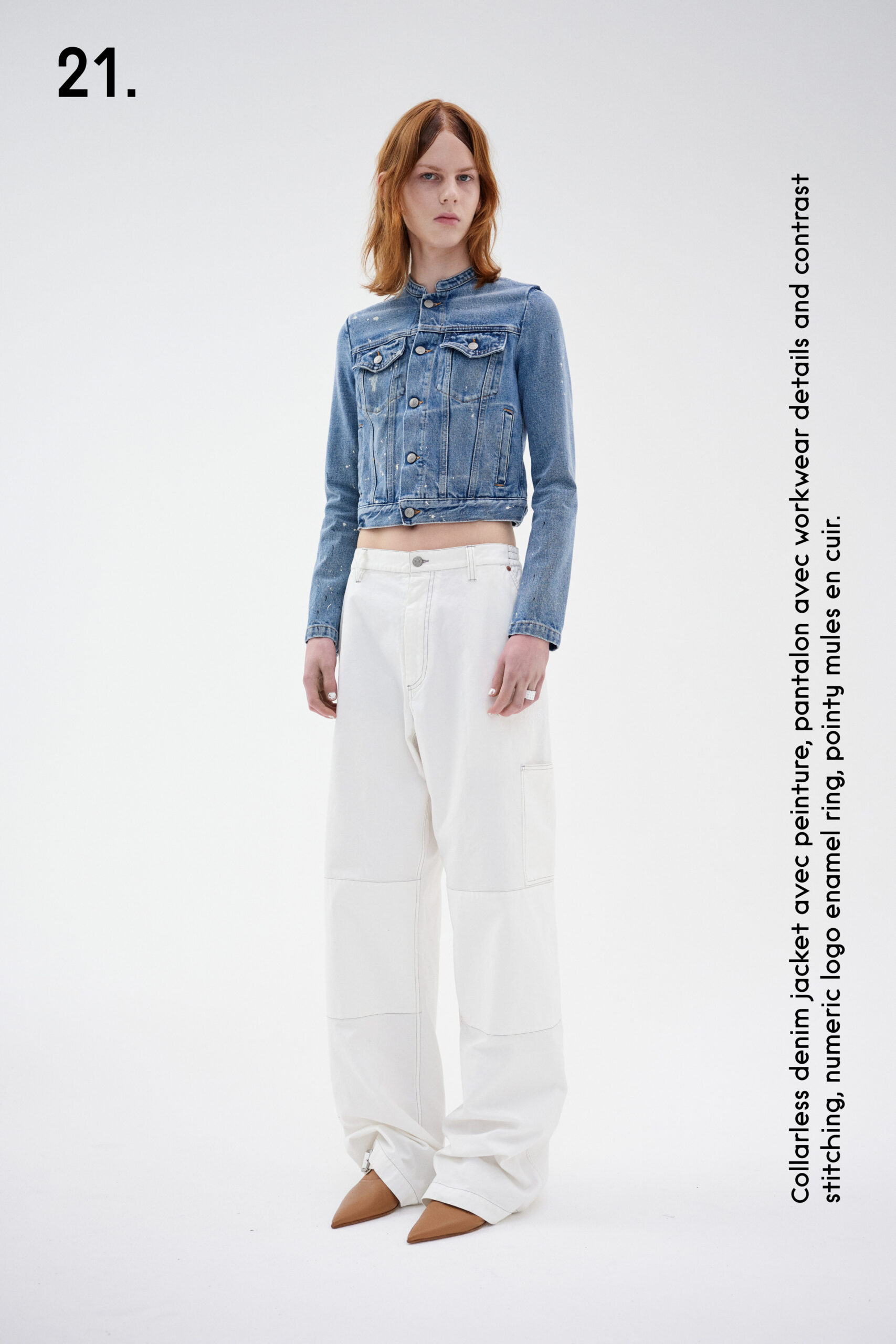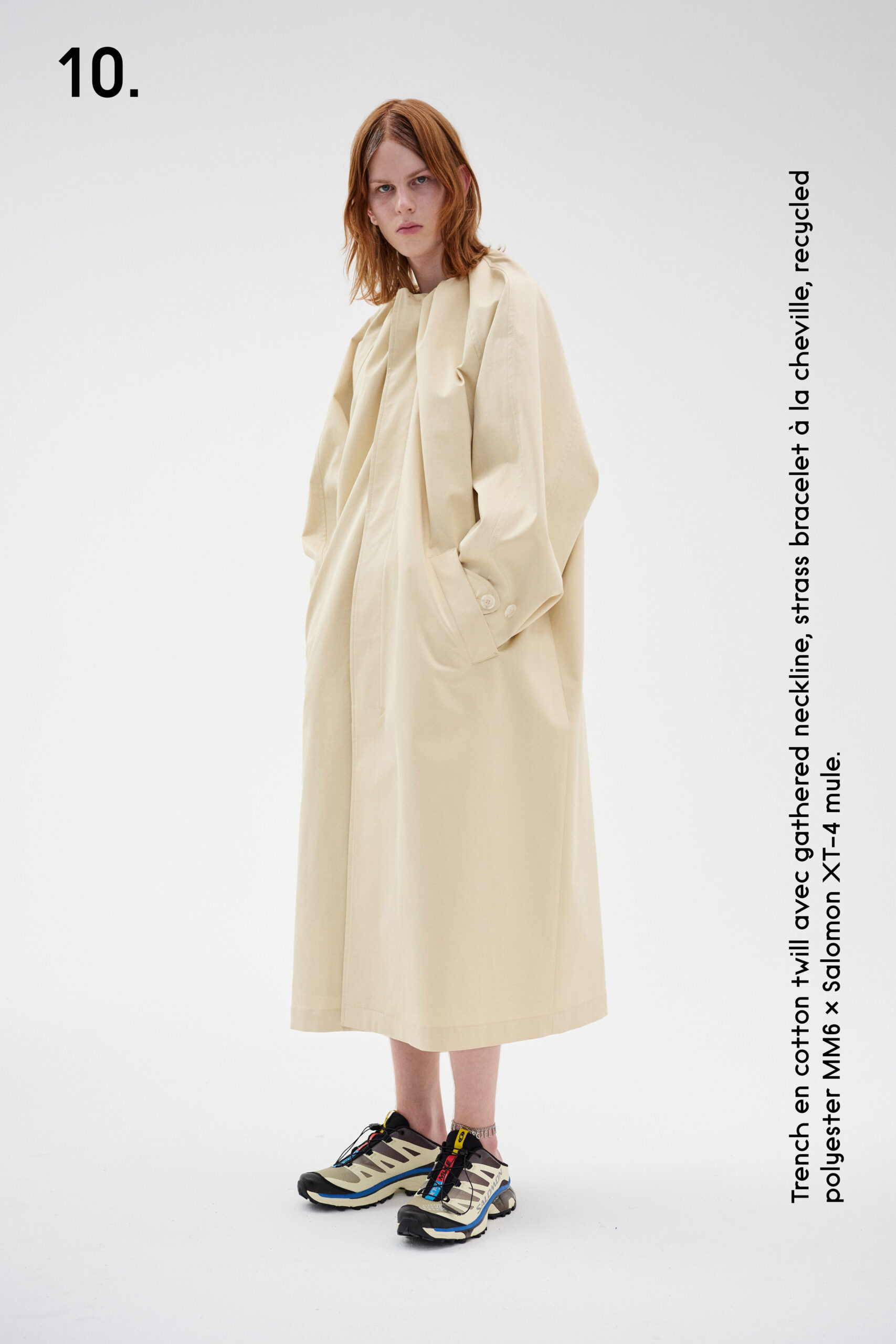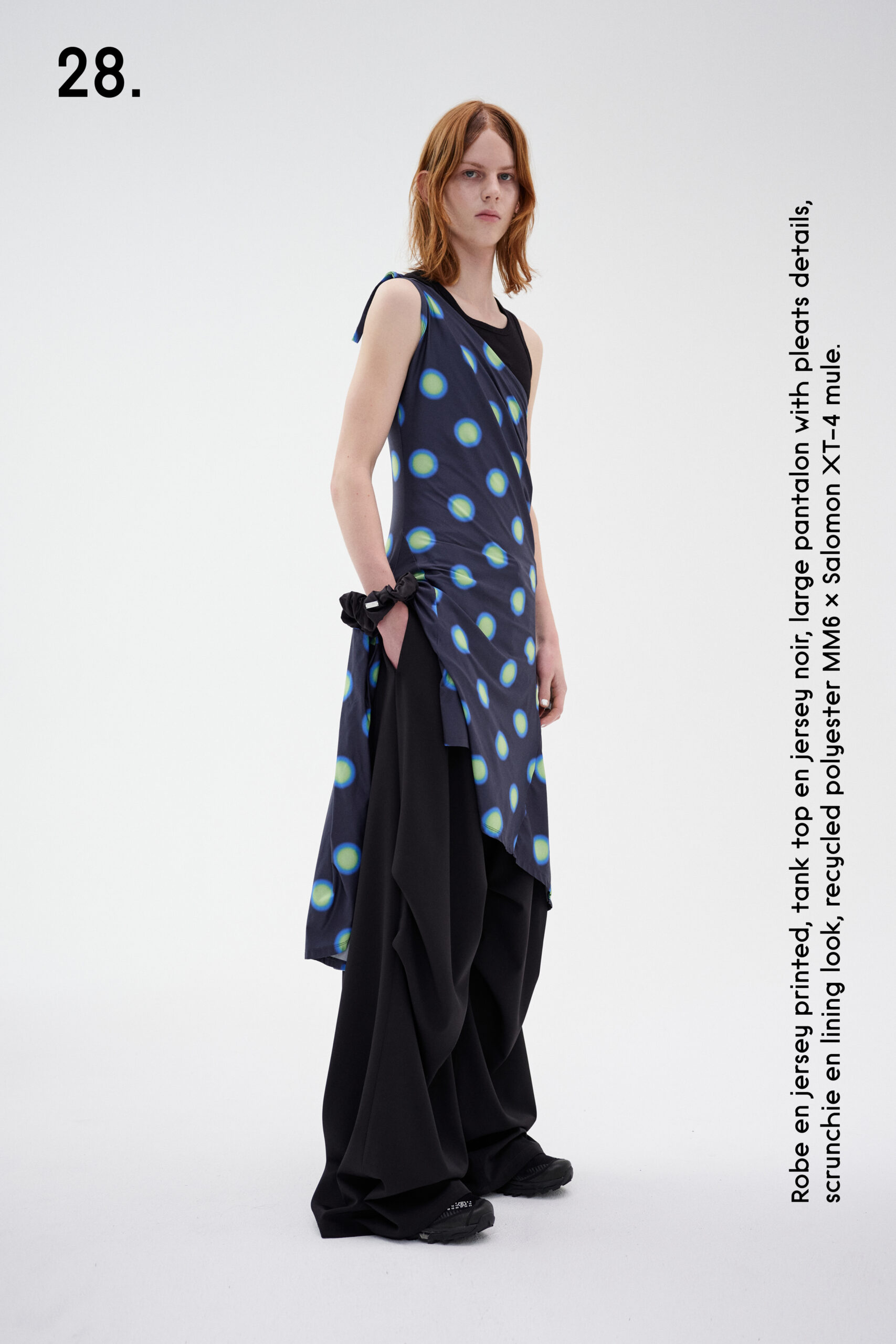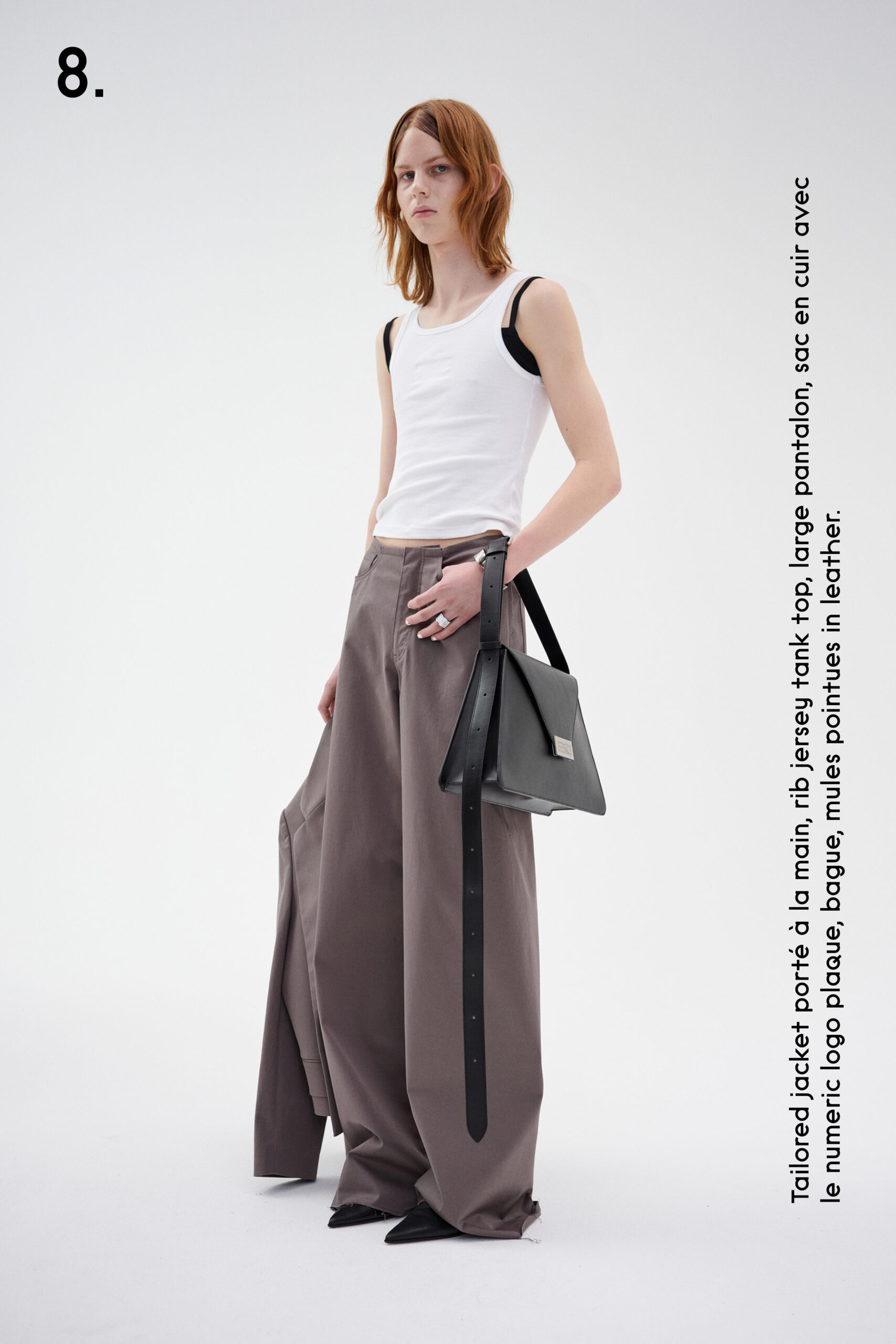 The ongoing creative dialogue between MM6 and the French sportswear manufacturer Salomon, whose designs are as ubiquitous on the streets of Paris as they are on hiking trails, continues for a fourth season. The Xt-4 all-terrain shoes, which meld style and function with their single-pull lacing system and exaggerated lugs, are reimagined as an open-back mule. Another key footwear style is the canvas boot – a facsimile of a German army style that has been demilitarised and tempered with highlighted contours to create a truly original design. Never-before-seen accessory designs with archival accents are introduced alongside MM6 archetypes. The number plate signature is revived as a metal closure or embossing on bags and small leather goods, as well as print on ready-two wear – an antidote to label and logo-driven meme and TikTok culture. The Numeric shoulder bag makes its debut in large and mini sizes in addition to the medium, which was unveiled last season. Its triangular shape and flap closure – punctuated with the metal numeric plate – is inspired by the beloved Japanese bag only with sharp and crisp lines and seam work for a minimal silhouette, and comes in shades of black, sage or lime green leather.