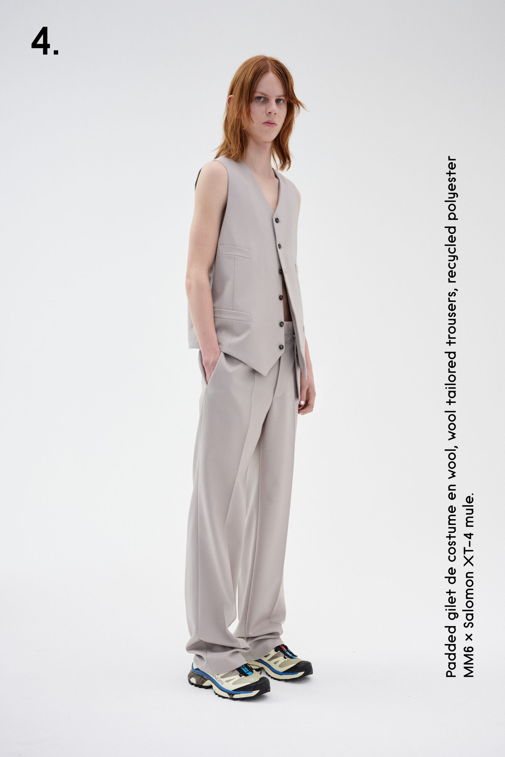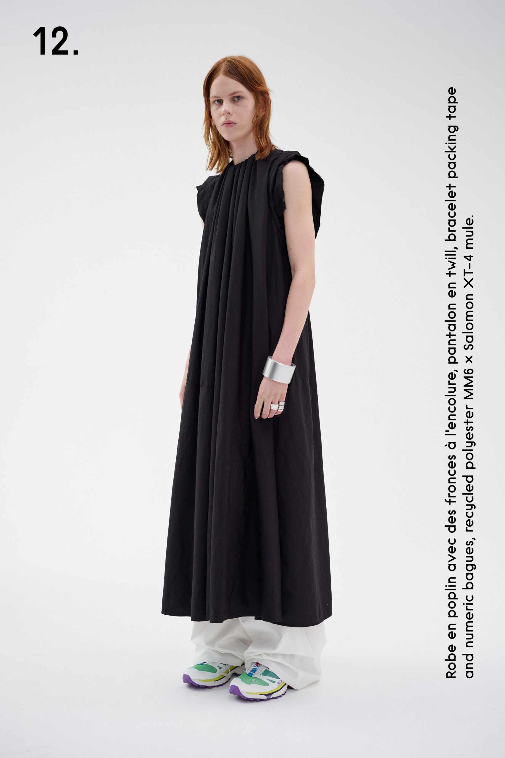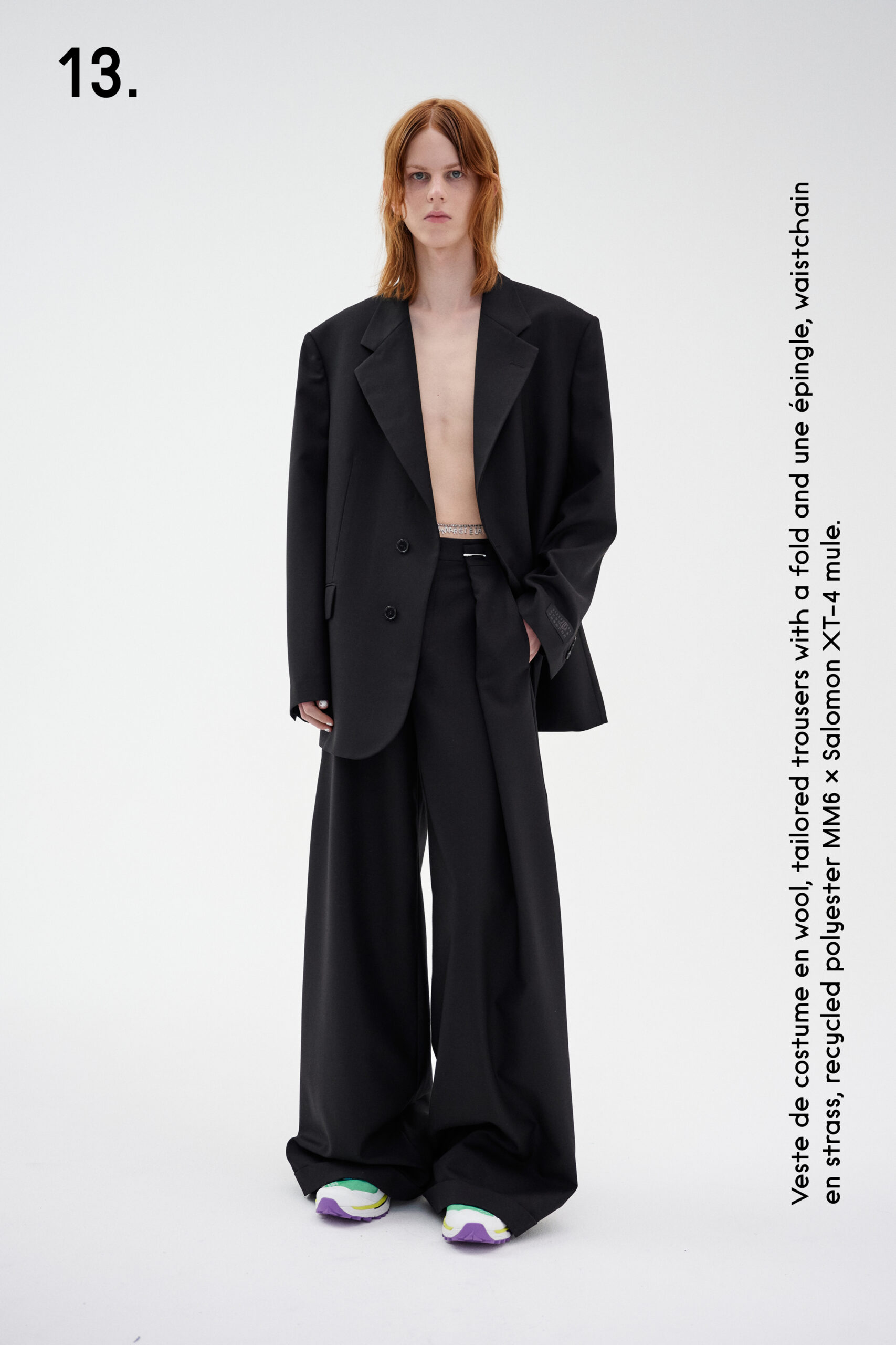 The AVP SS24 lookbook seeks to offer a series of dynamic and malleable propositions for the client. Shooting and styling happen simultaneously to create images that are suitably open-ended. Looks are composed on a single model with a subtle attitude, laying bare the transformative power of clothing. Garments and accessories are combined in unexpected ways – Salomon x MM6 mules with tailoring and dresses, a gathered ankle dress over wide-legged trousers – flashes of turquoise and silver radiate from the otherwise monochromatic palette. Every piece is genderless, after all, MM6 is designed to emphasise the personality of the wearer, not overpower them. These garments leave space for self-expression, they are an invitation to partake in the artistic process – a work in progress.