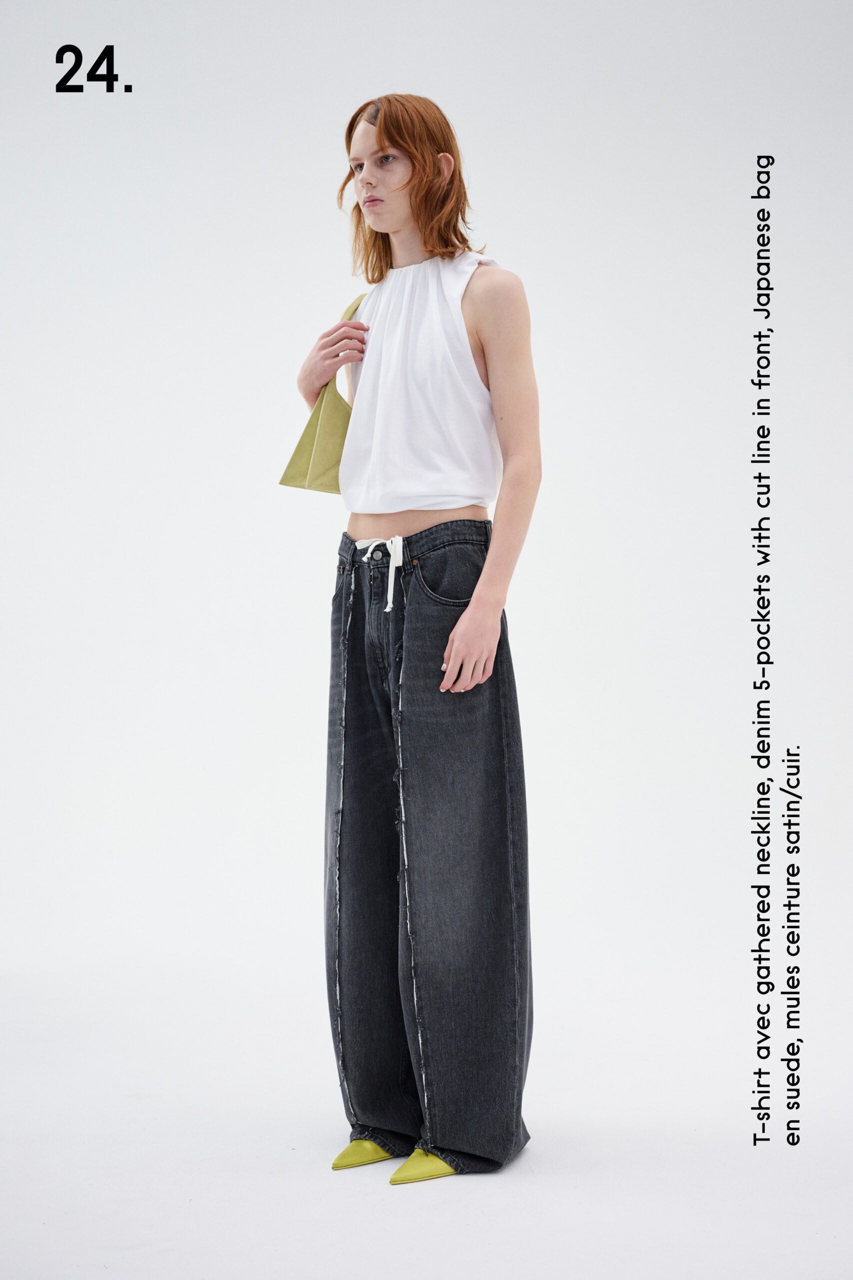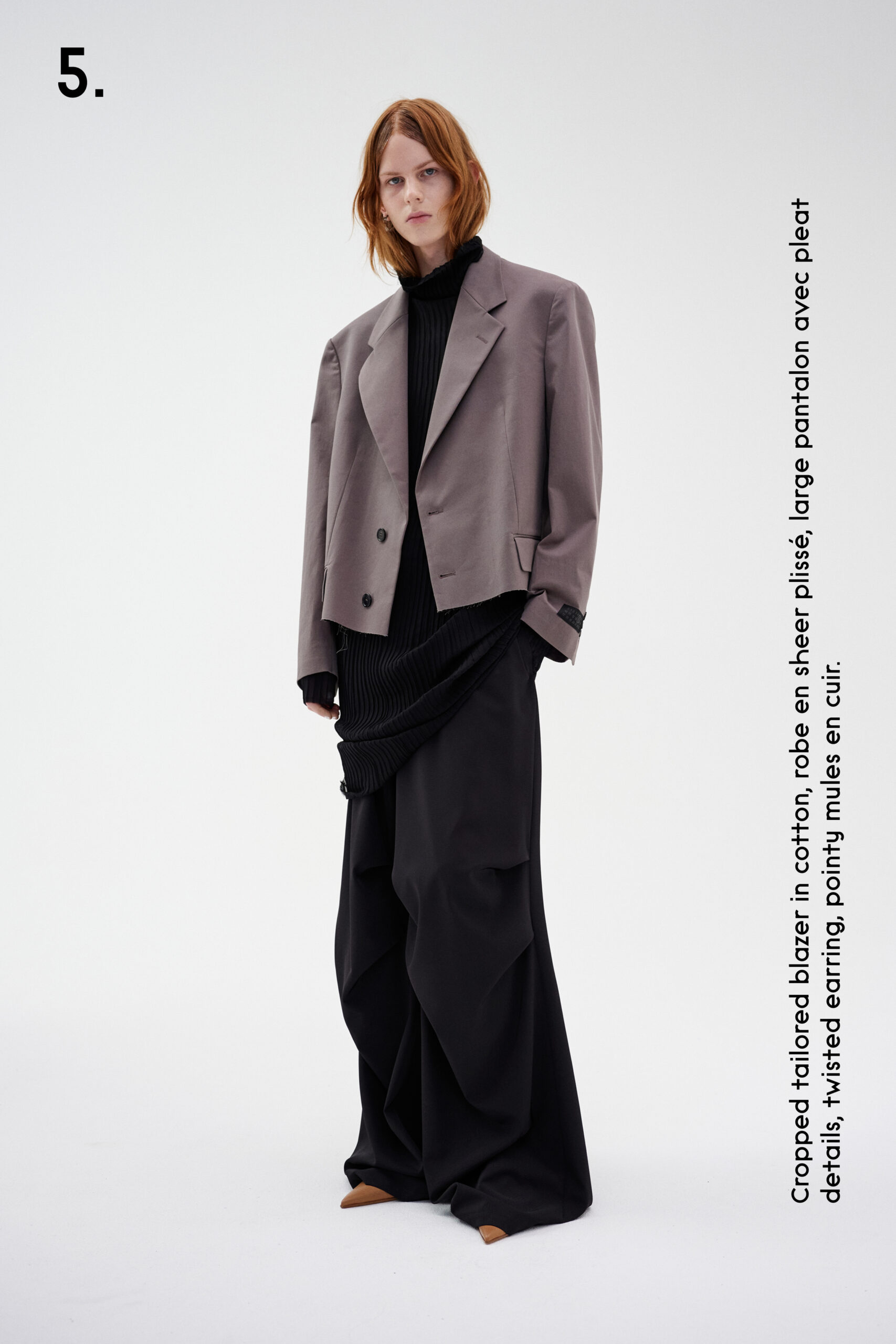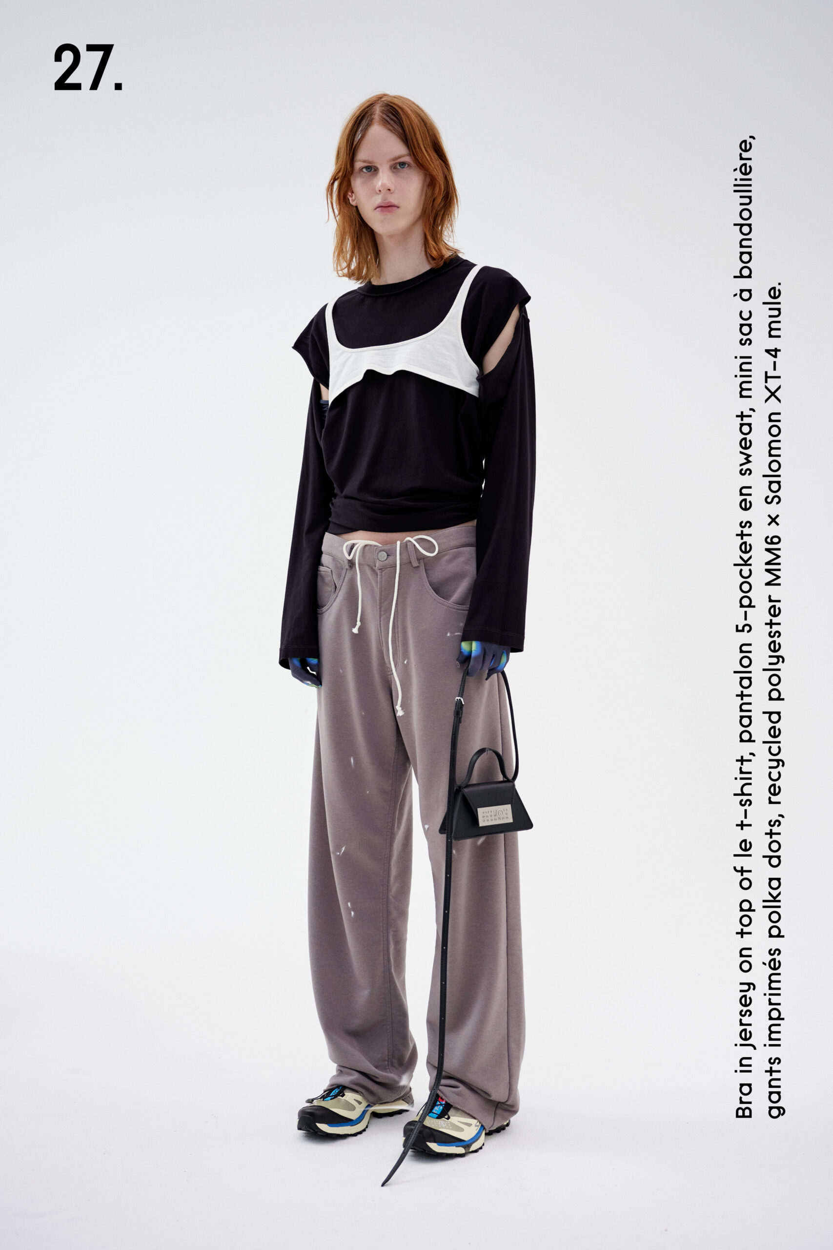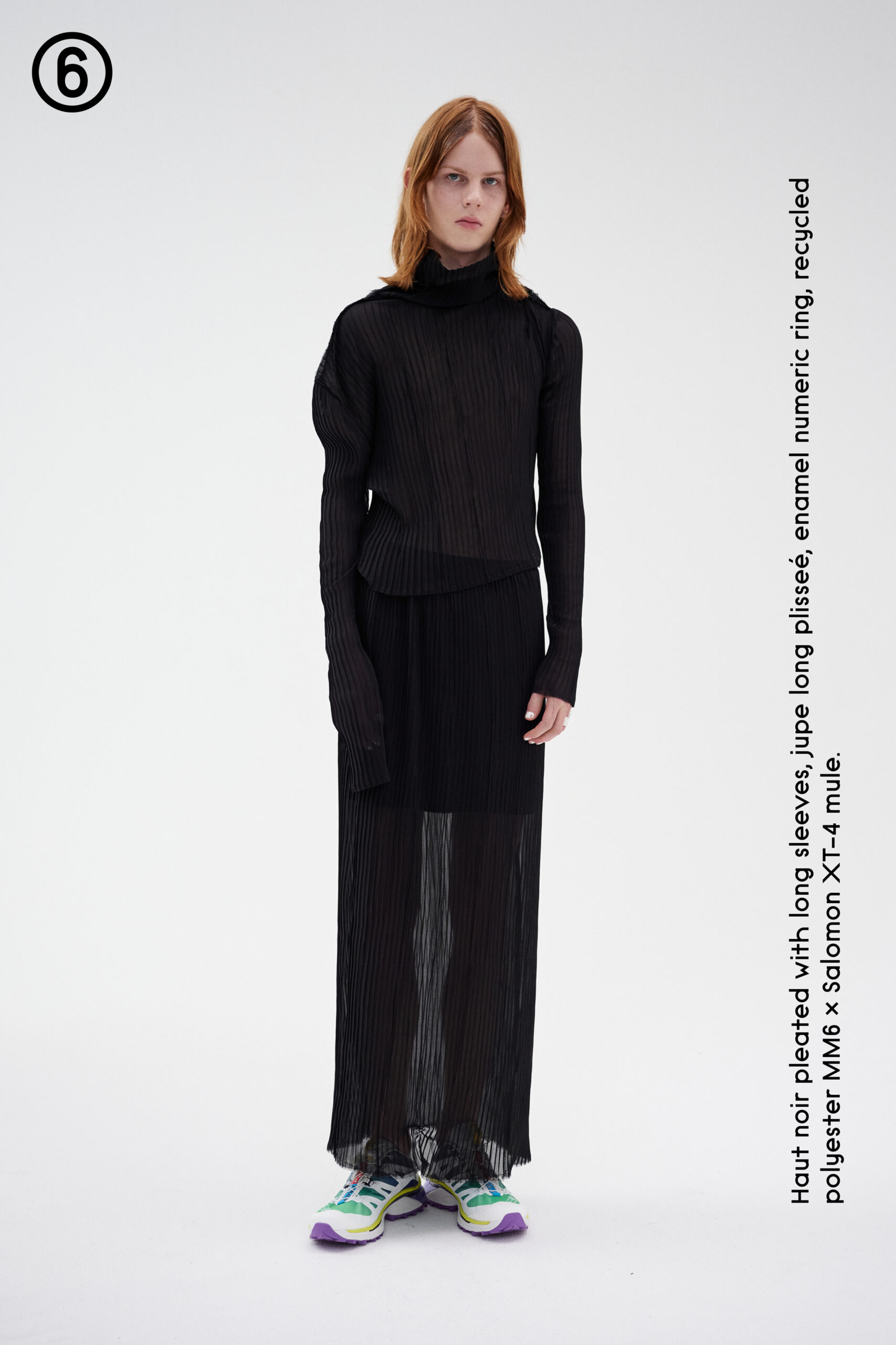 The AVP SS24 lookbook seeks to offer a series of dynamic and malleable propositions for the client. Shooting and styling happen simultaneously to create images that are suitably open-ended. Looks are composed on a single model with a subtle attitude, laying bare the transformative power of clothing. Garments and accessories are combined in unexpected ways – Salomon x MM6 mules with tailoring and dresses, a gathered ankle dress over wide-legged trousers – flashes of turquoise and silver radiate from the otherwise monochromatic palette. Every piece is genderless, after all, MM6 is designed to emphasise the personality of the wearer, not overpower them. These garments leave space for self-expression, they are an invitation to partake in the artistic process – a work in progress.