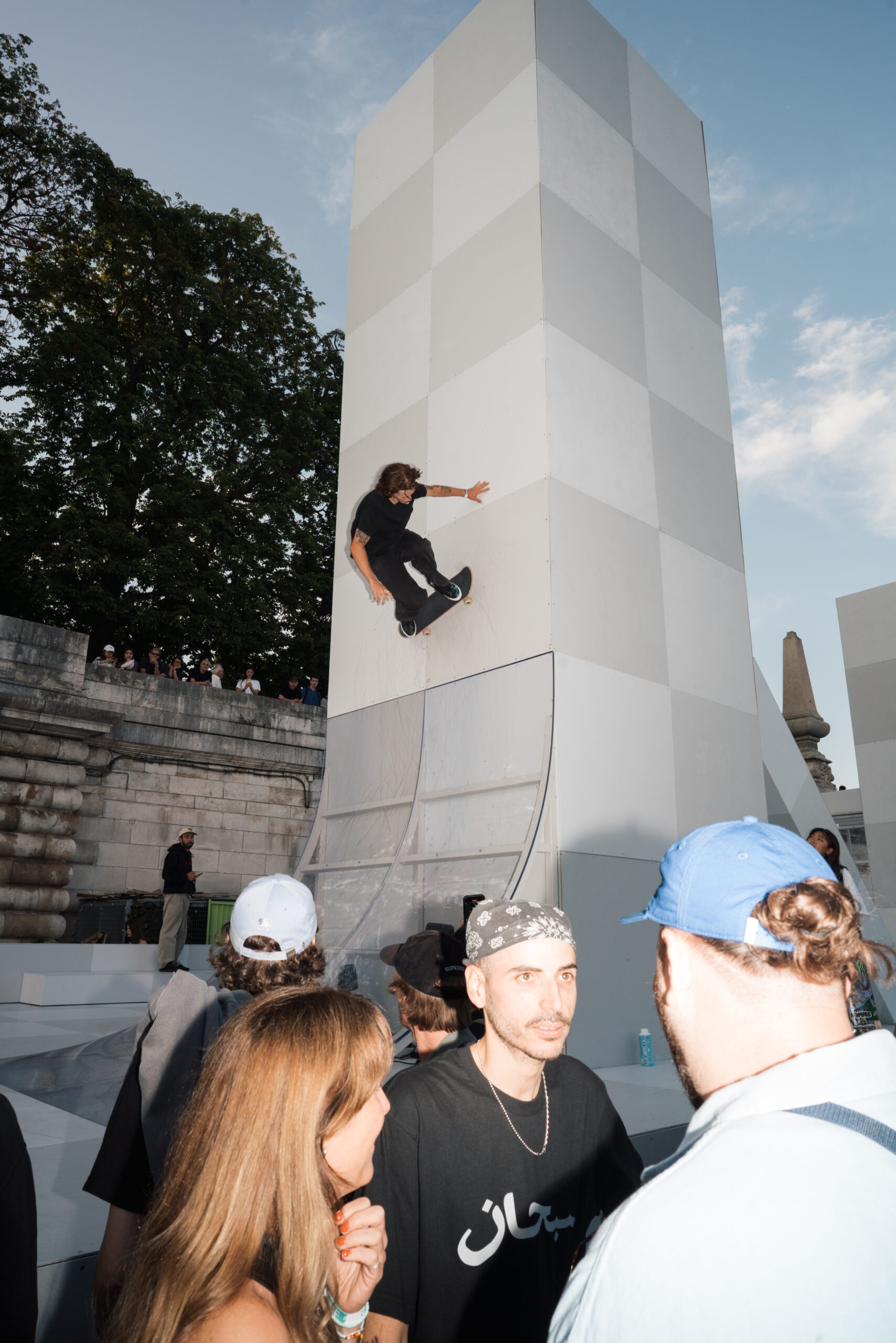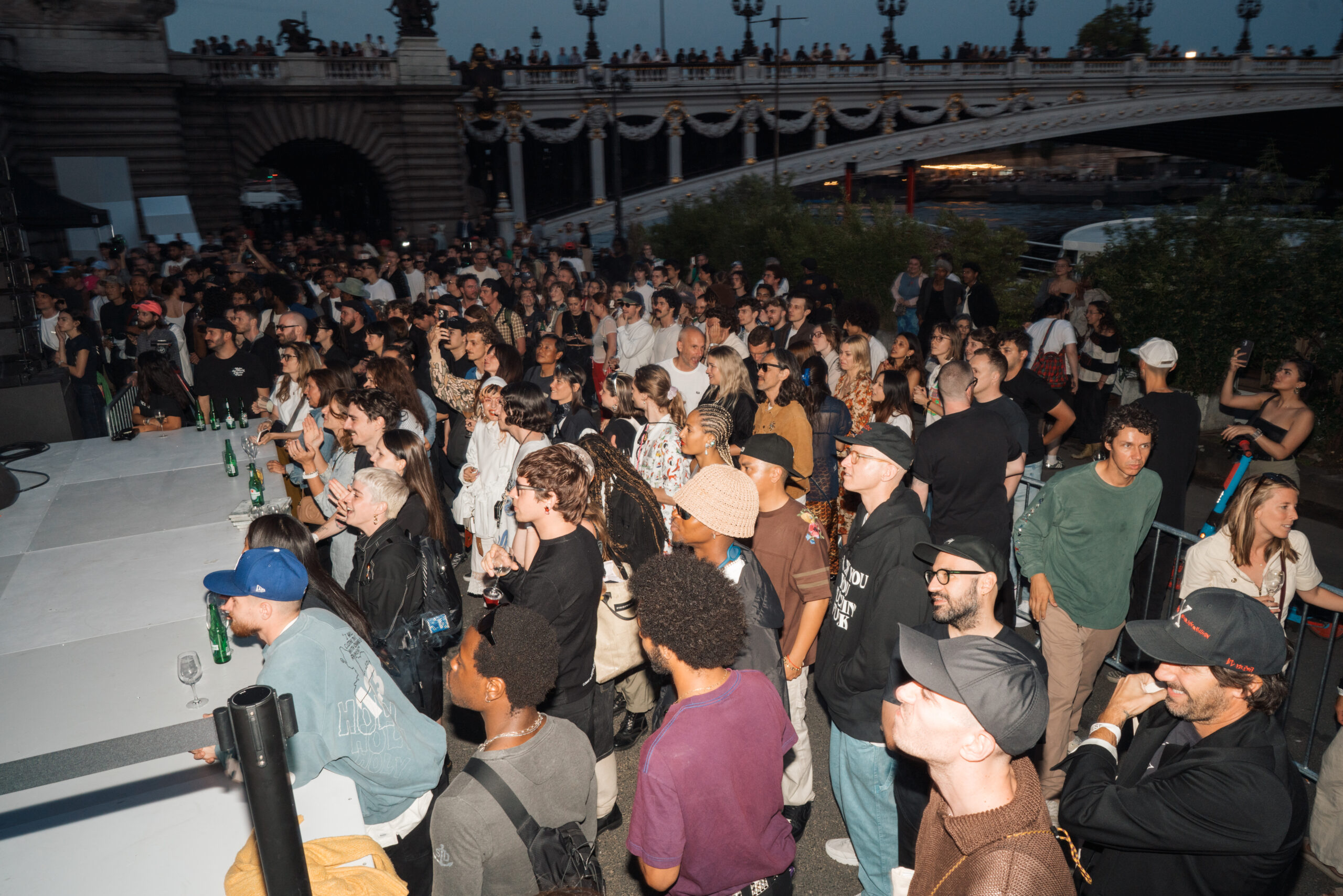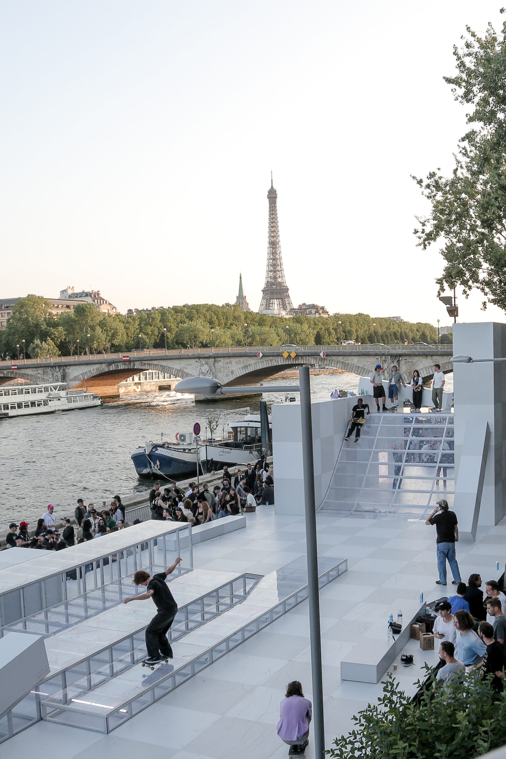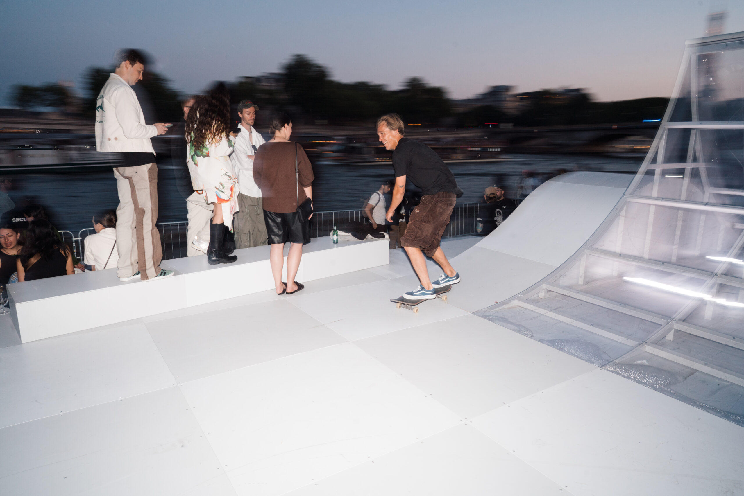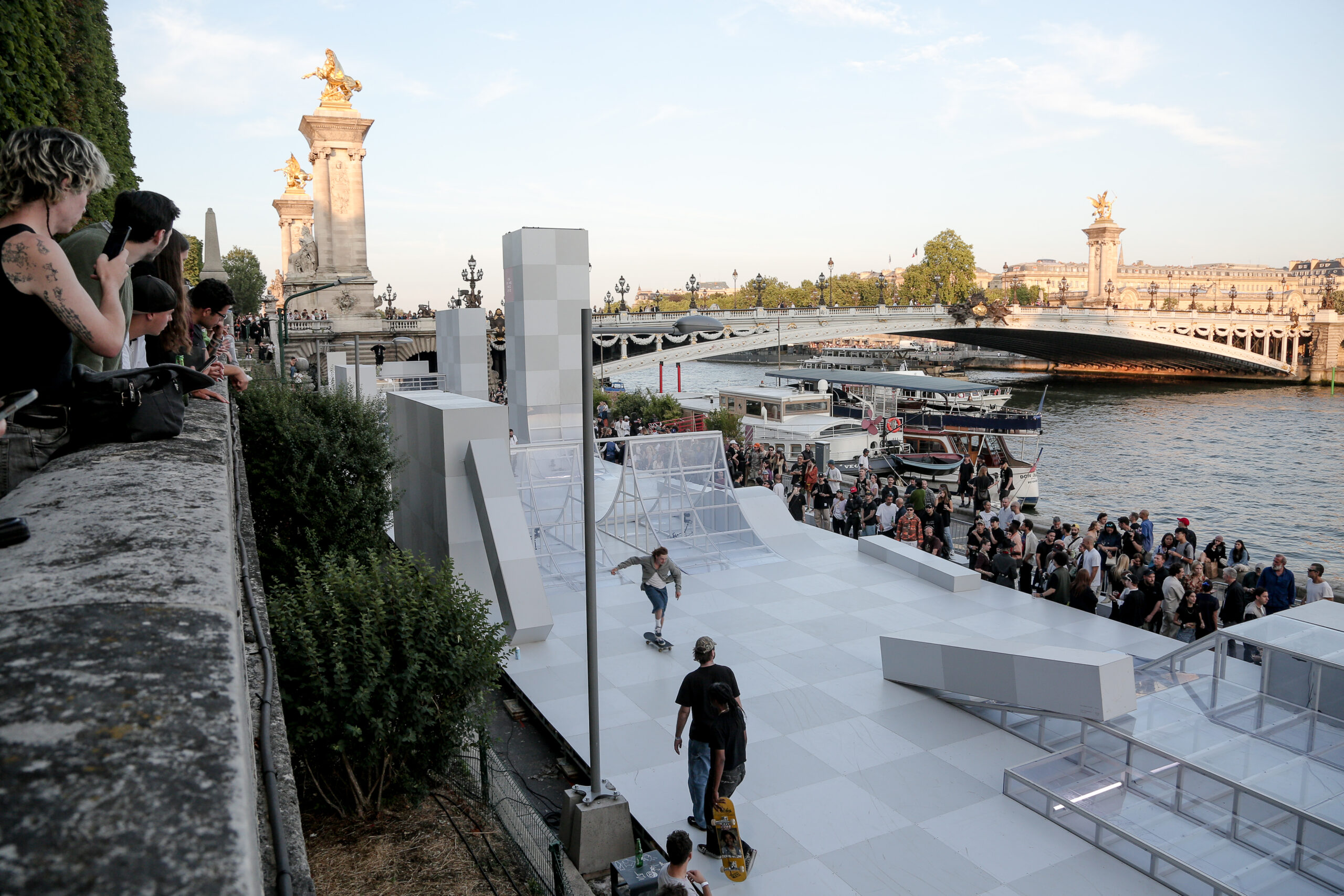 As the sun began to set, the style and skateboarding communities descended upon the banks of the Seine at Pont Alexandre III to witness a monumental skate installation—created in partnership with Unitedfront, PLAYLAB, INC., and California Skateparks—and performance by King Krule.
