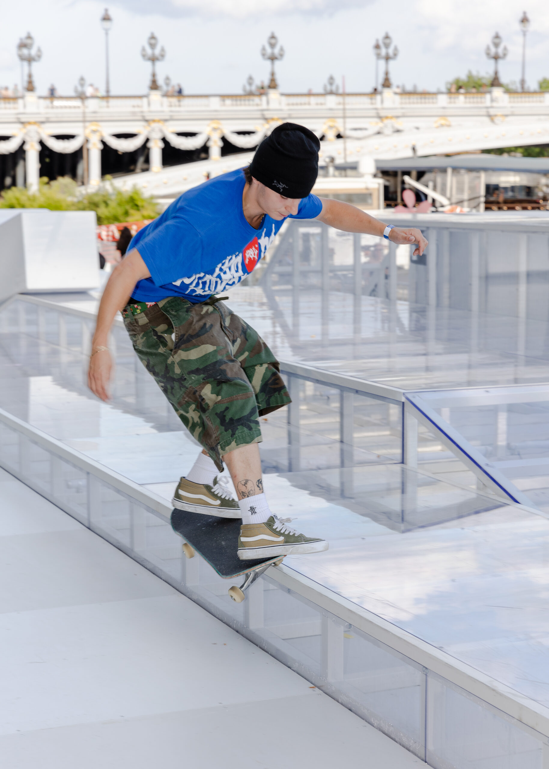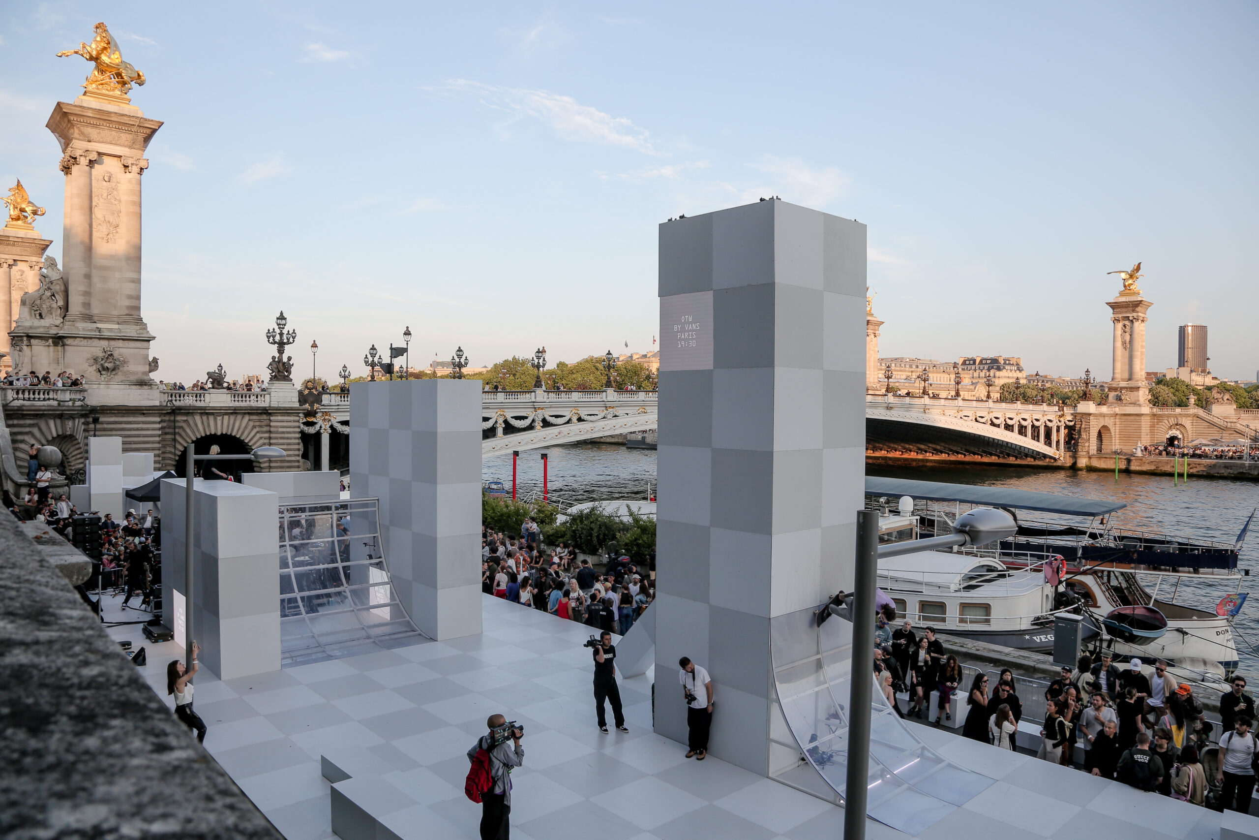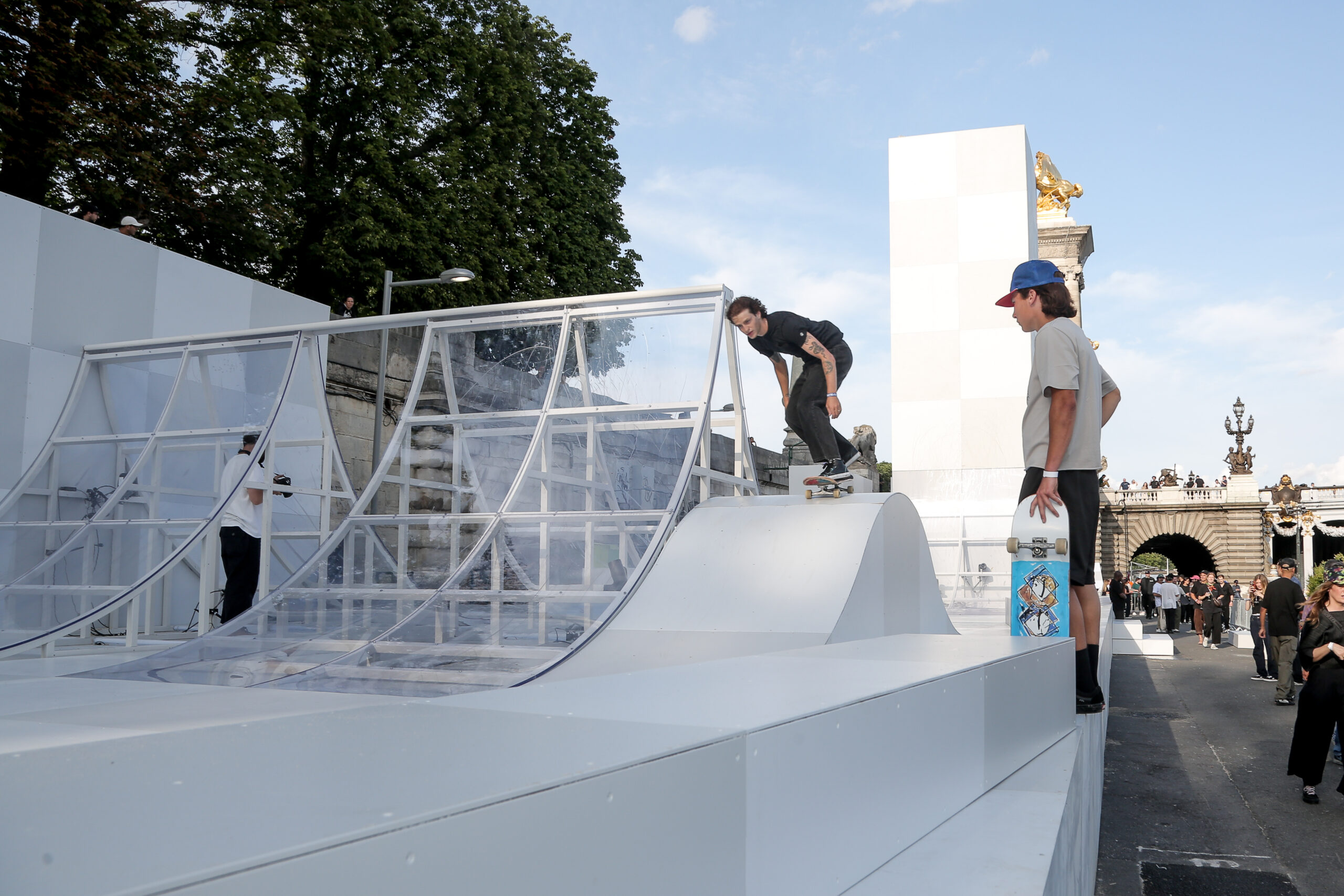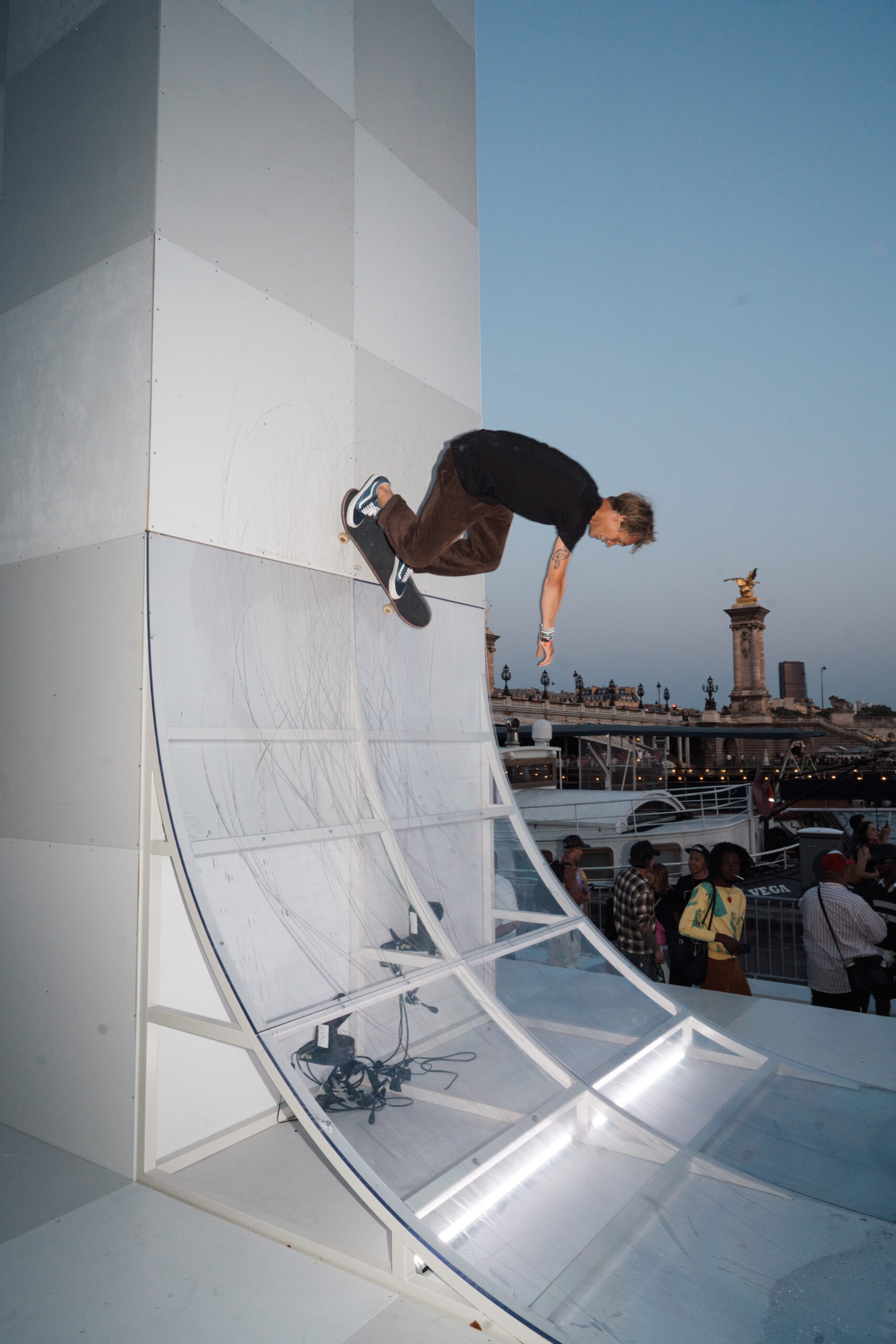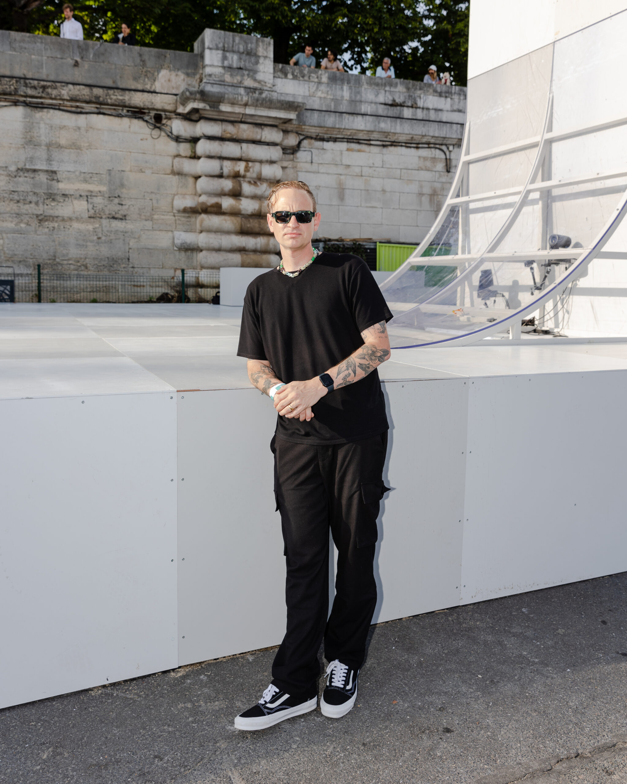 As the sun began to set, the style and skateboarding communities descended upon the banks of the Seine at Pont Alexandre III to witness a monumental skate installation—created in partnership with Unitedfront, PLAYLAB, INC., and California Skateparks—and performance by King Krule.