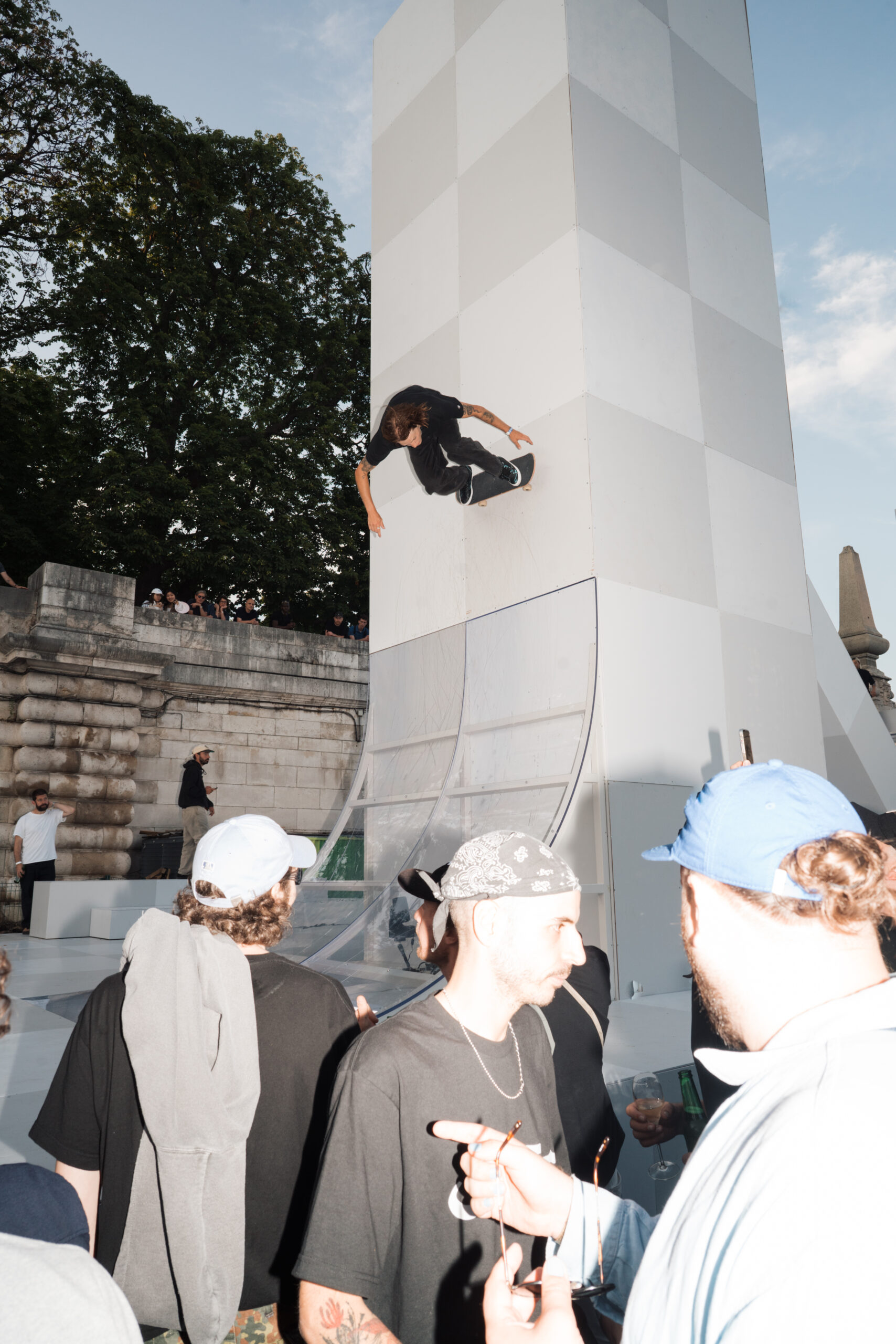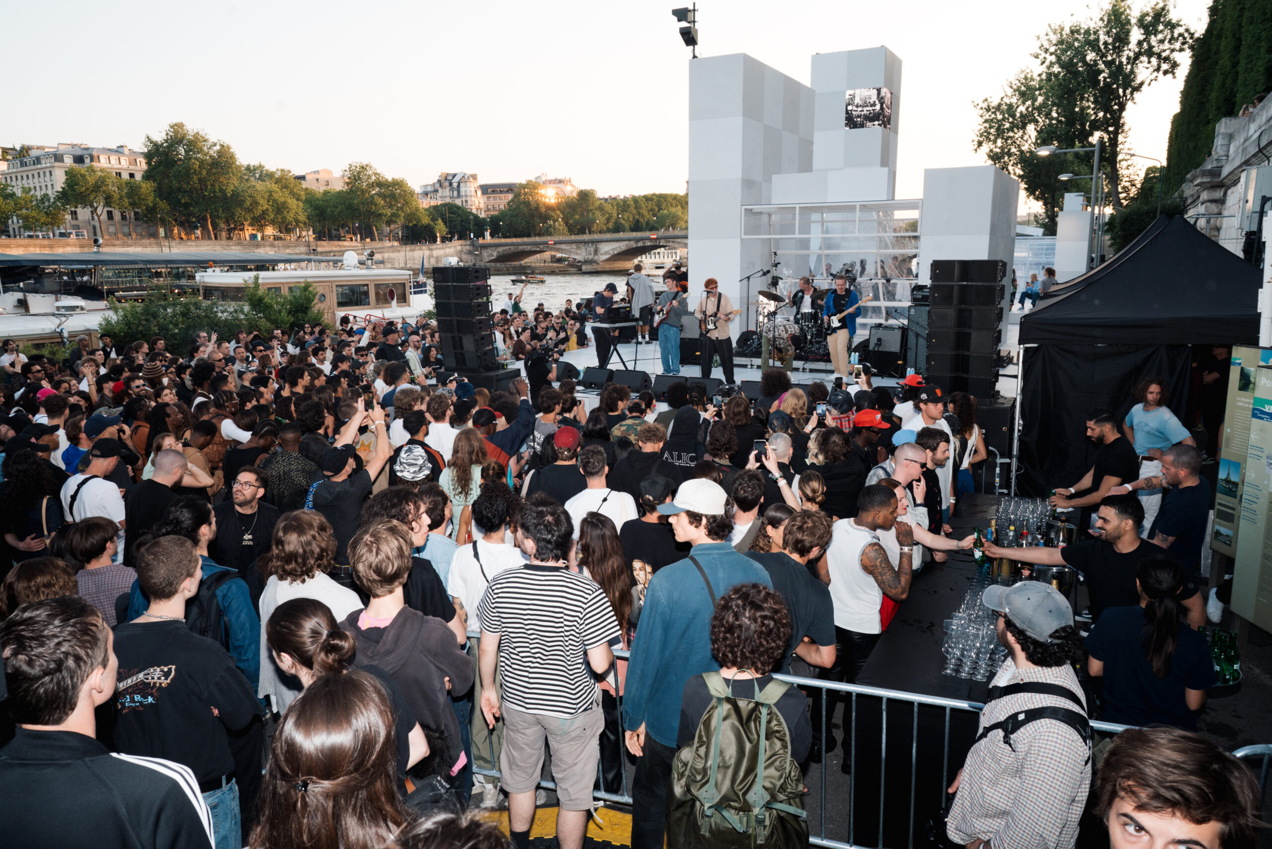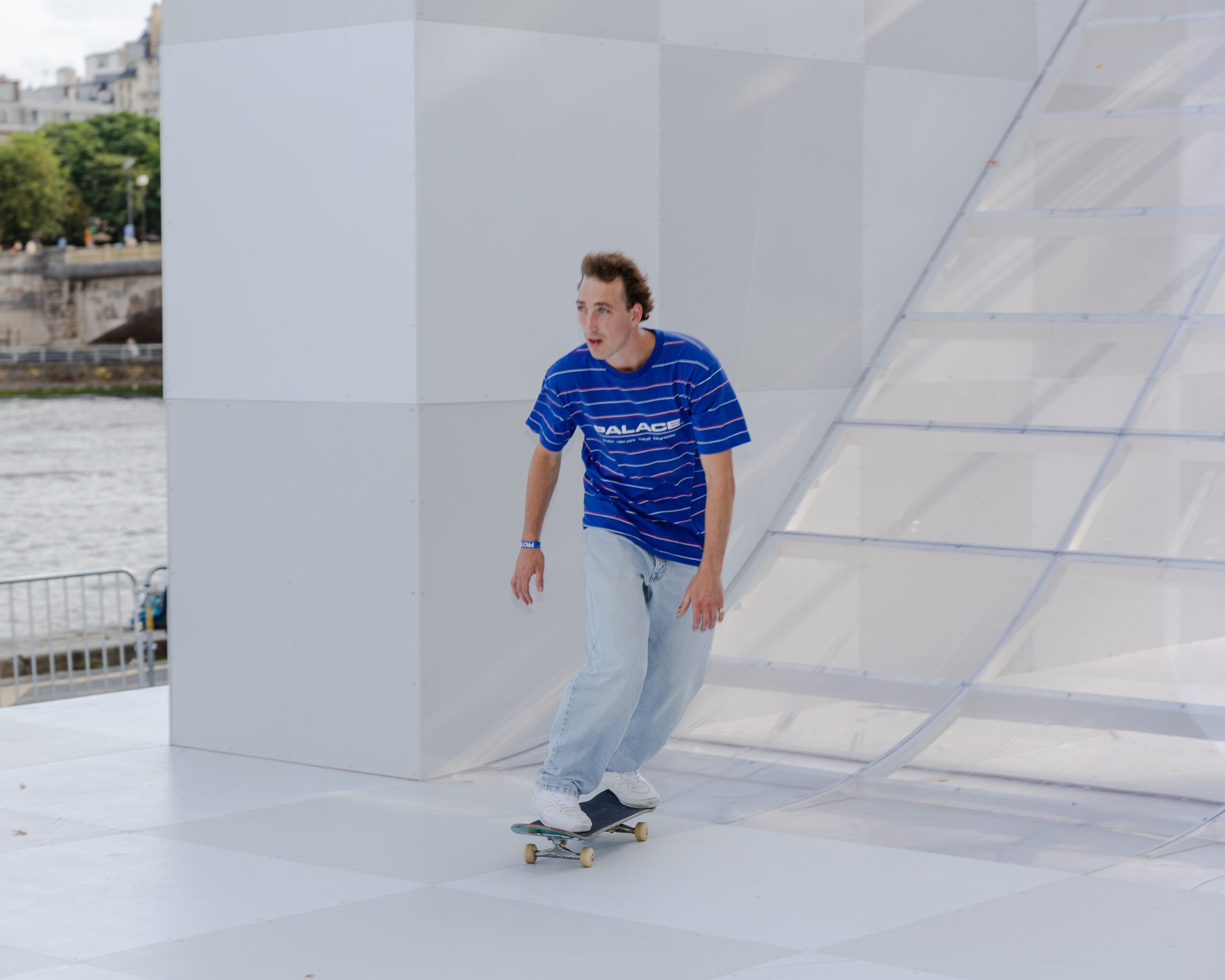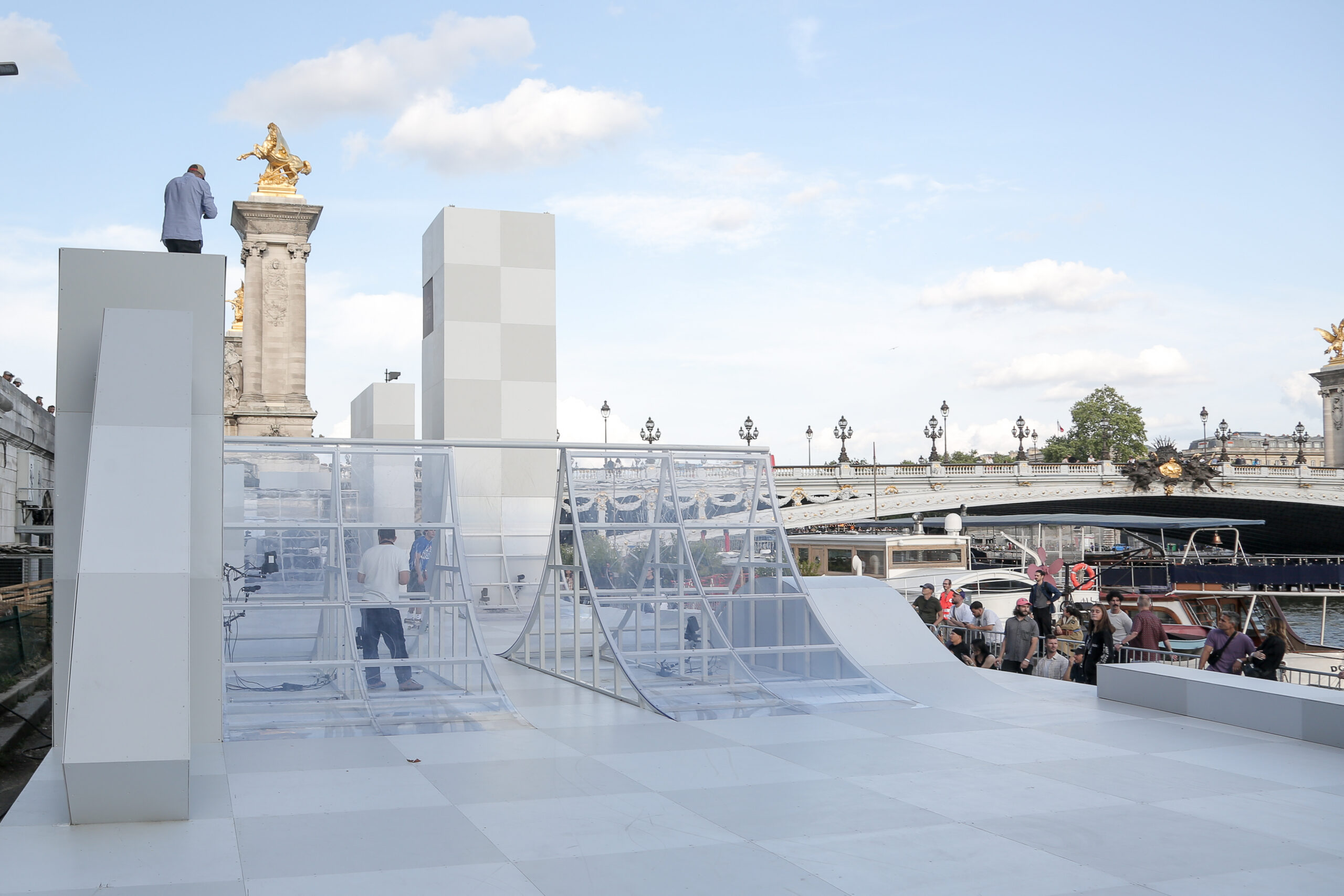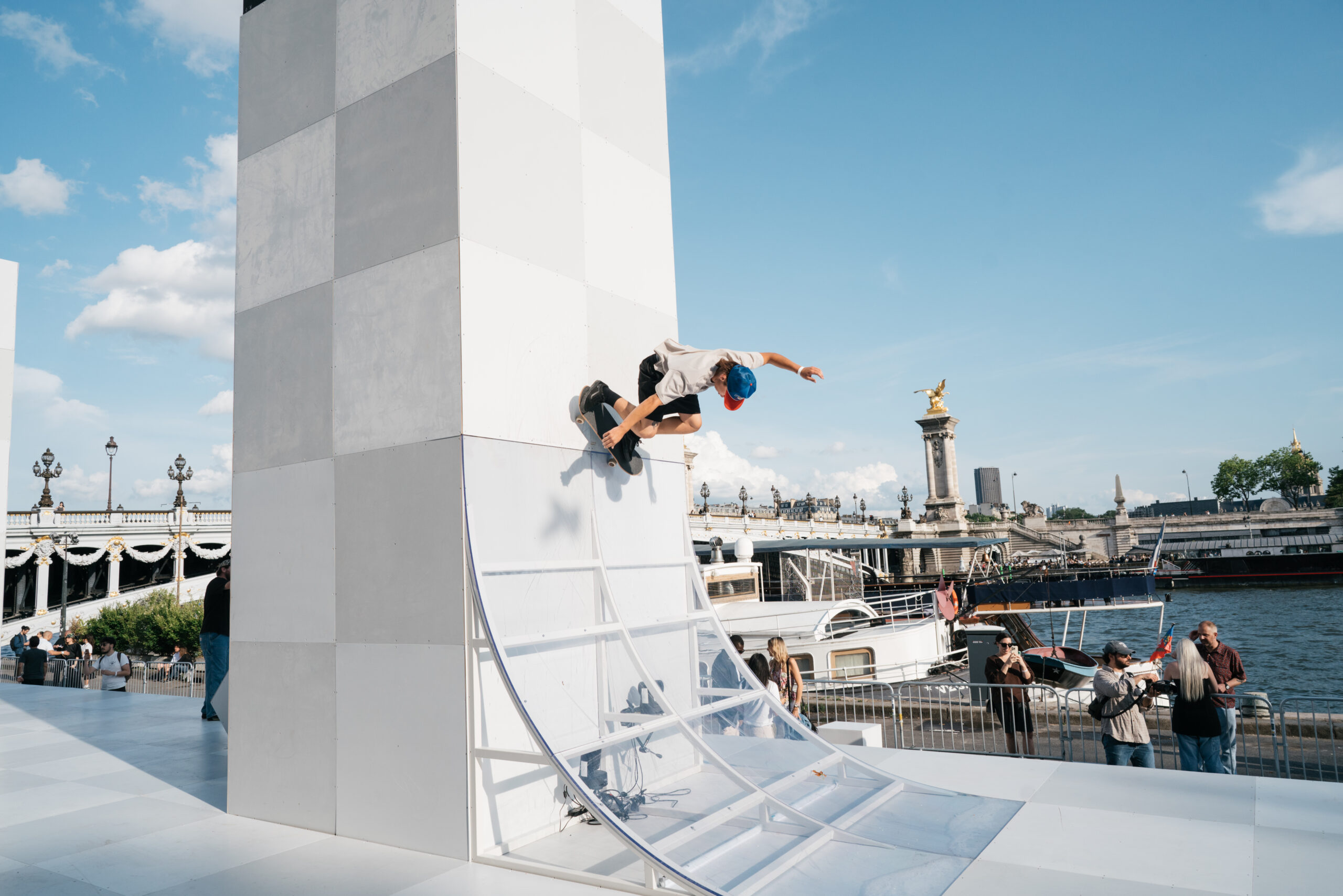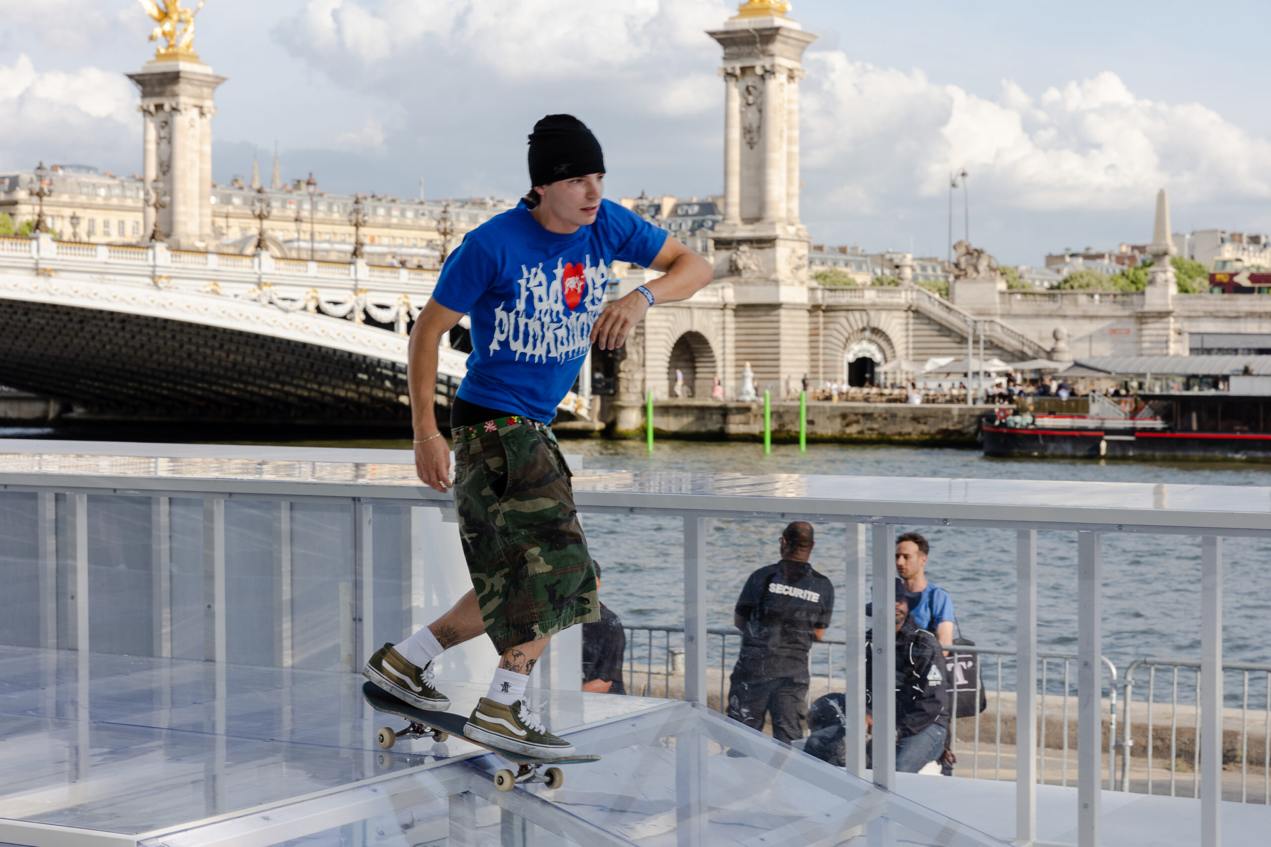 As the sun began to set, the style and skateboarding communities descended upon the banks of the Seine at Pont Alexandre III to witness a monumental skate installation—created in partnership with Unitedfront, PLAYLAB, INC., and California Skateparks—and performance by King Krule.