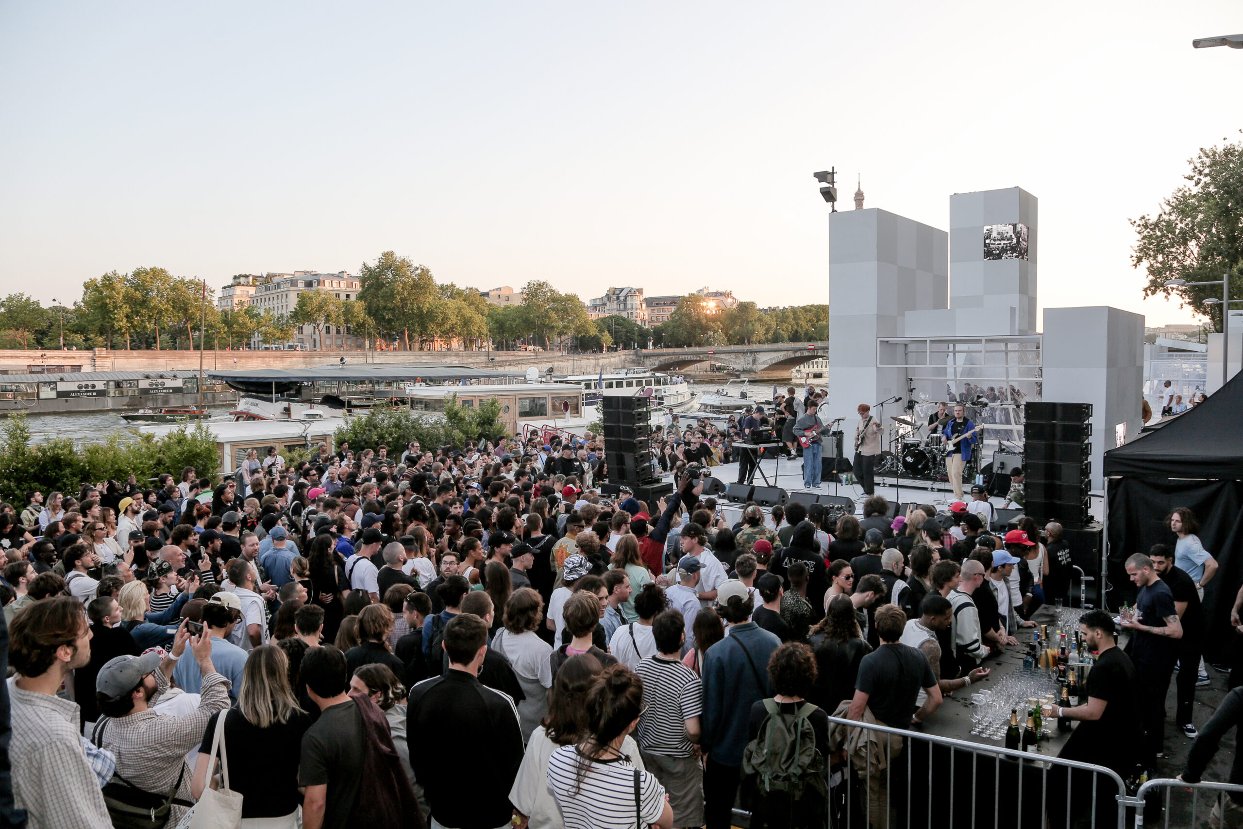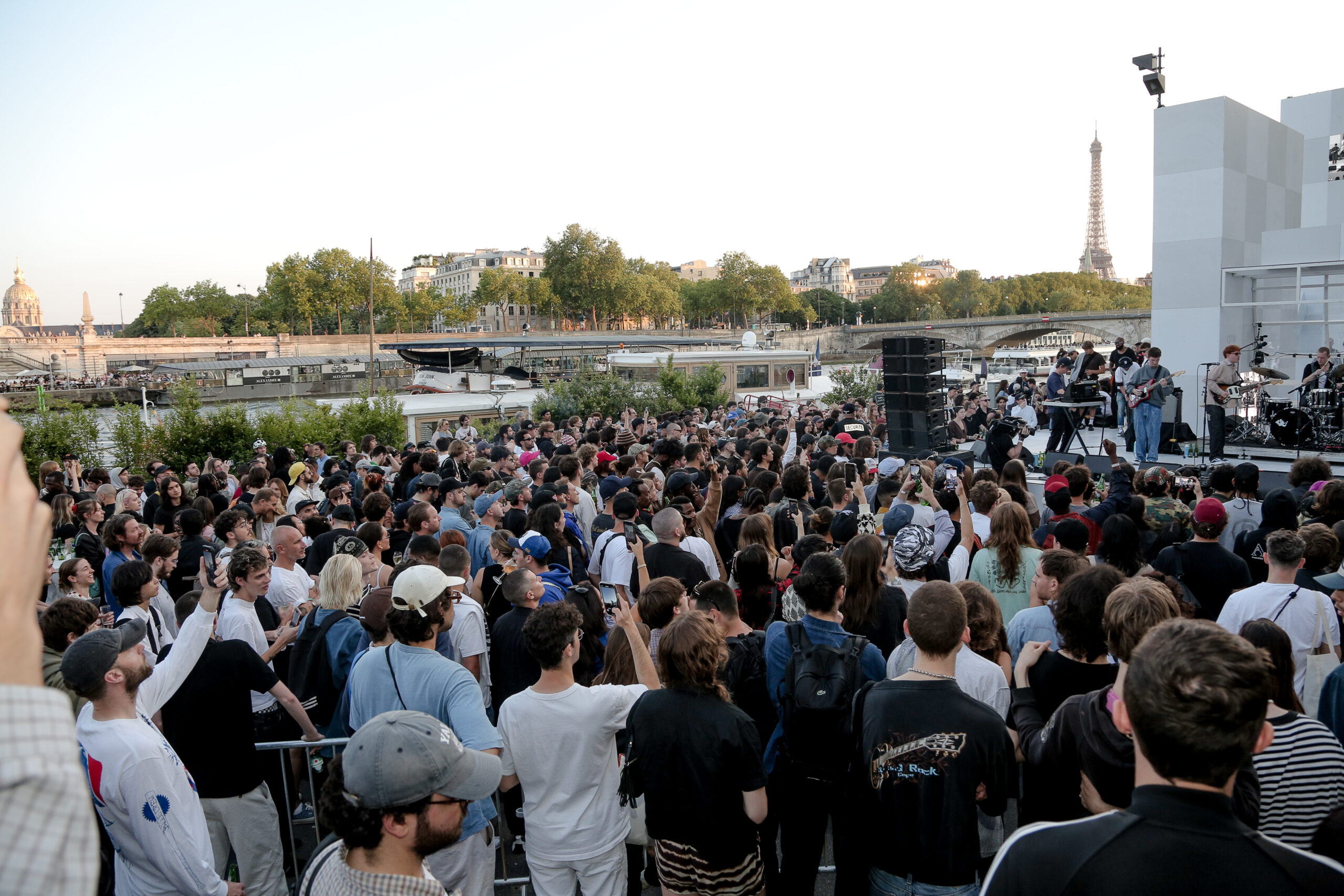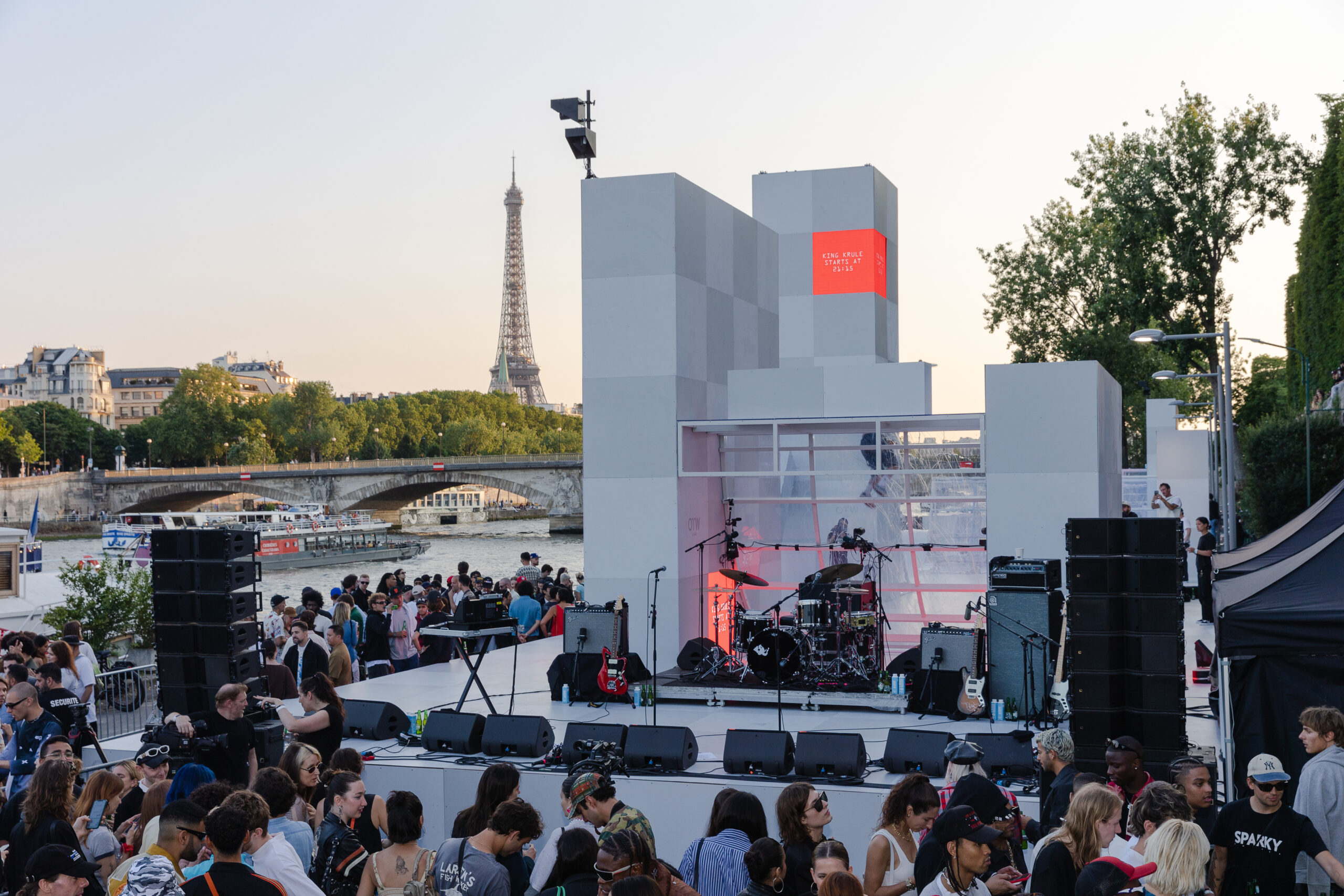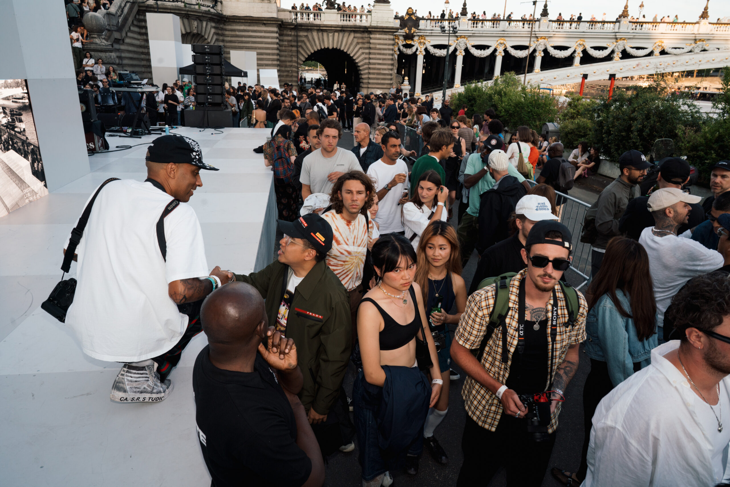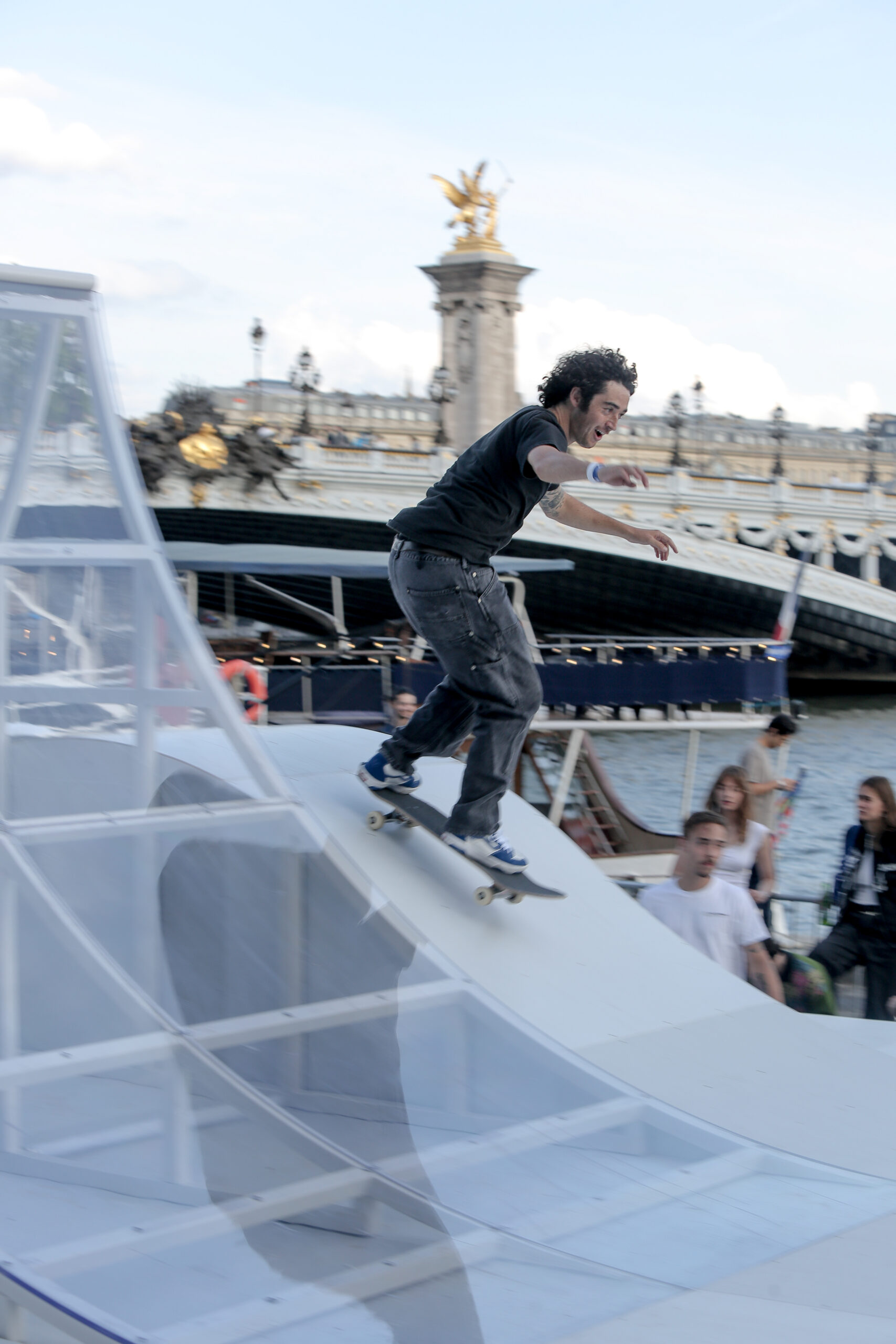 As the sun began to set, the style and skateboarding communities descended upon the banks of the Seine at Pont Alexandre III to witness a monumental skate installation—created in partnership with Unitedfront, PLAYLAB, INC., and California Skateparks—and performance by King Krule.